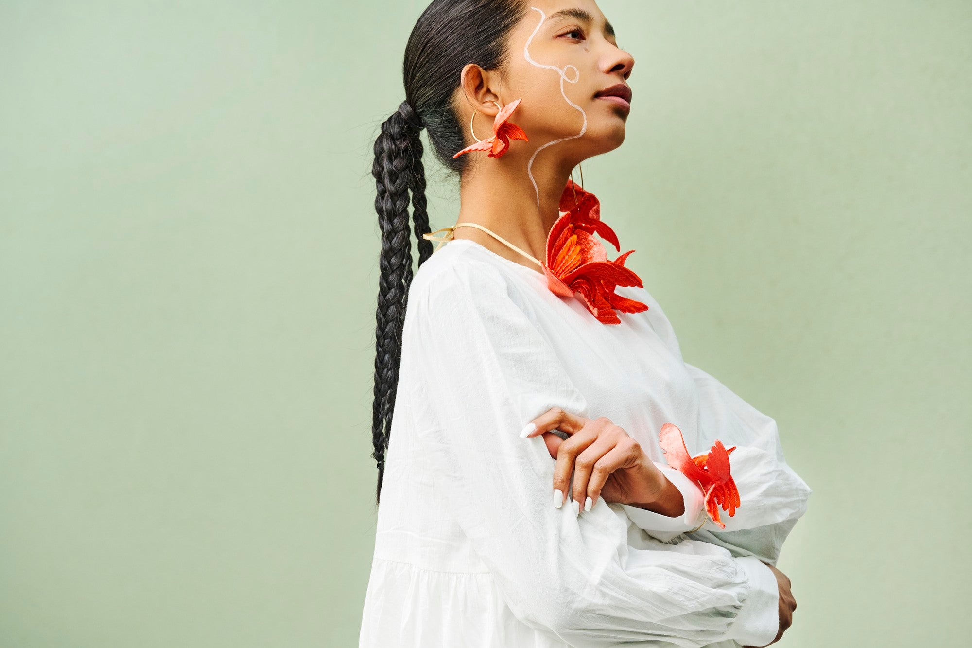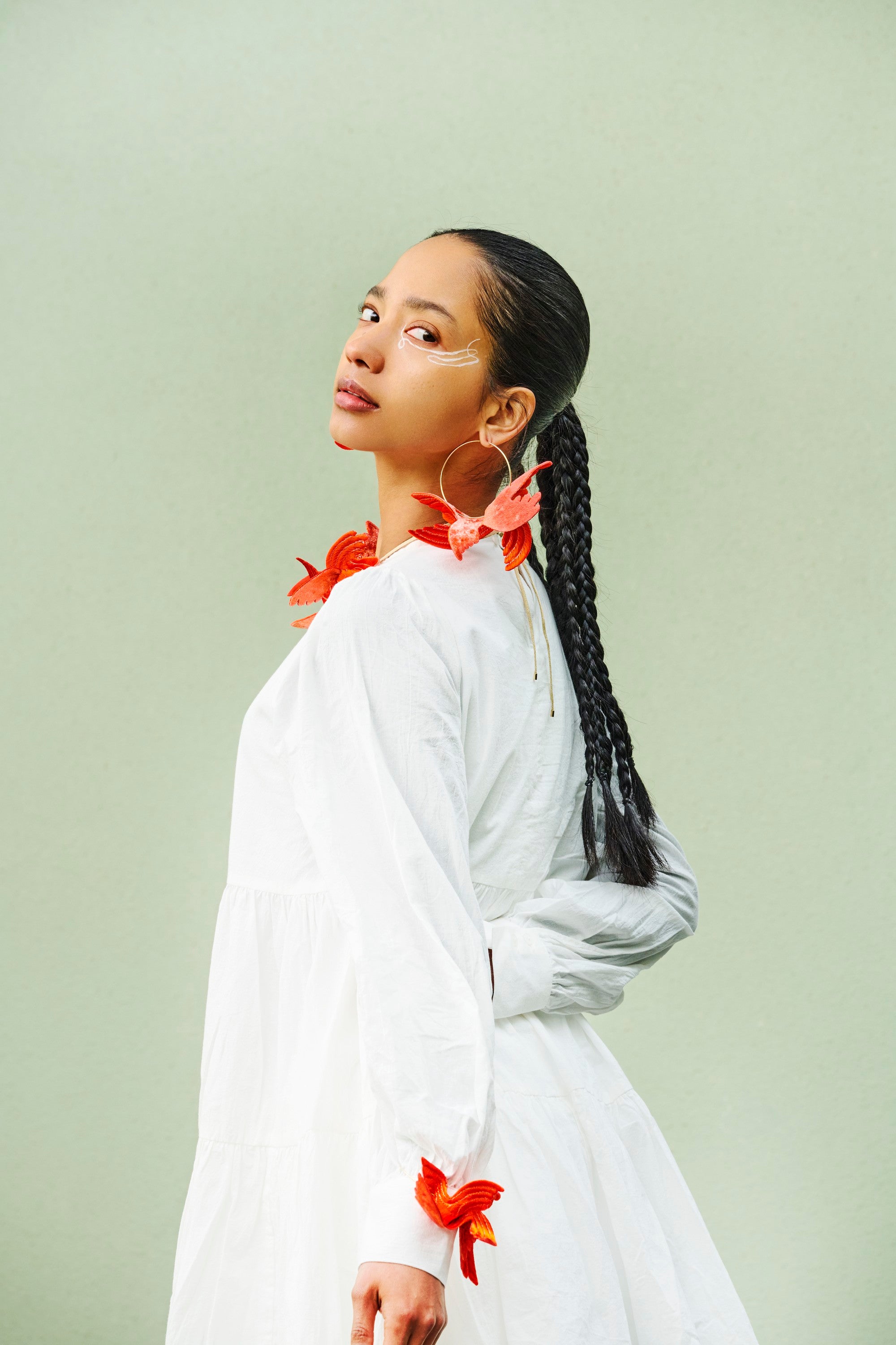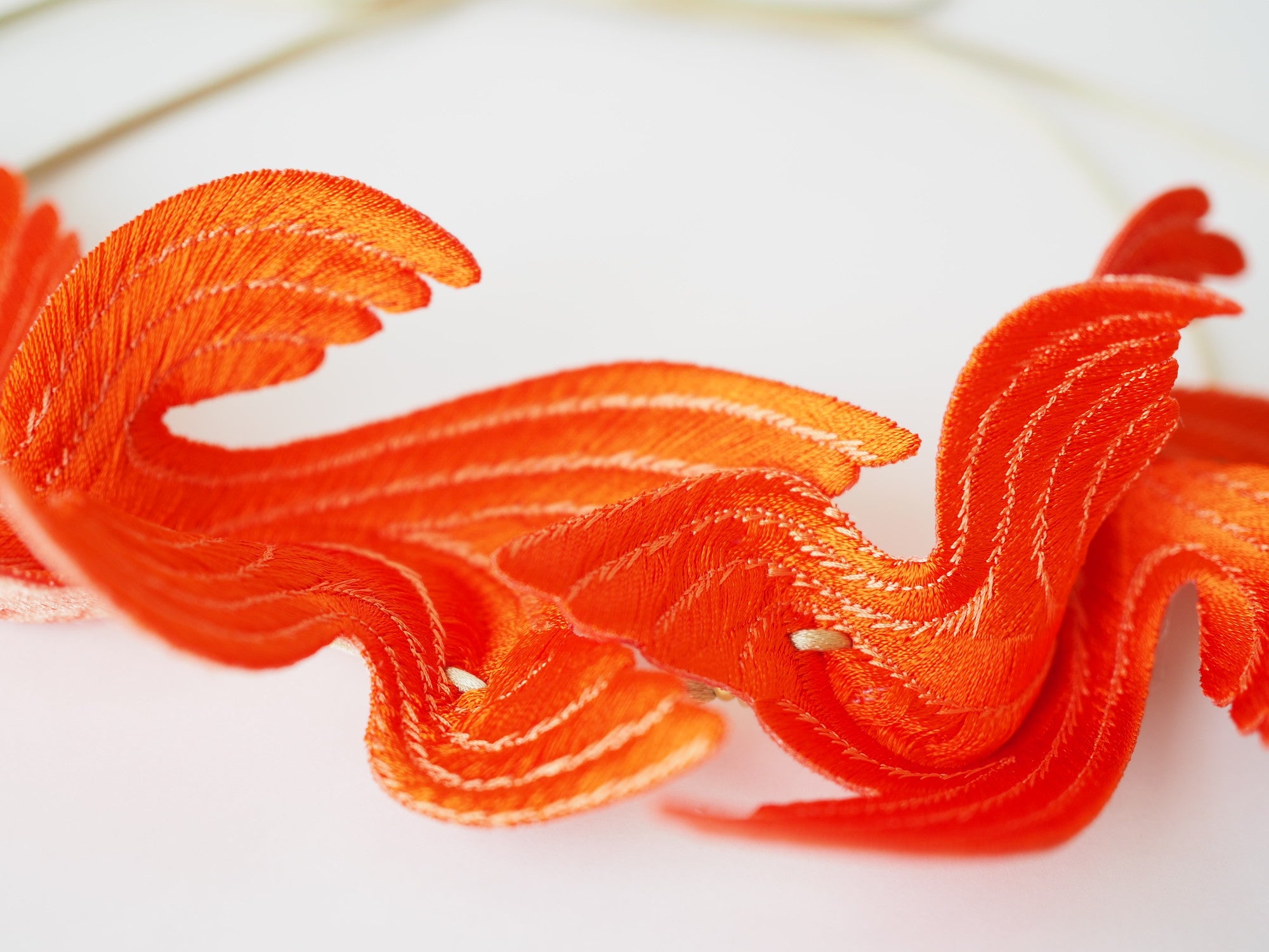 Designed to bring happiness to its wearers, this series of large, flamboyant bird motif accessories exudes elegance and charm. The dynamic design, achieved by adding folds to a single embroidered flat piece, creates a three-dimensional effect that mimics the graceful flight of a bird. The back side is made of velvet, providing a soft and gentle touch against the skin.