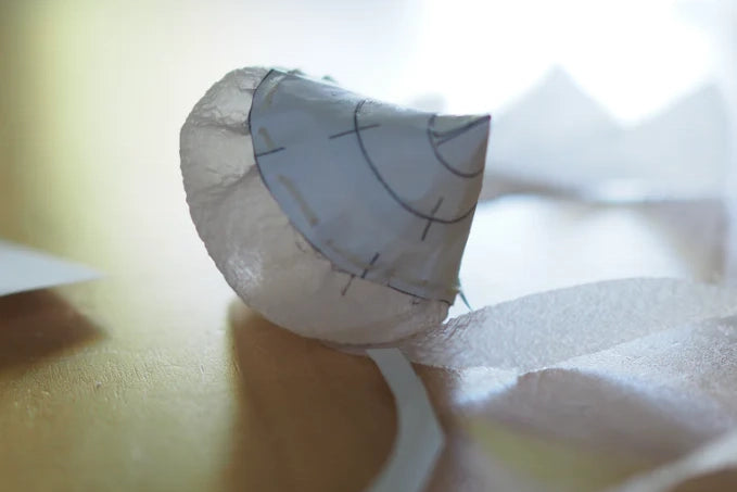 The design process at NANA WATANABE is derived from her experience as a fashion designer. It begins with manually crafting paper patterns, similar to papercraft, where patterns are added and materials are selected.