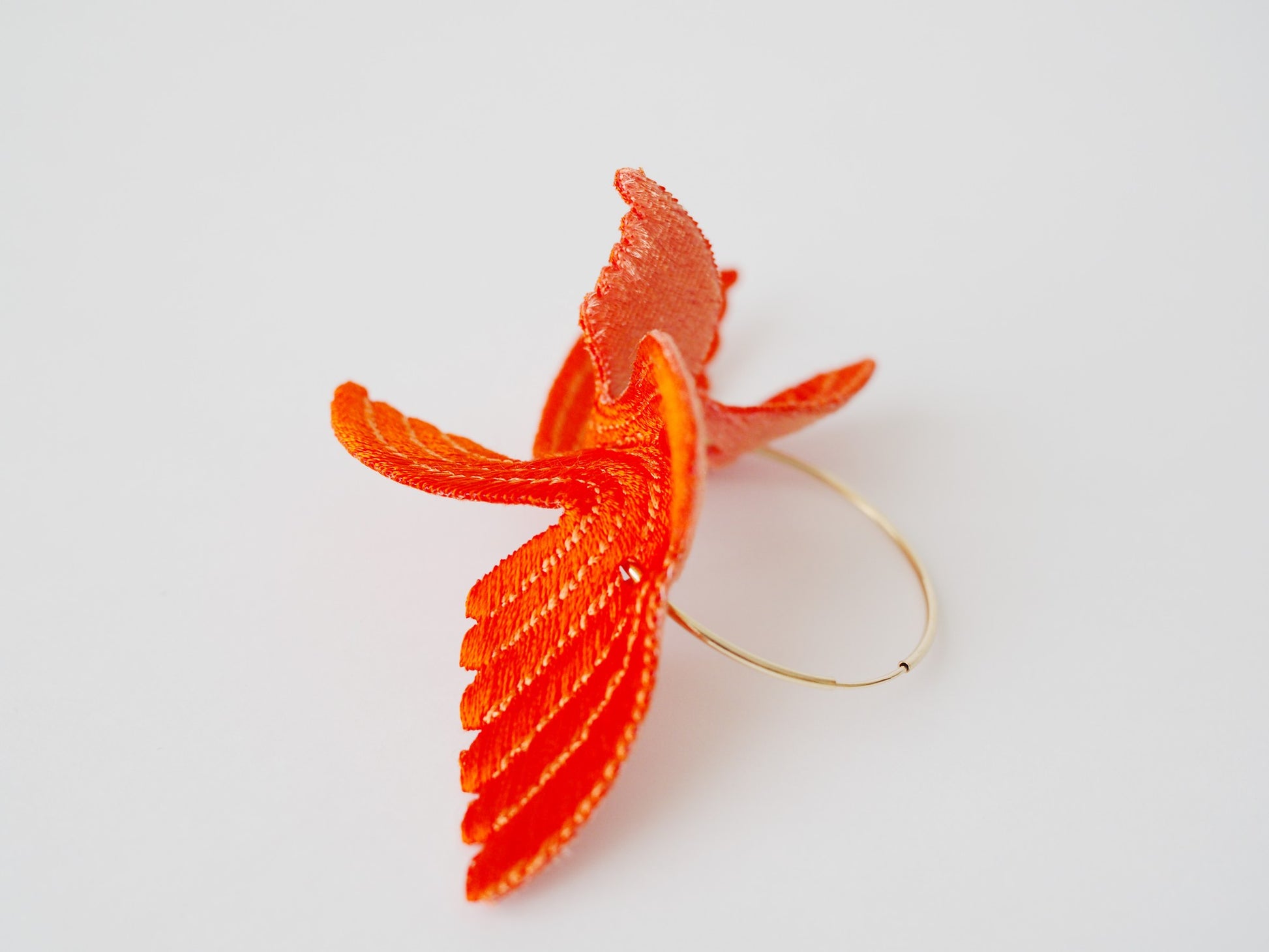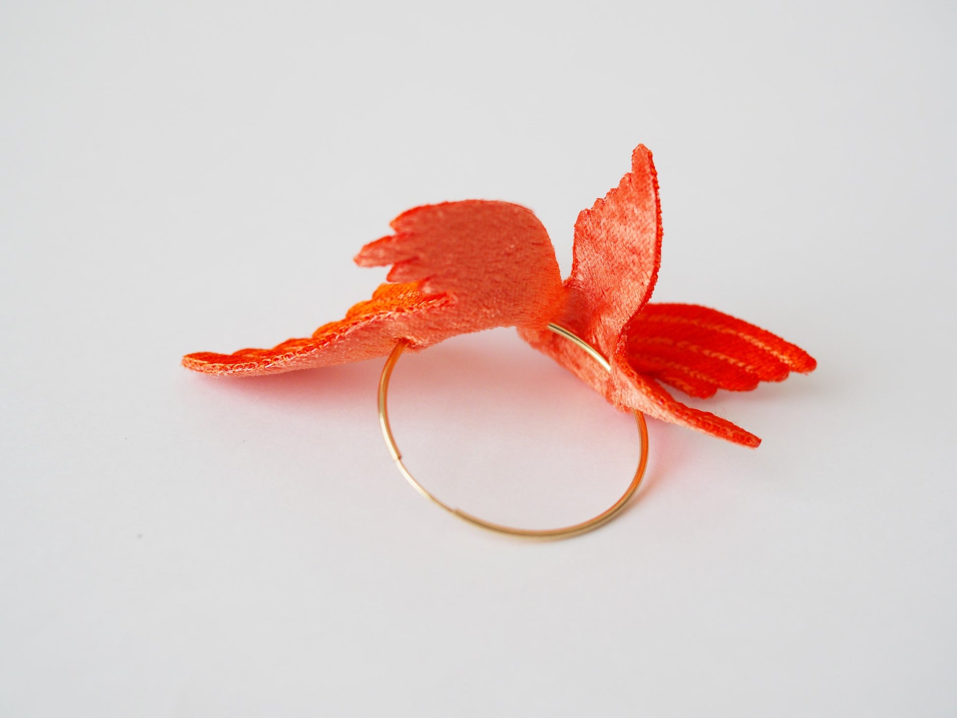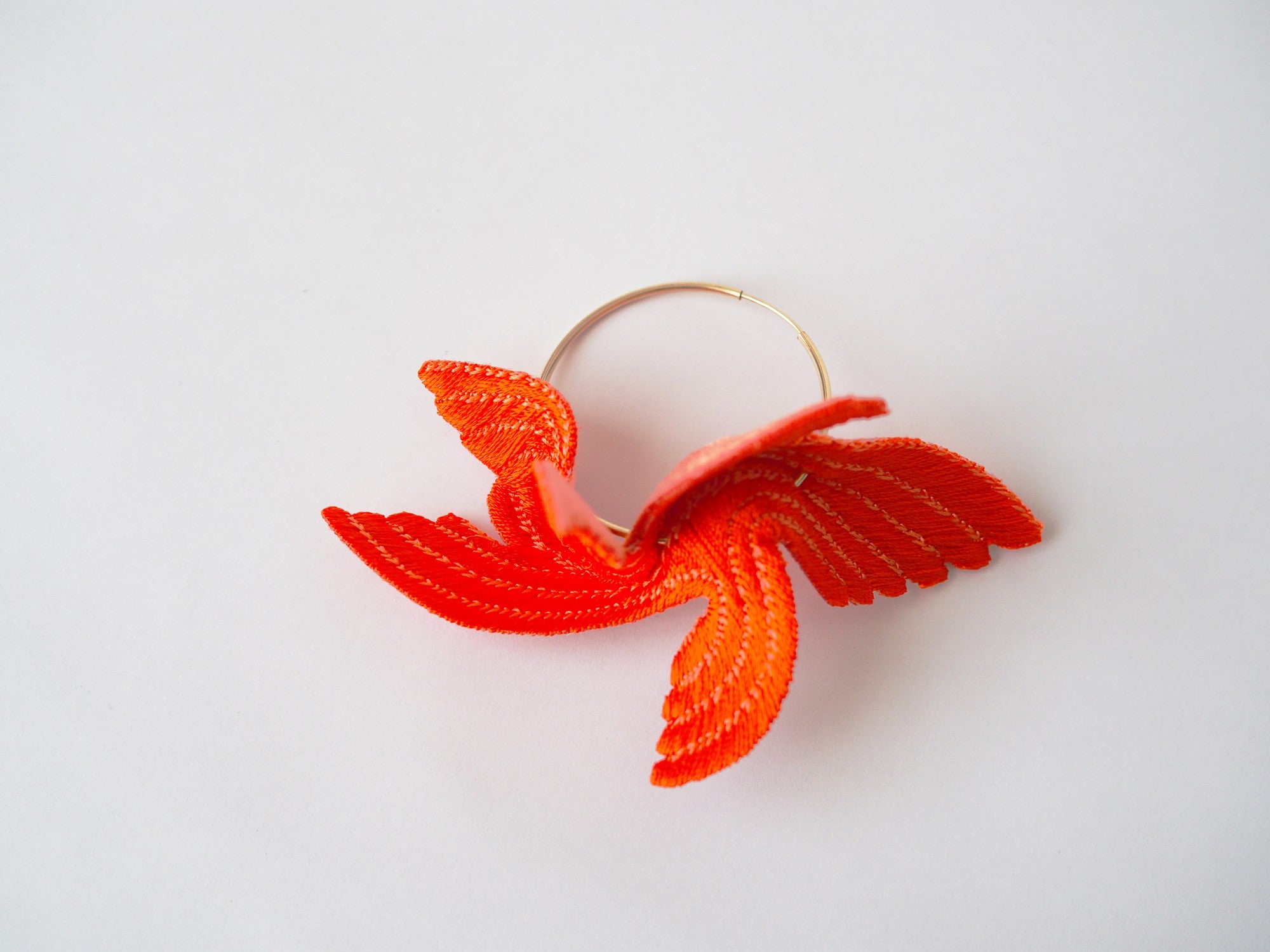 Designed to bring happiness to its wearers, this series of large, flamboyant bird motif accessories exudes elegance and charm. The dynamic design, achieved by adding folds to a single embroidered flat piece, creates a three-dimensional effect that mimics the graceful flight of a bird. The back side is made of velvet, providing a soft and gentle touch against the skin.