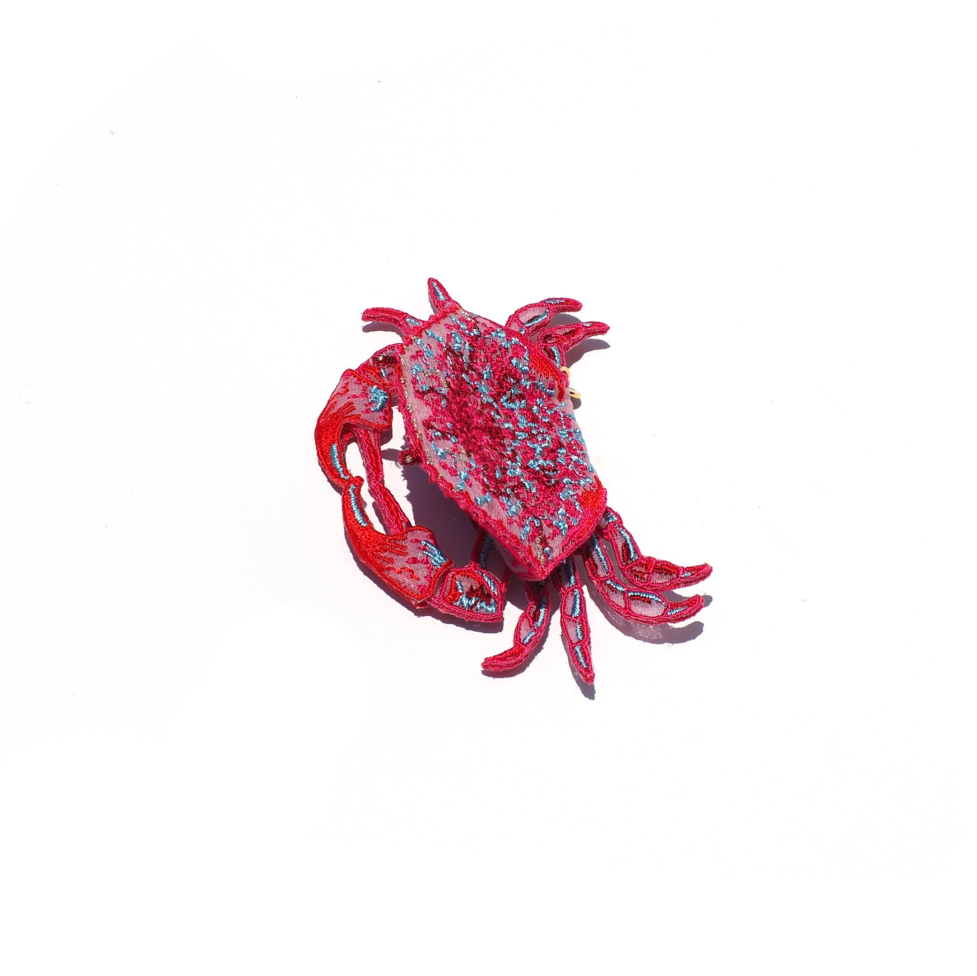 These unique crab motif brooches are crafted with environmentally friendly materials. The base fabric is made from recycled PET bottles, highlighting a commitment to sustainability. Decorated with fine embroidery on sheer organza and assembled to create a three-dimensional effect, they are perfect for special occasions. The magnetic clasp ensures that your clothes remain undamaged.