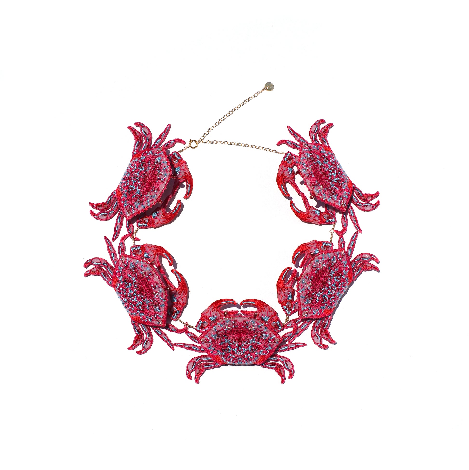 These unique crab motif necklaces are crafted with environmentally friendly materials. The base fabric is made from recycled PET bottles, highlighting a commitment to sustainability. Decorated with fine embroidery on sheer organza and assembled to create a three-dimensional effect, they are perfect for special occasions.