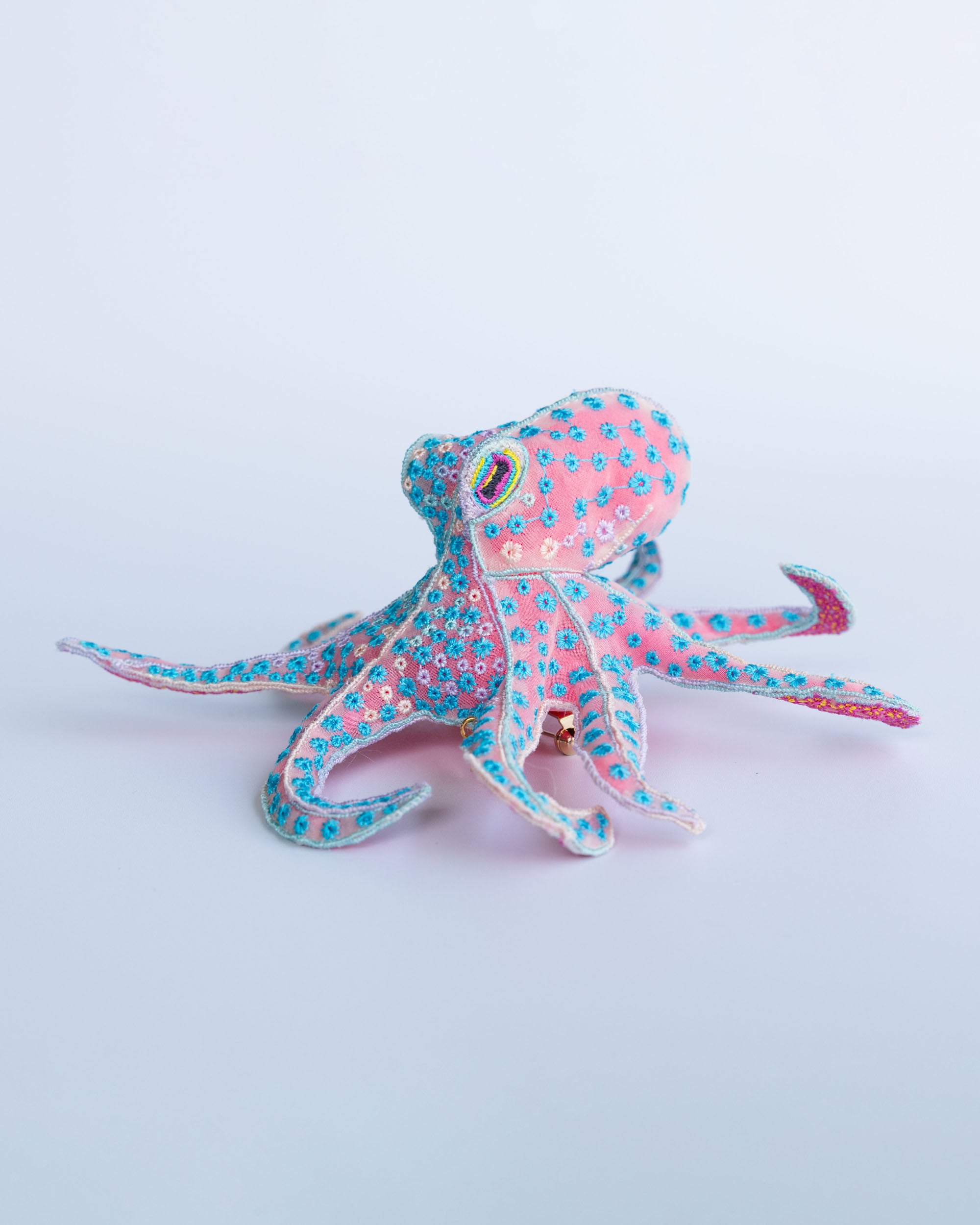 This delicately embroidered octopus motif brooch is crafted from recycled polyester organza, making it a unique and sophisticated accent piece.