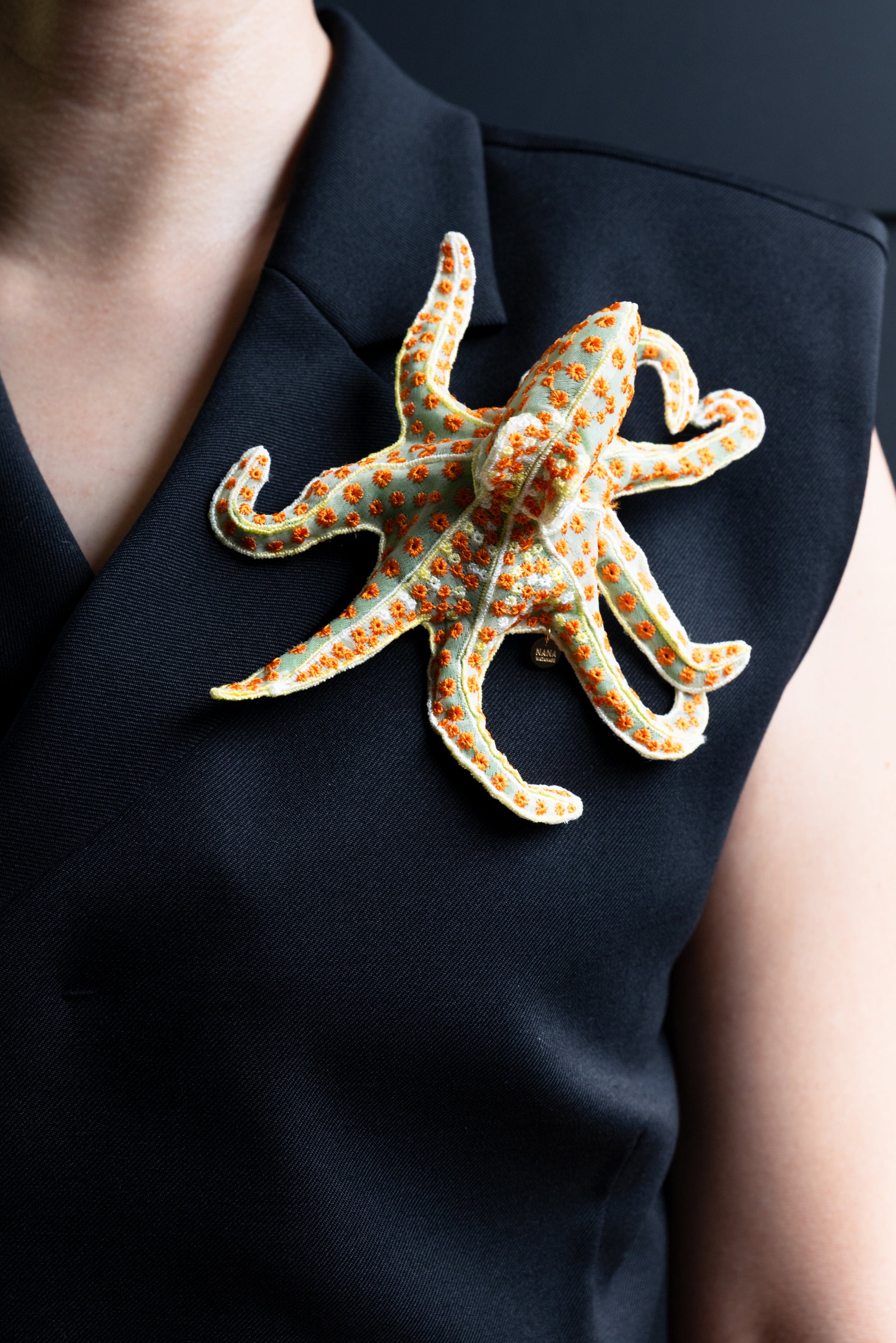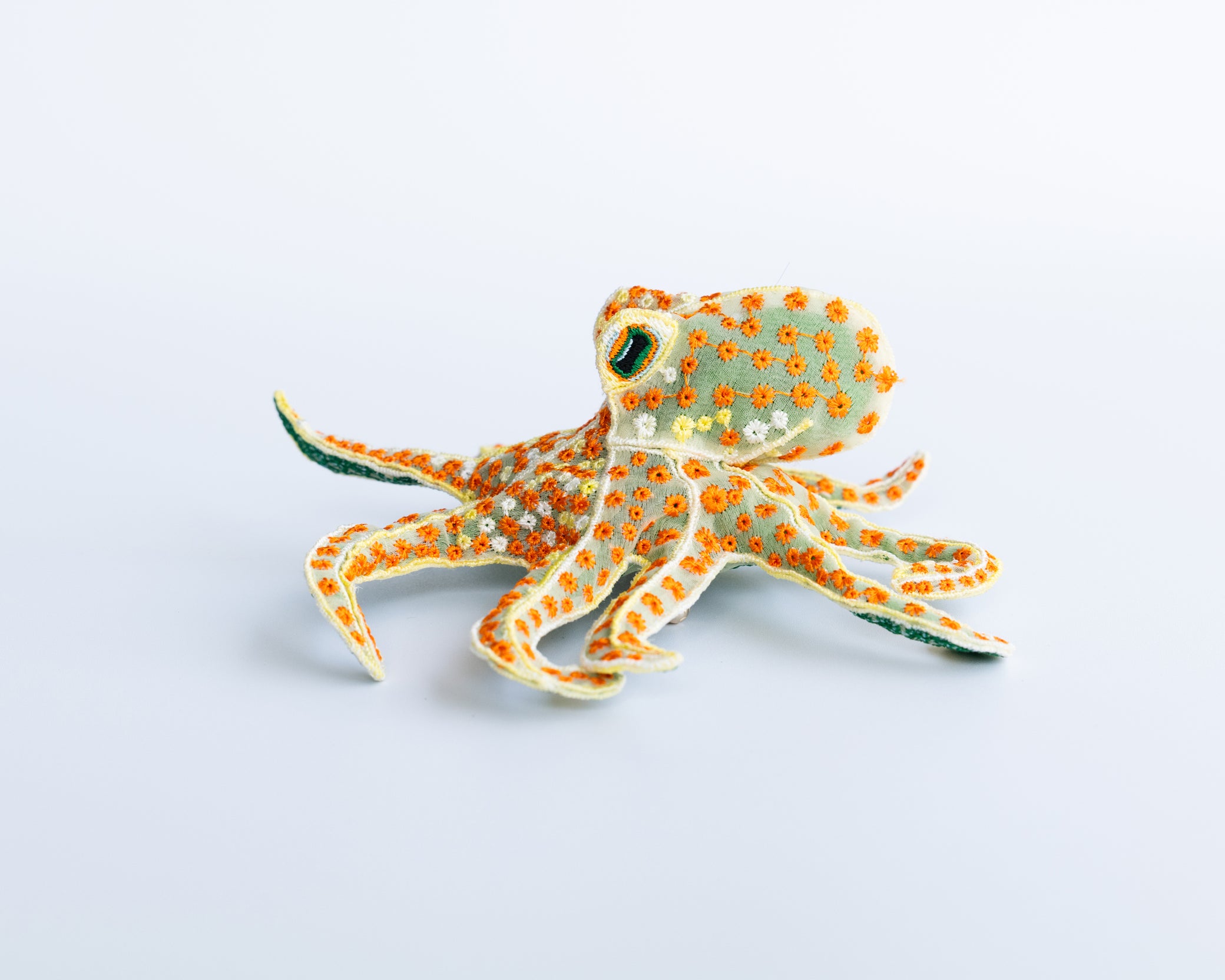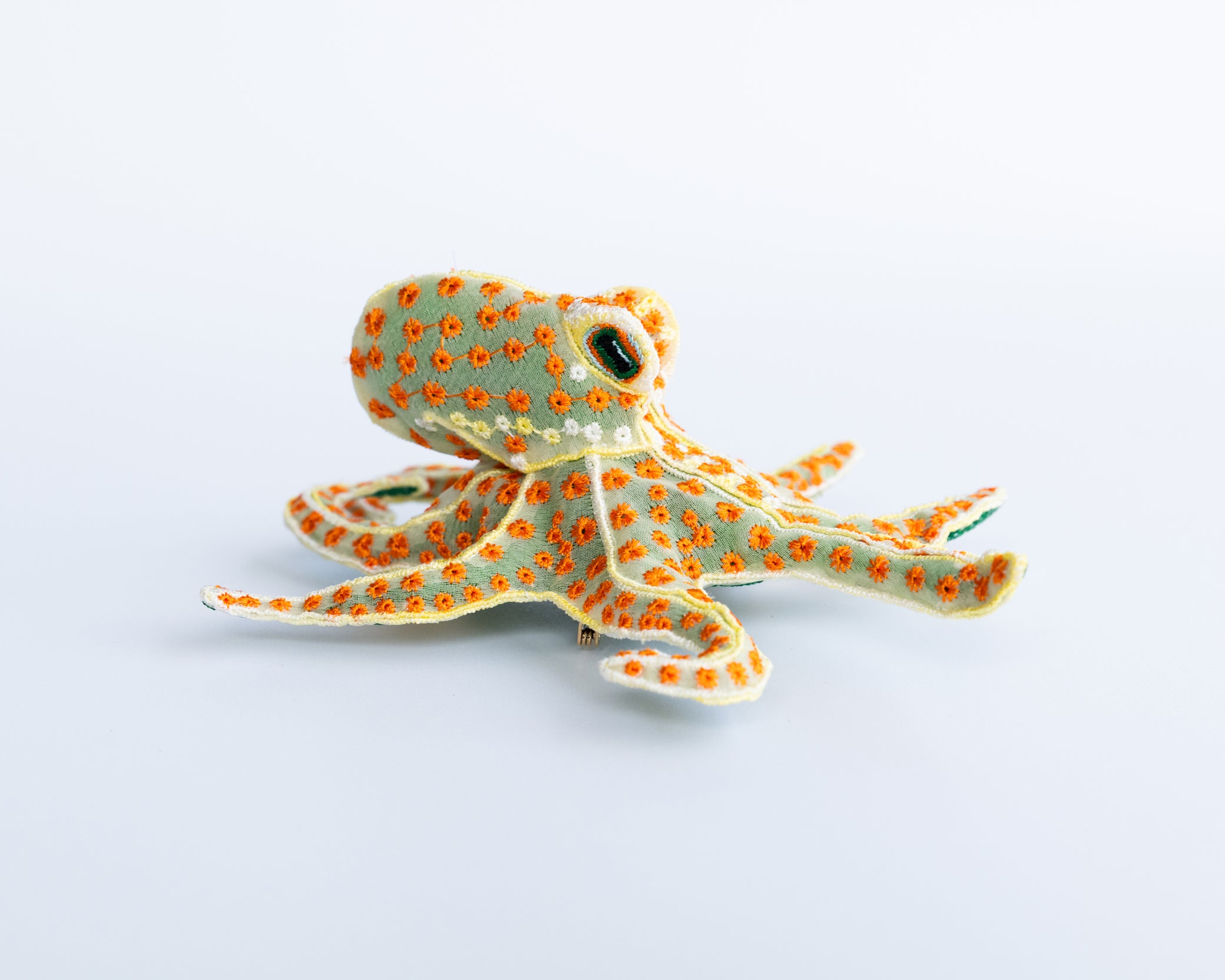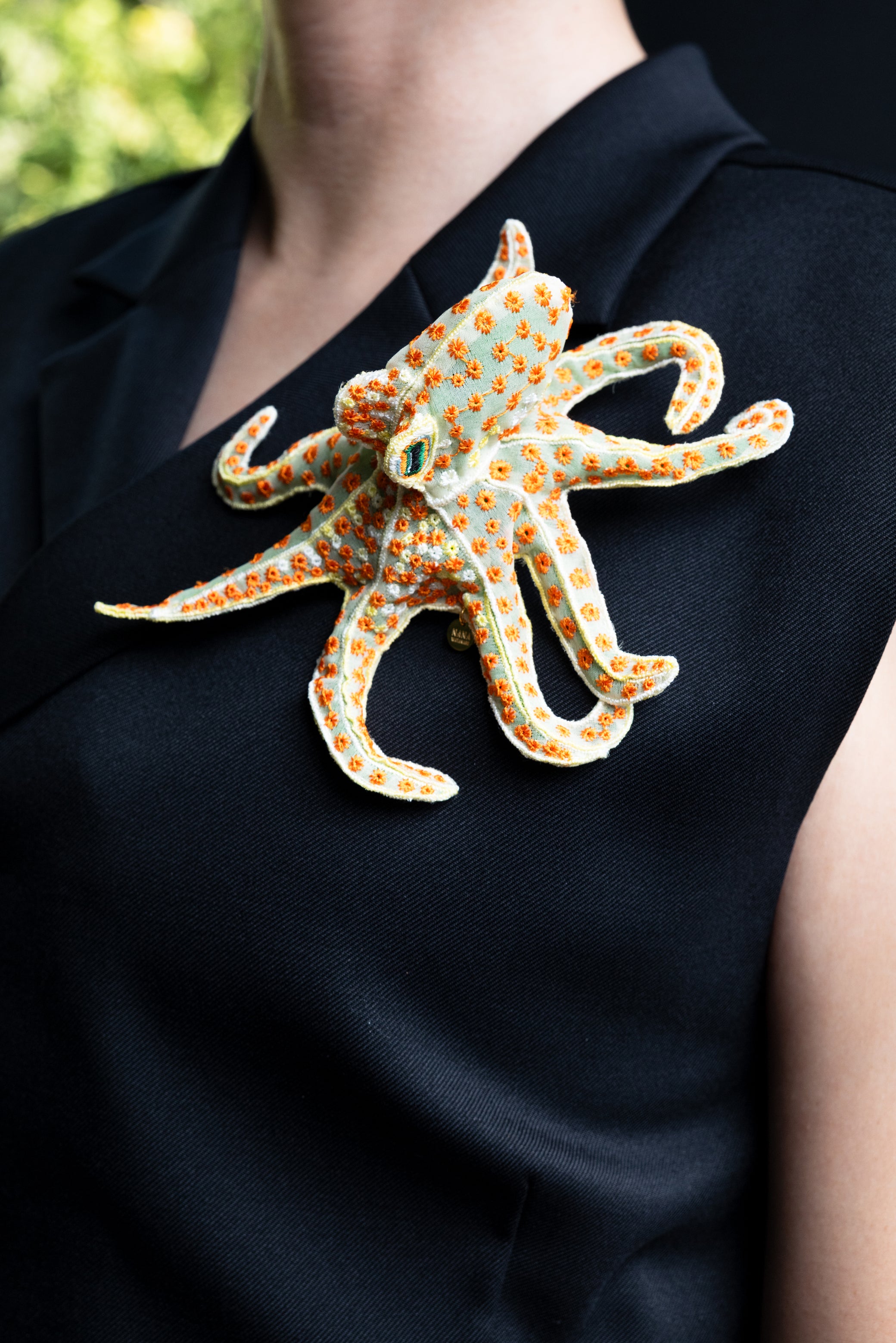This delicately embroidered octopus motif brooch is crafted from recycled polyester organza, making it a unique and sophisticated accent piece.