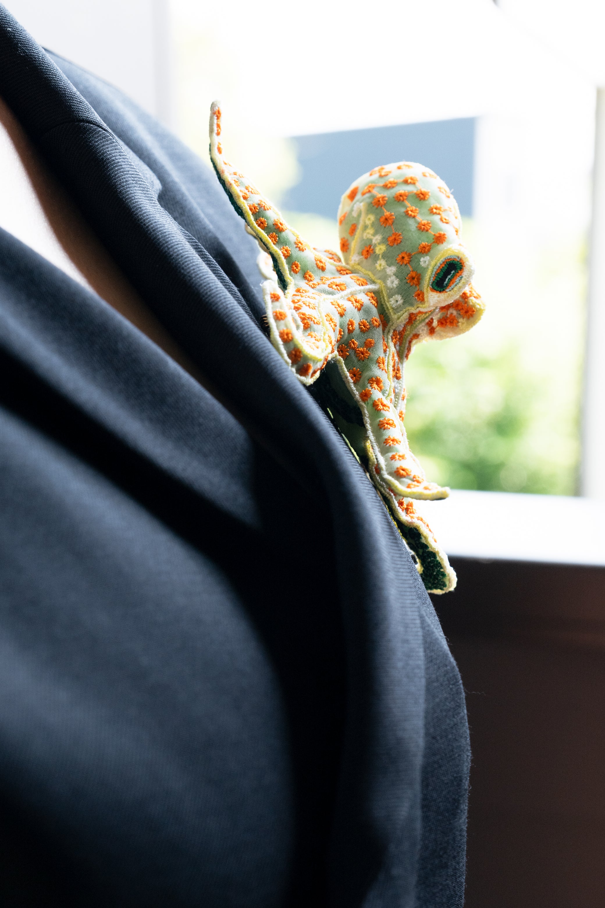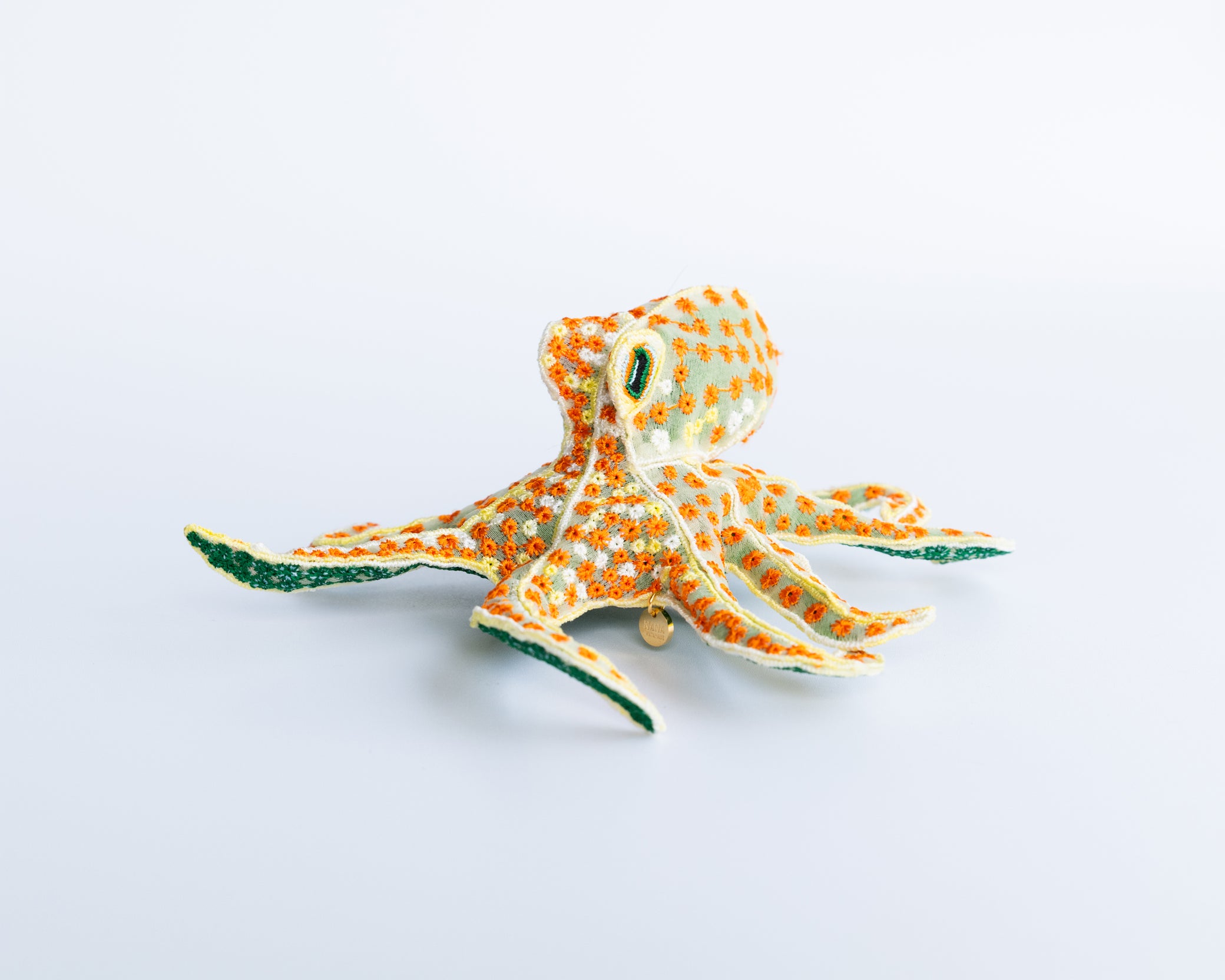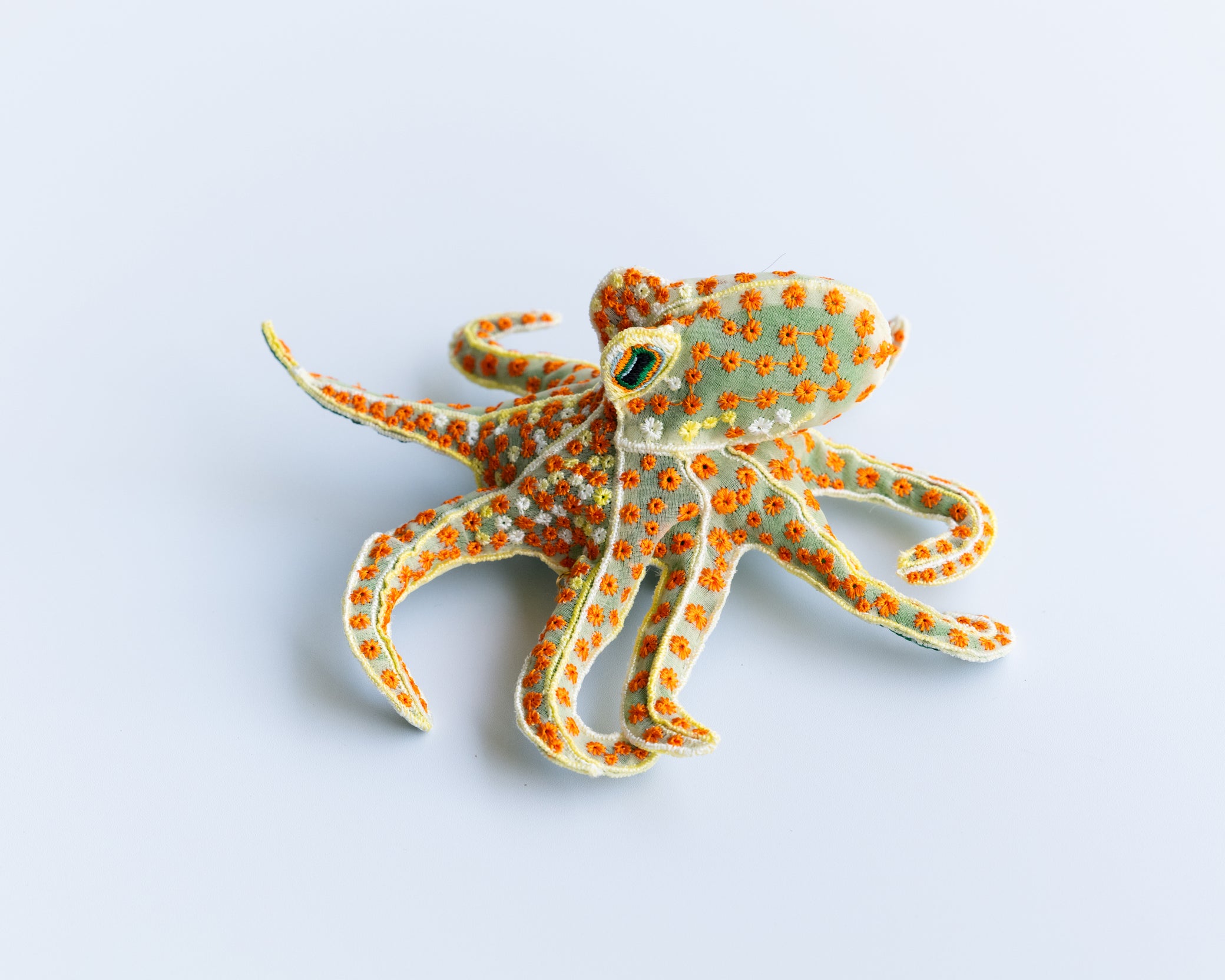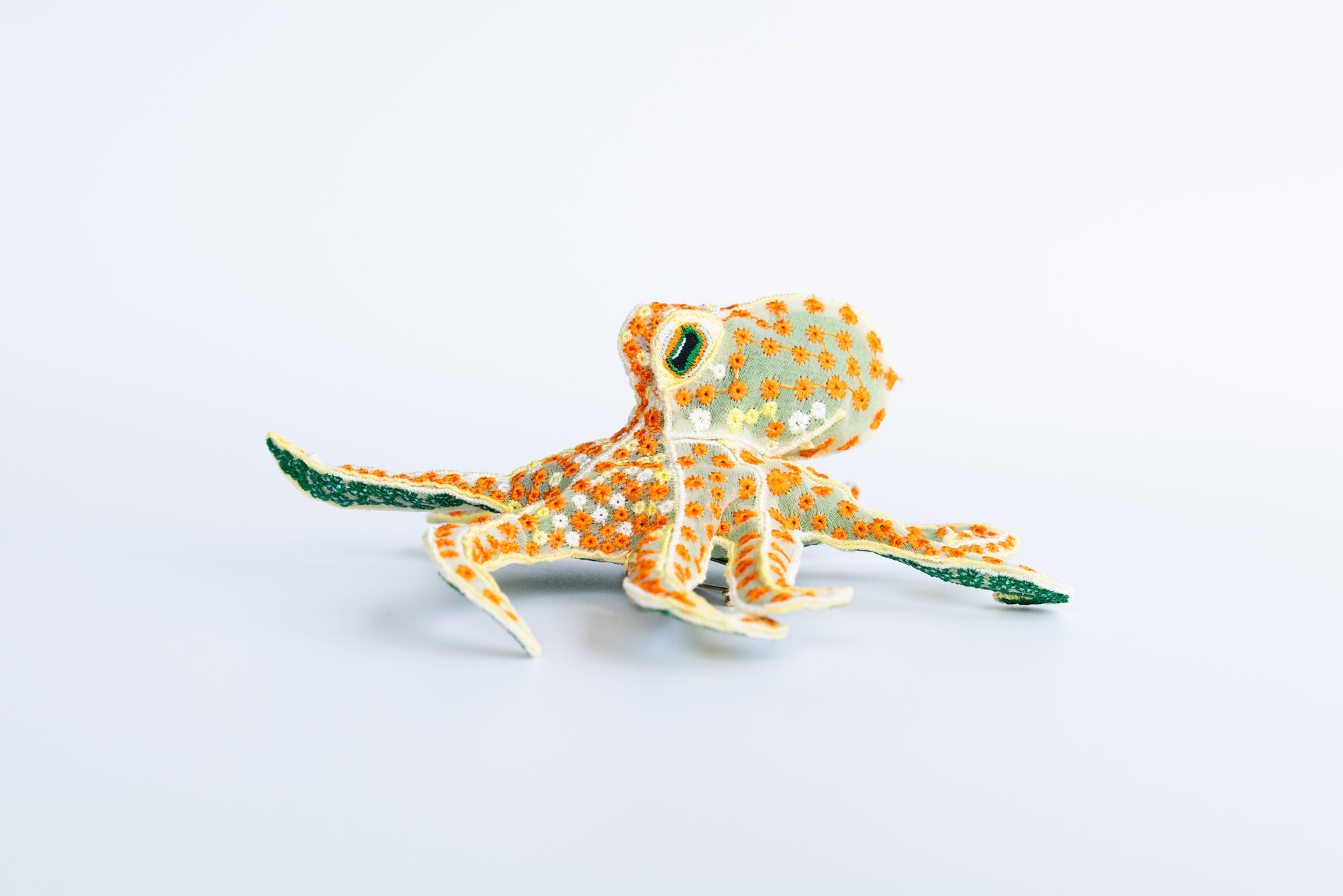 This delicately embroidered octopus motif brooch is crafted from recycled polyester organza, making it a unique and sophisticated accent piece.