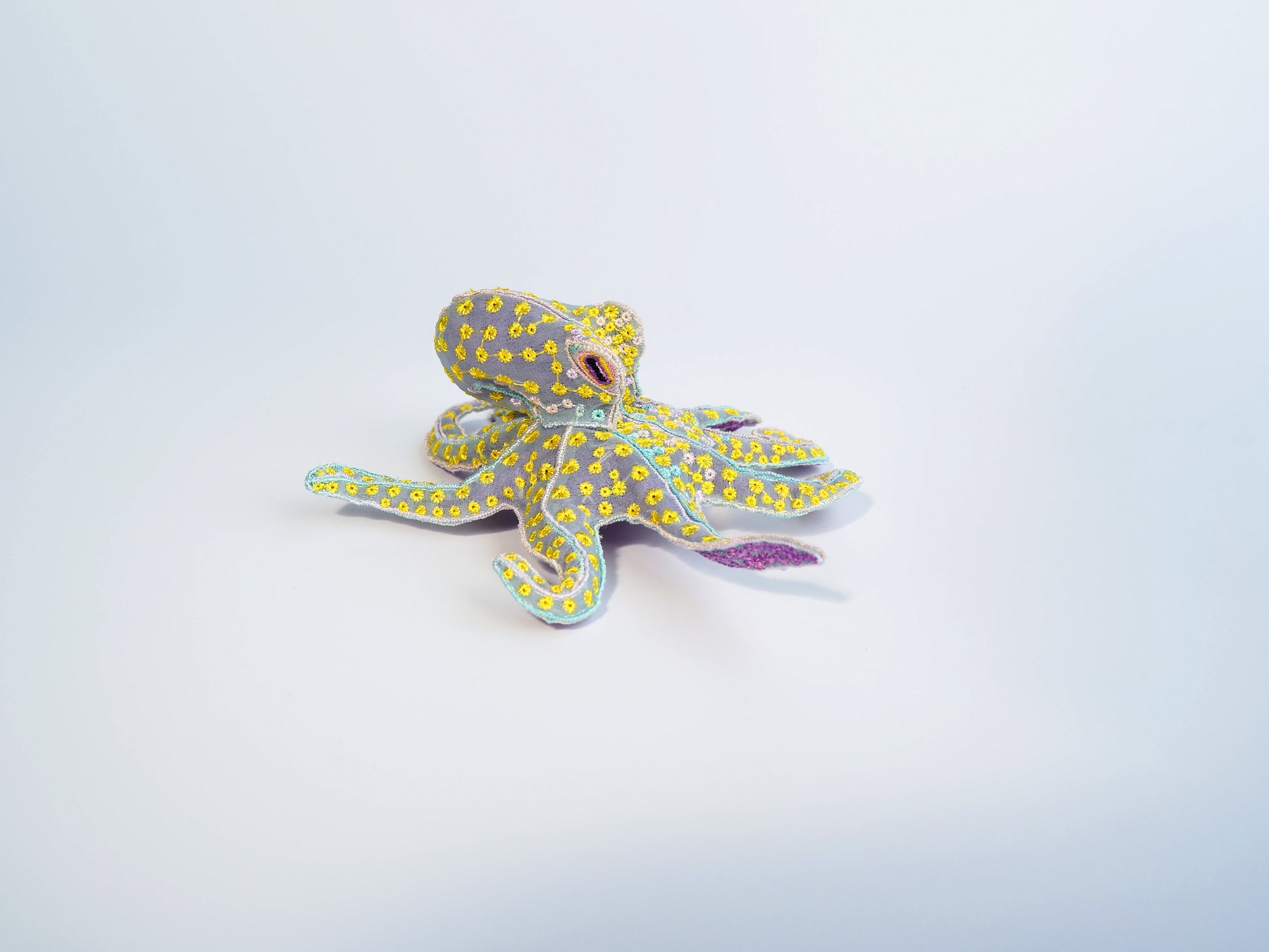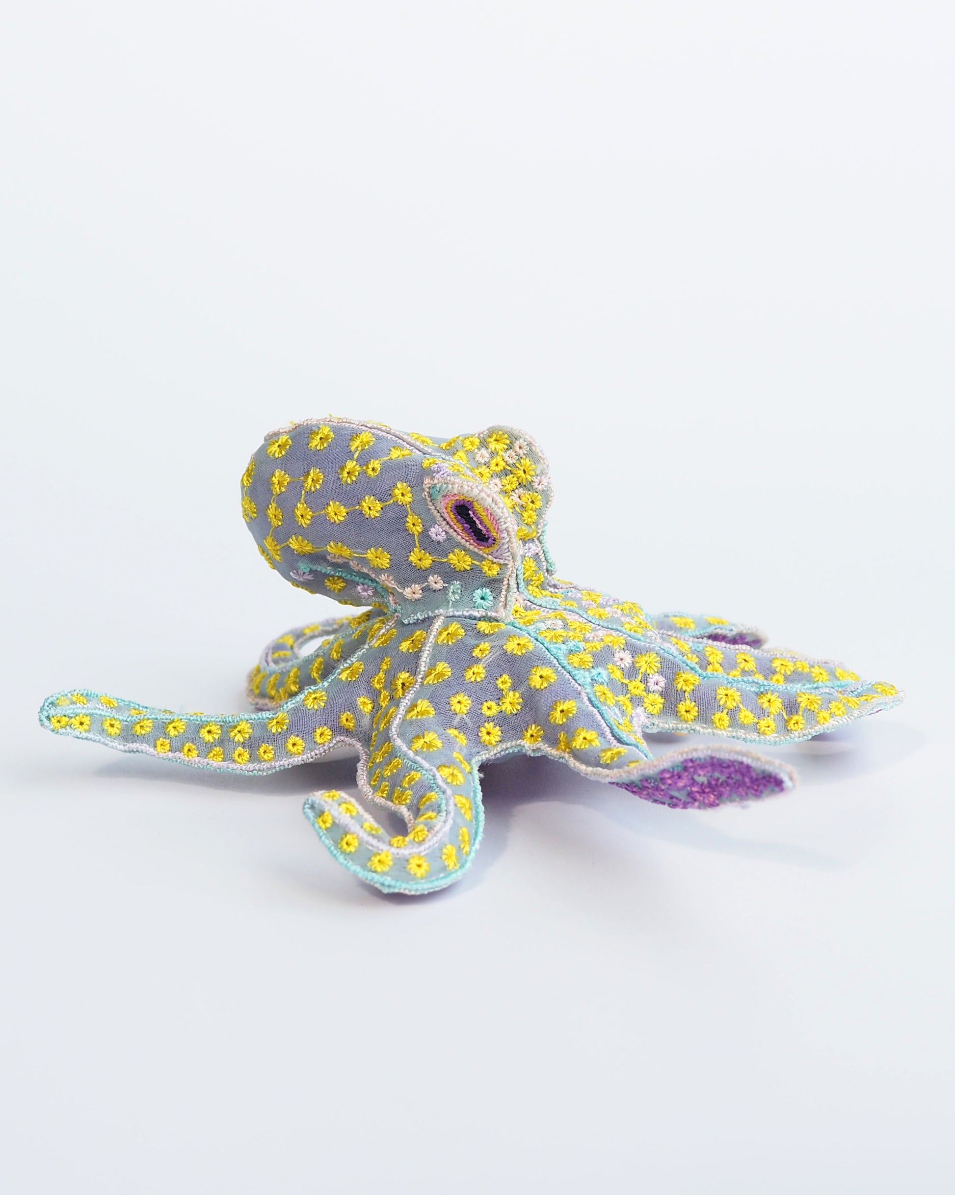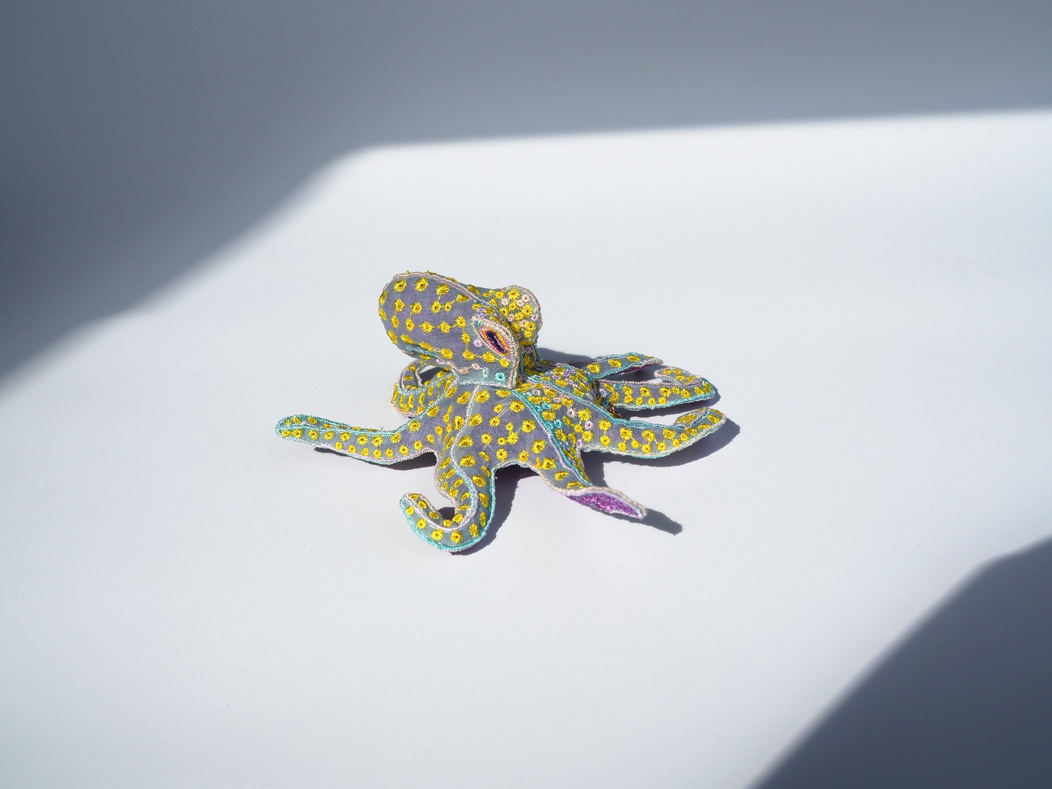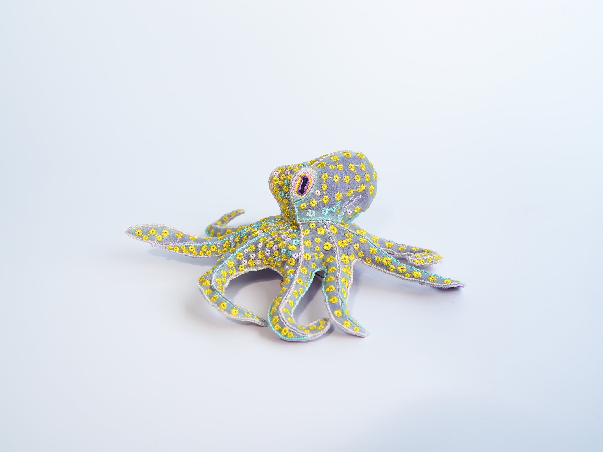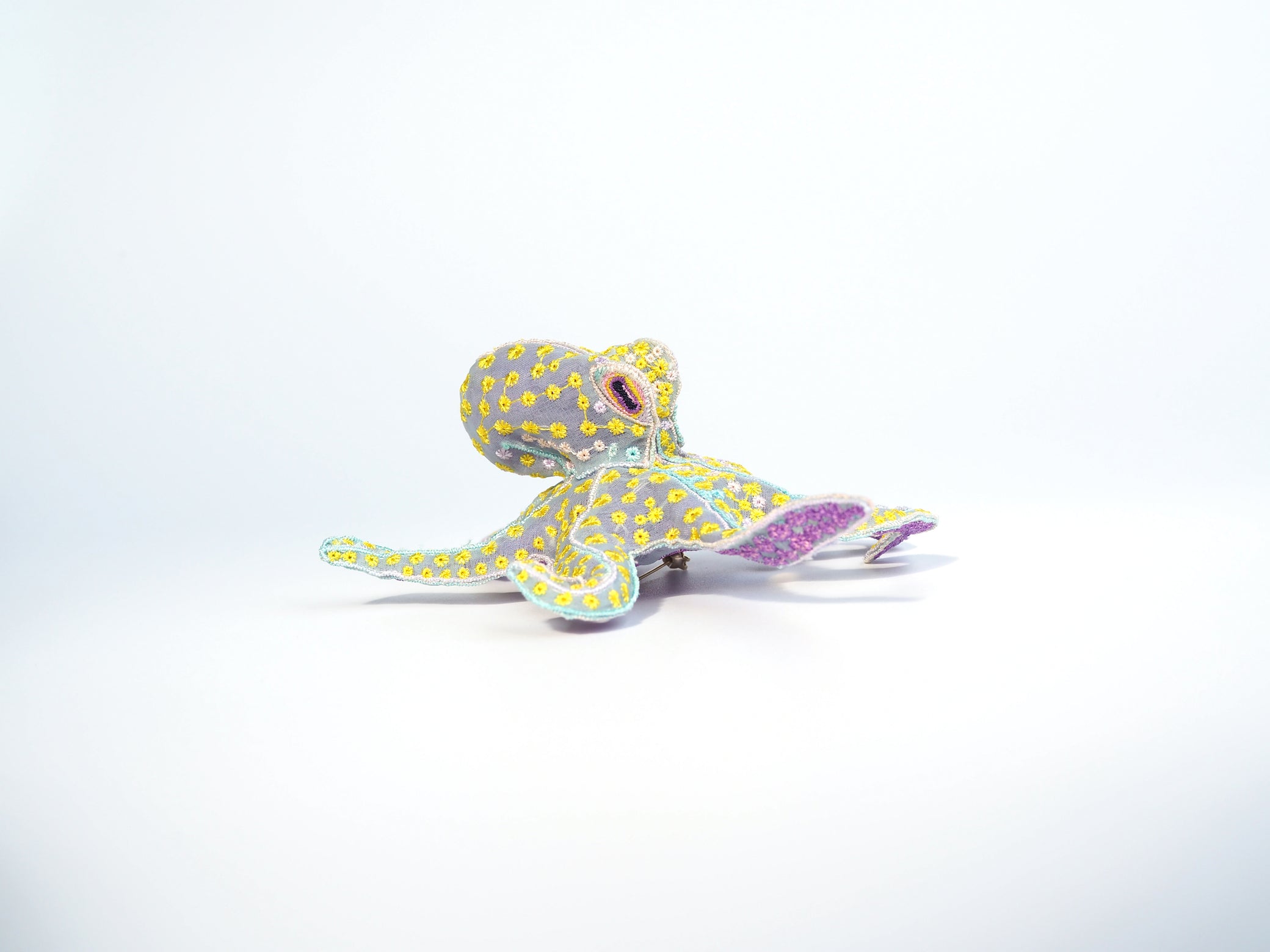 This delicately embroidered octopus motif brooch is crafted from recycled polyester organza, making it a unique and sophisticated accent piece.
