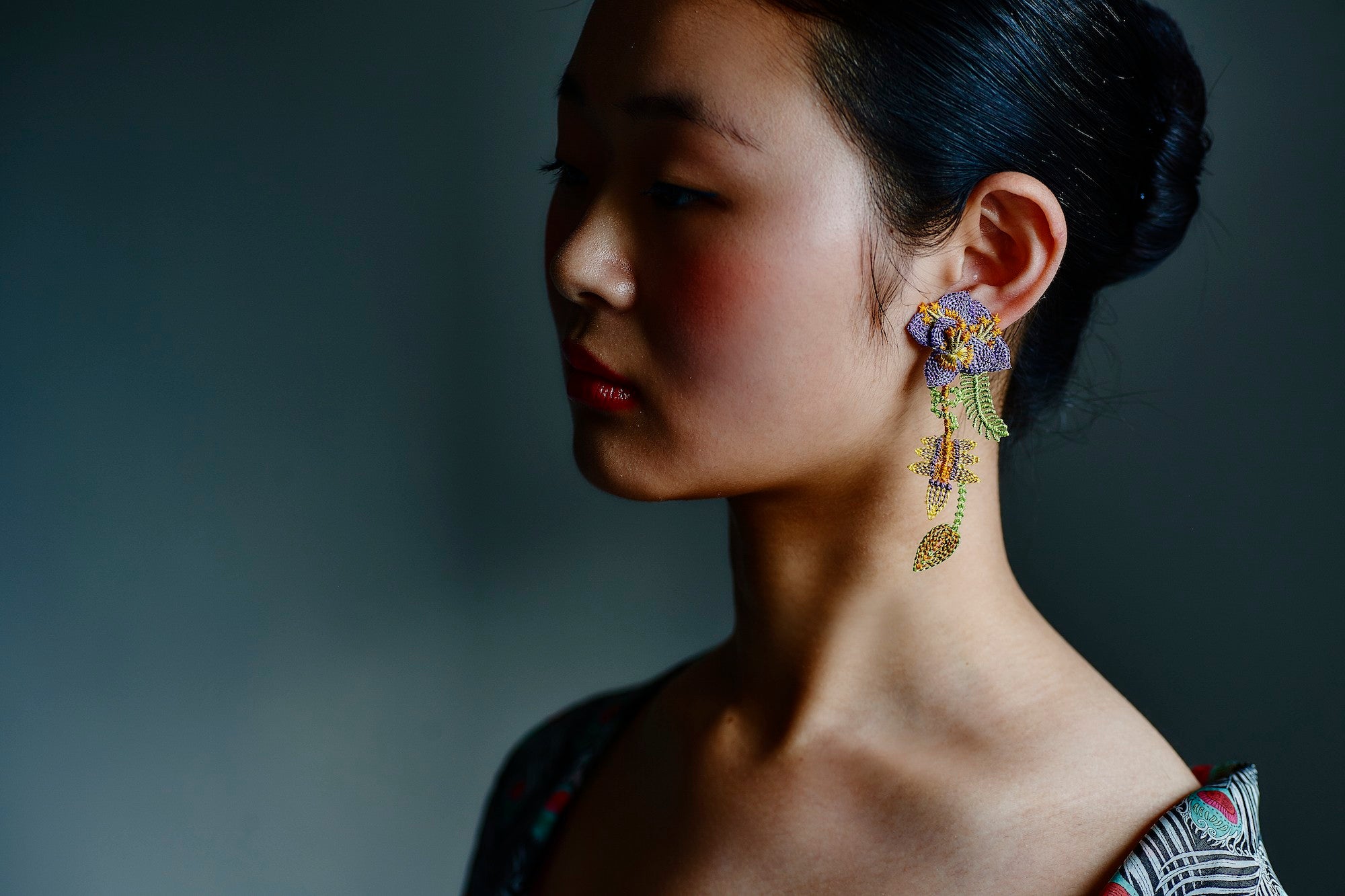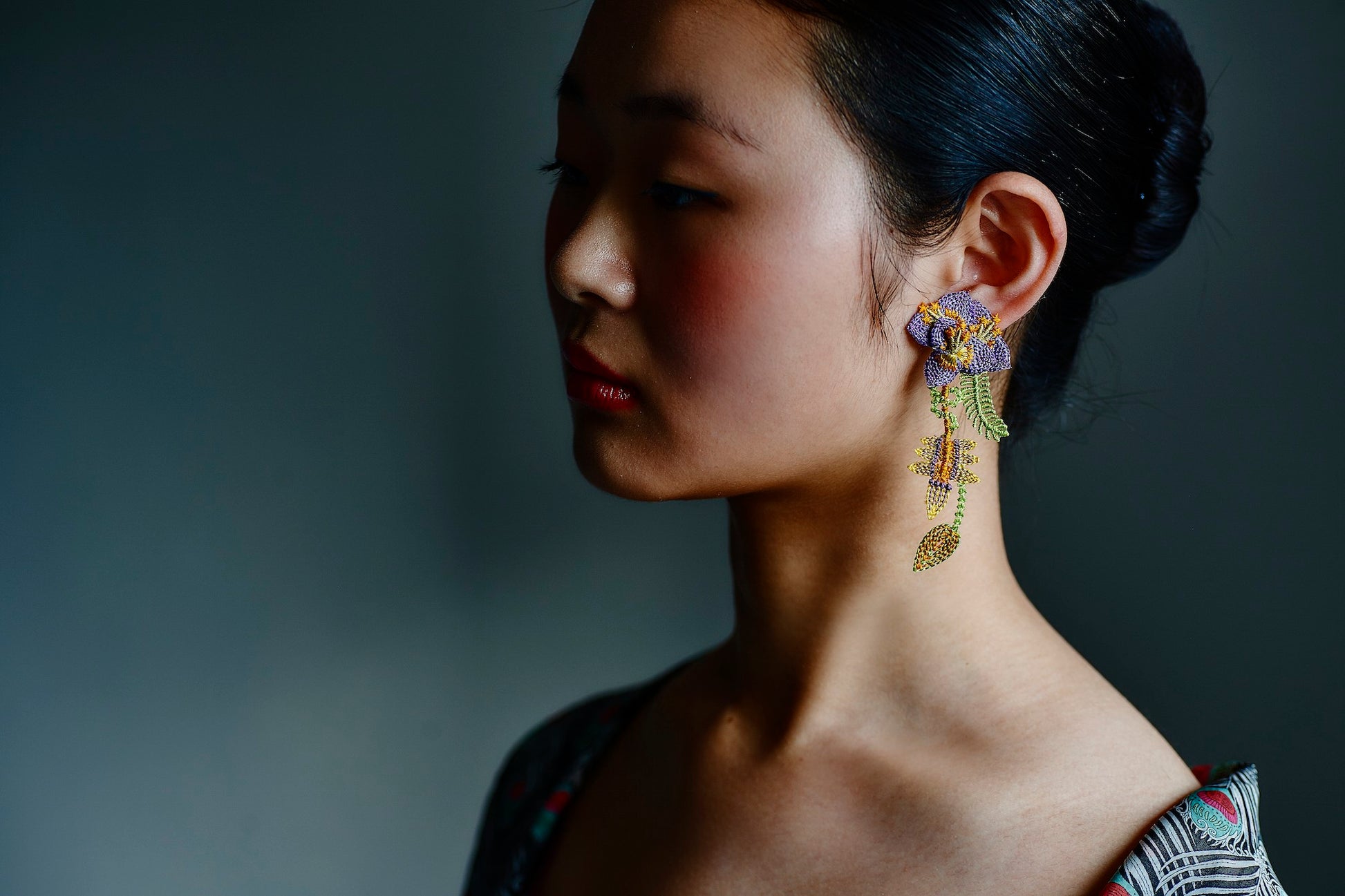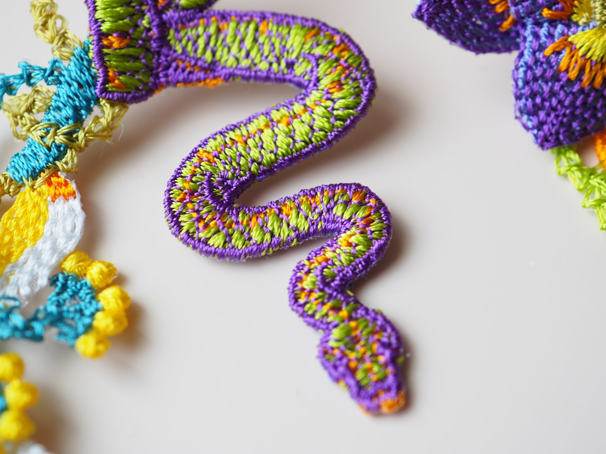 Inspired by the concept of "paradise," the Garden Embroidery Earrings feature beautiful motifs of flowers and snakes. These unique earrings are crafted by embroidering on sheer fabric, carefully cutting around the edges, and layering multiple parts to create a three-dimensional effect.