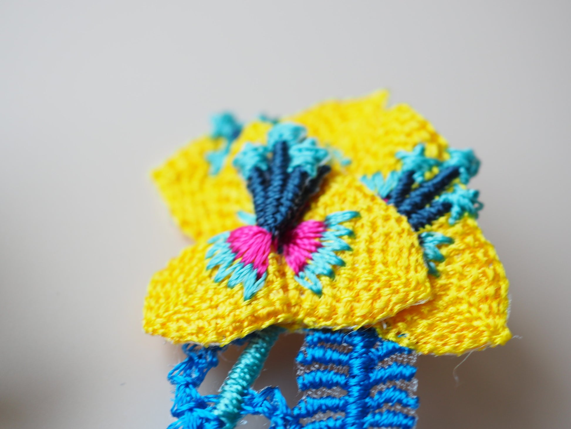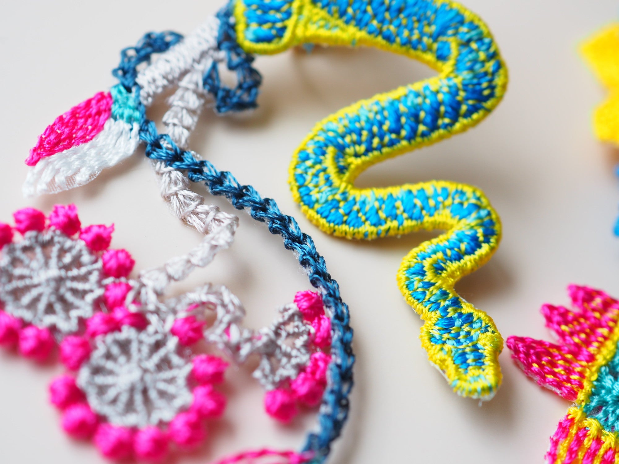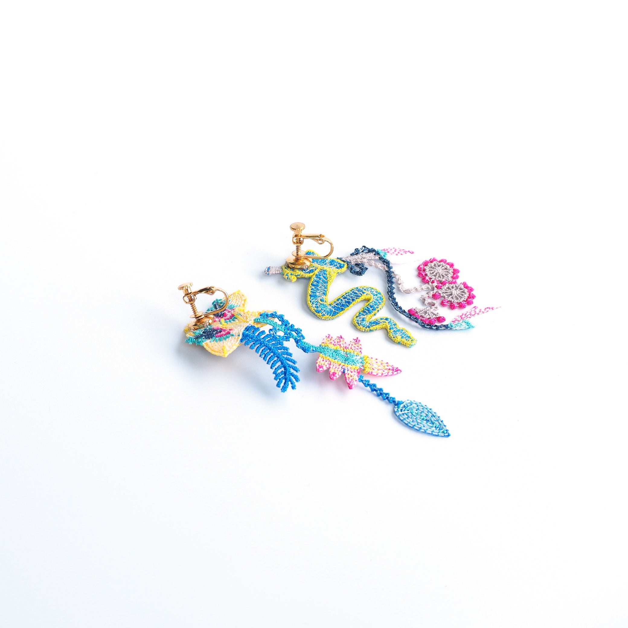 Inspired by the concept of "paradise," the Garden Embroidery Earrings feature beautiful motifs of flowers and snakes. These unique earrings are crafted by embroidering on sheer fabric, carefully cutting around the edges, and layering multiple parts to create a three-dimensional effect.