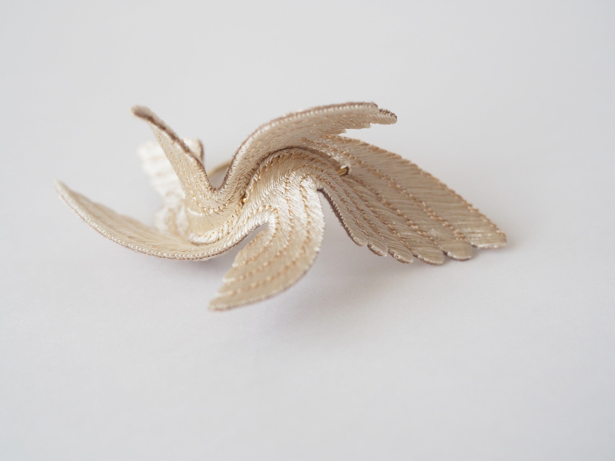 Designed to bring happiness to its wearers, this series of large, flamboyant bird motif accessories exudes elegance and charm. The dynamic design, achieved by adding folds to a single embroidered flat piece, creates a three-dimensional effect that mimics the graceful flight of a bird. The back side is made of velvet, providing a soft and gentle touch against the skin.