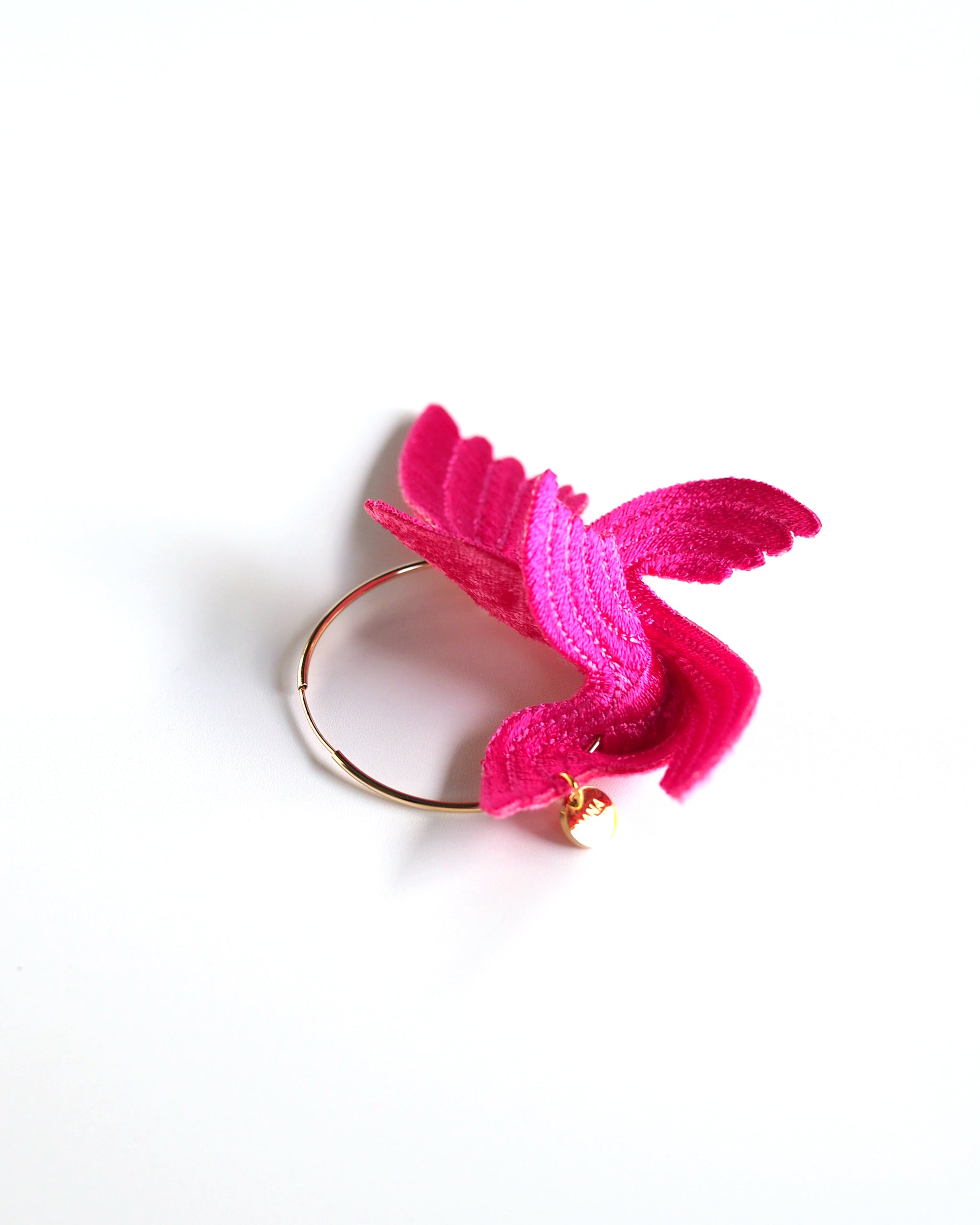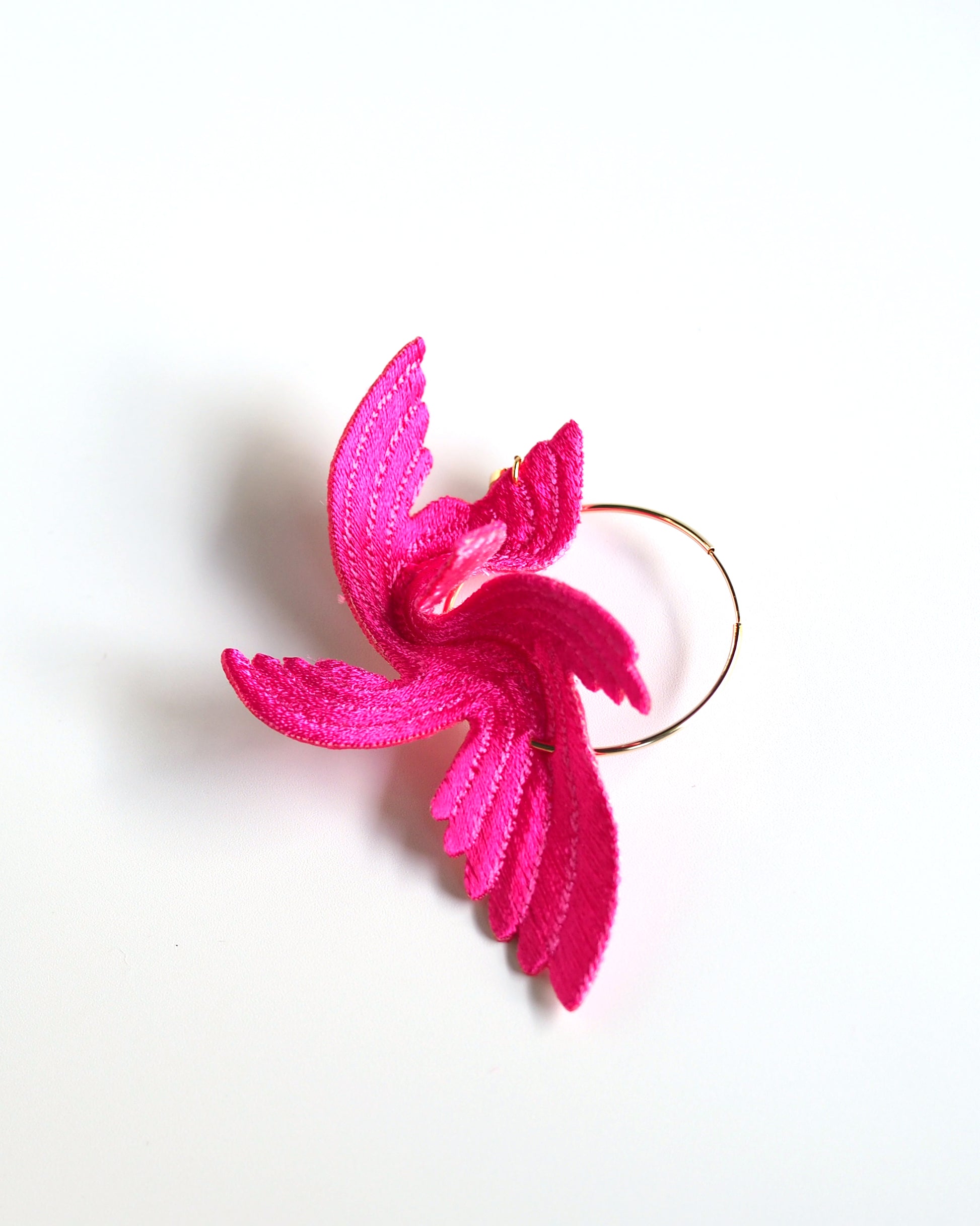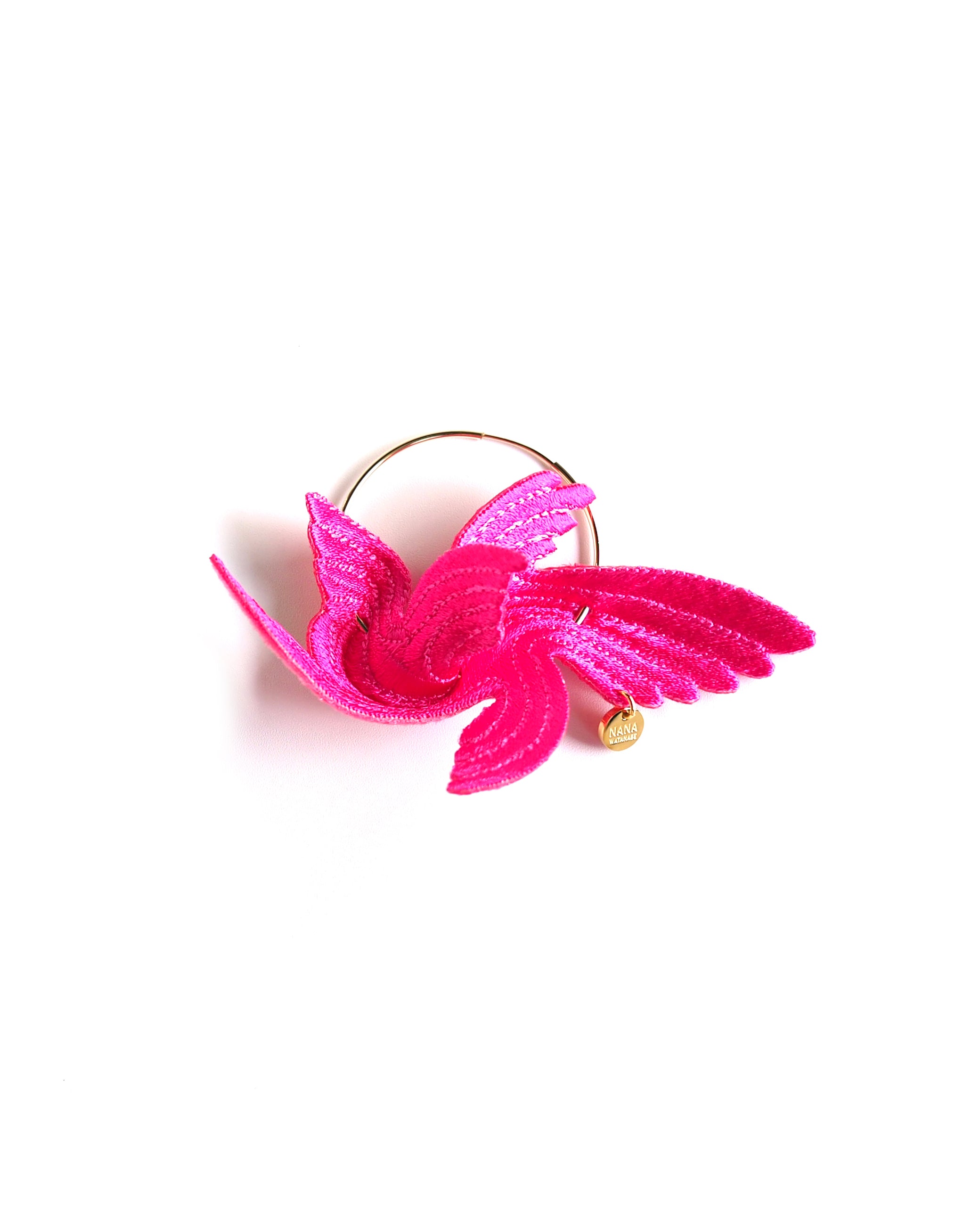 Designed to bring happiness to its wearers, this series of large, flamboyant bird motif accessories exudes elegance and charm. The dynamic design, achieved by adding folds to a single embroidered flat piece, creates a three-dimensional effect that mimics the graceful flight of a bird. The back side is made of velvet, providing a soft and gentle touch against the skin.