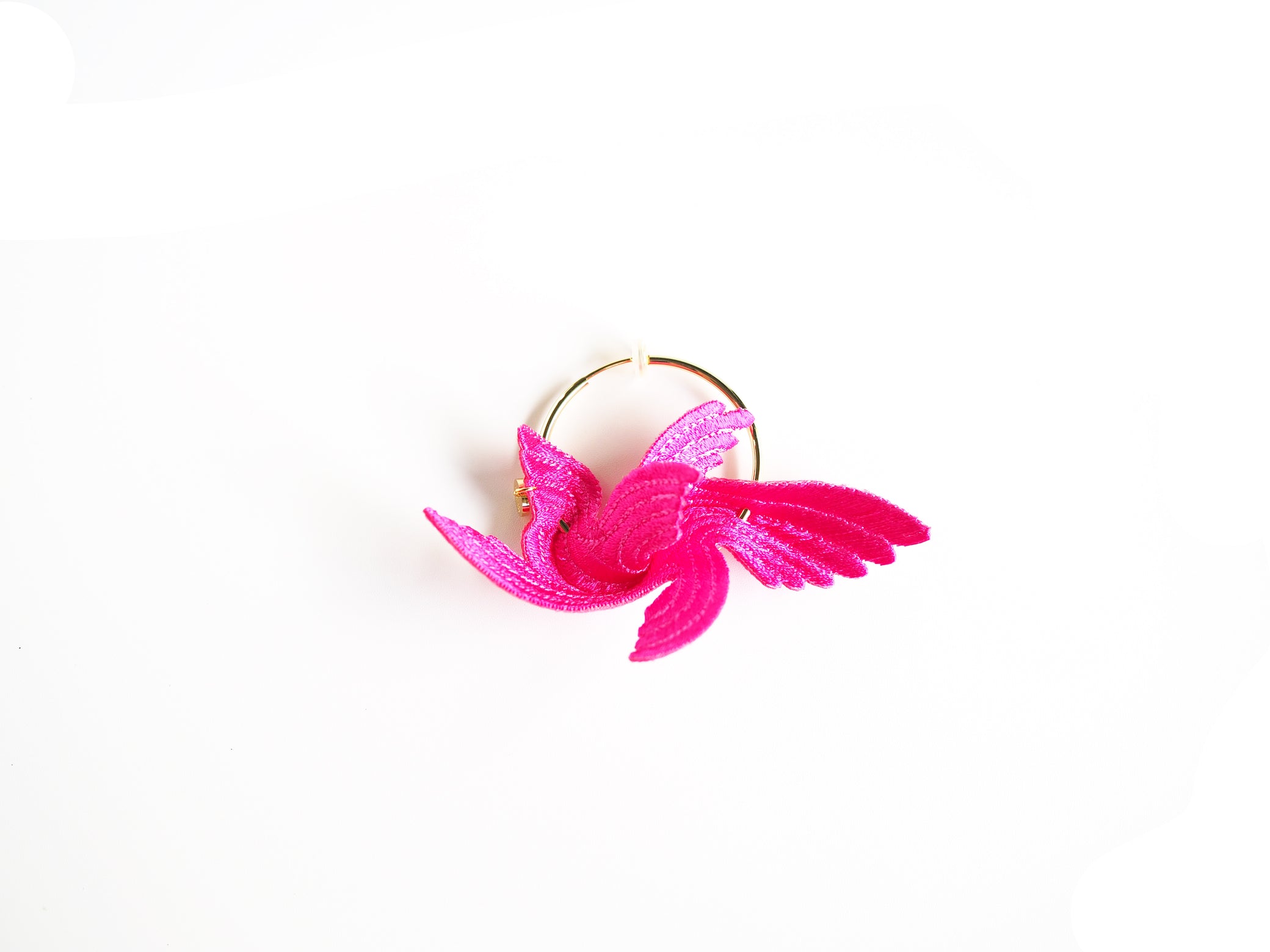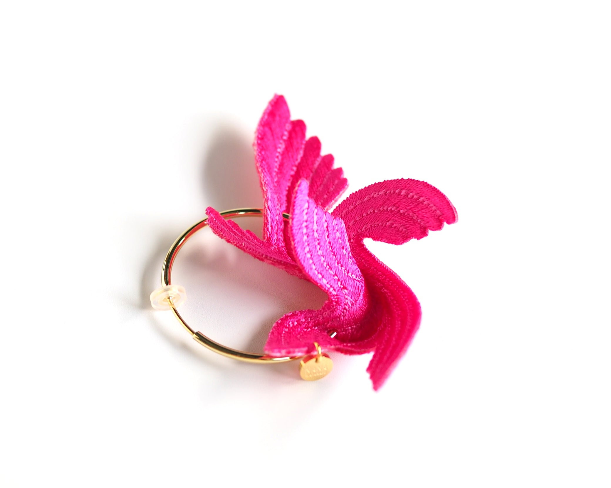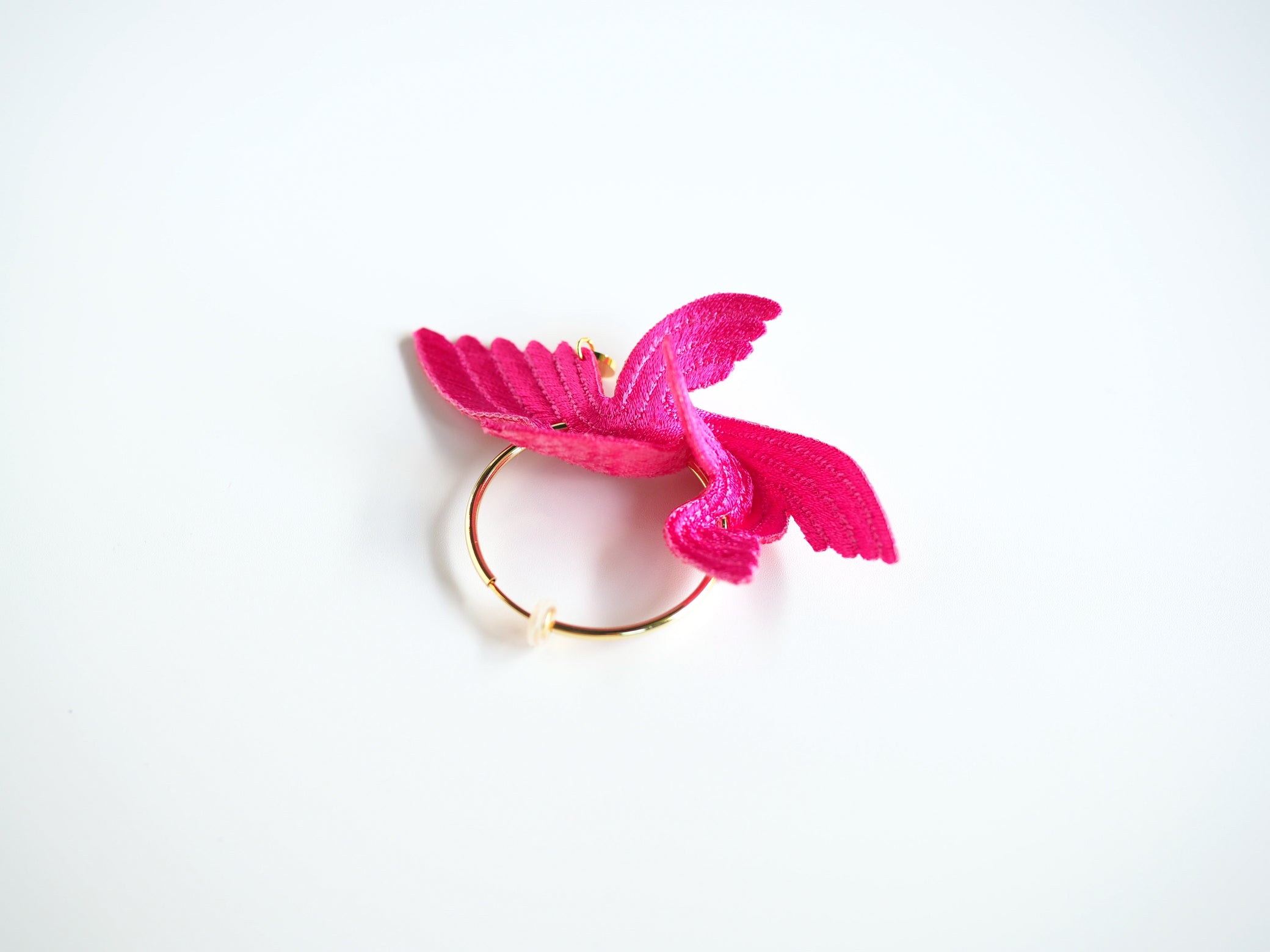 Designed to bring happiness to its wearers, this series of large, flamboyant bird motif accessories exudes elegance and charm. The dynamic design, achieved by adding folds to a single embroidered flat piece, creates a three-dimensional effect that mimics the graceful flight of a bird. The back side is made of velvet, providing a soft and gentle touch against the skin.