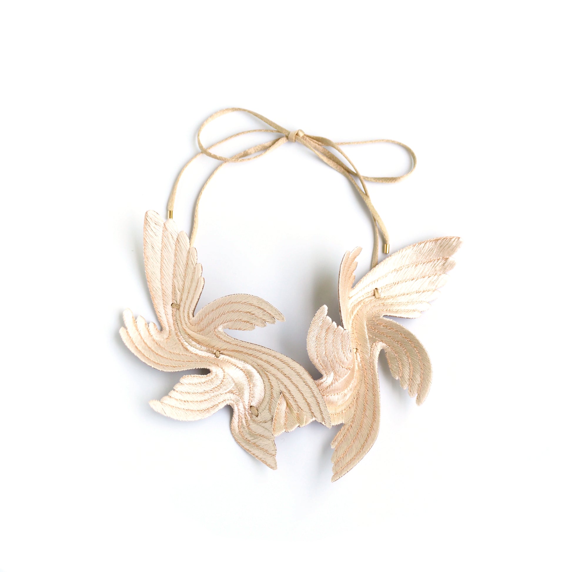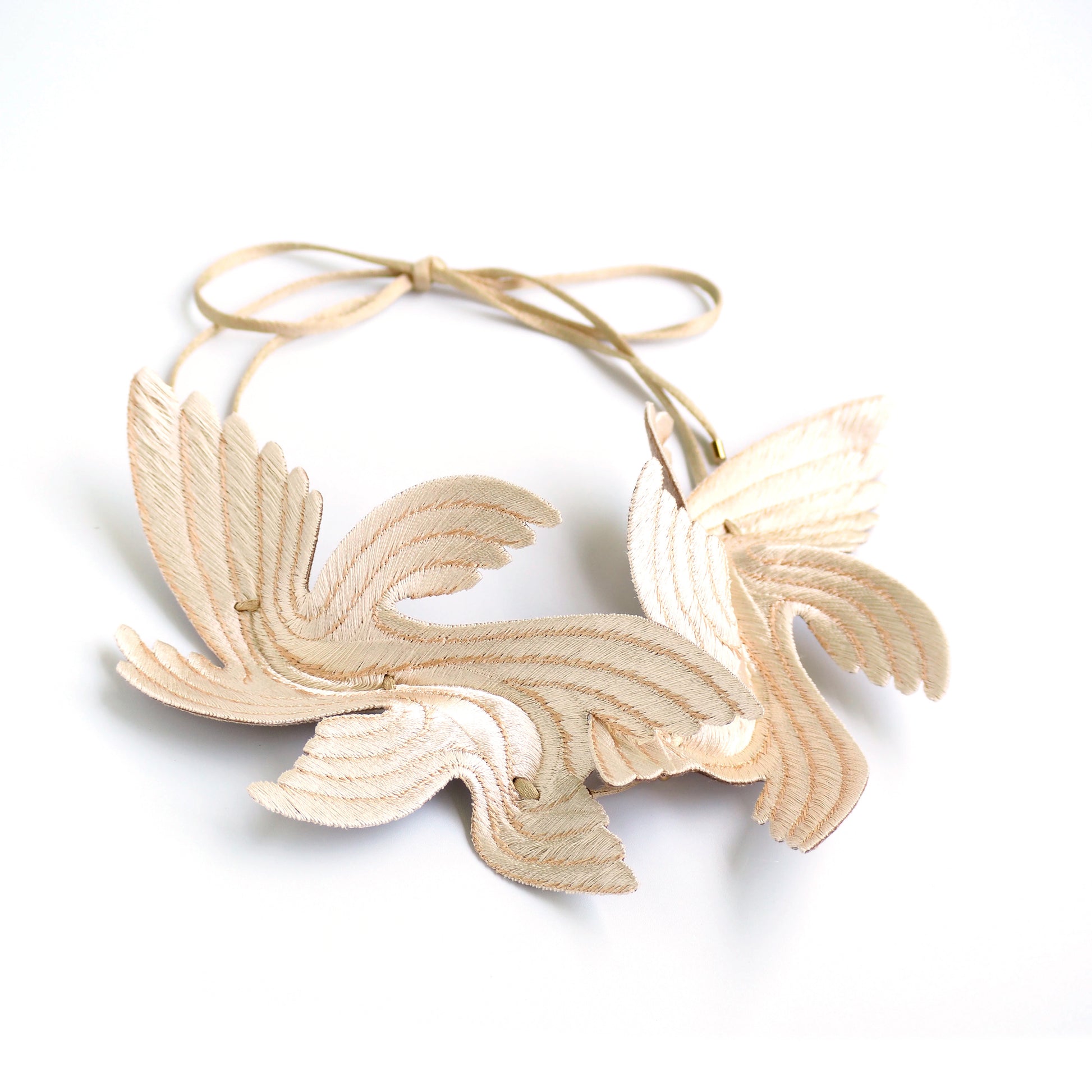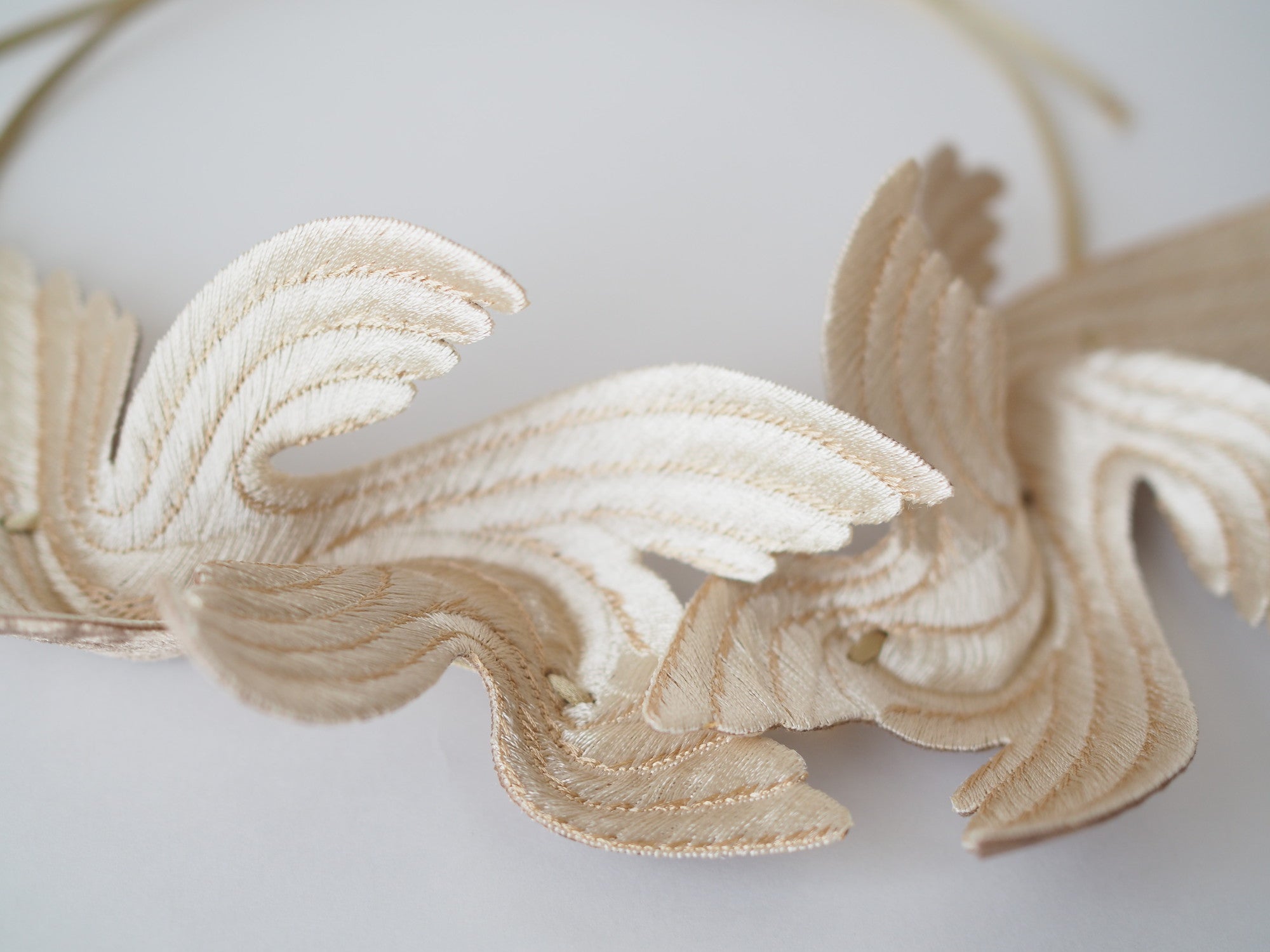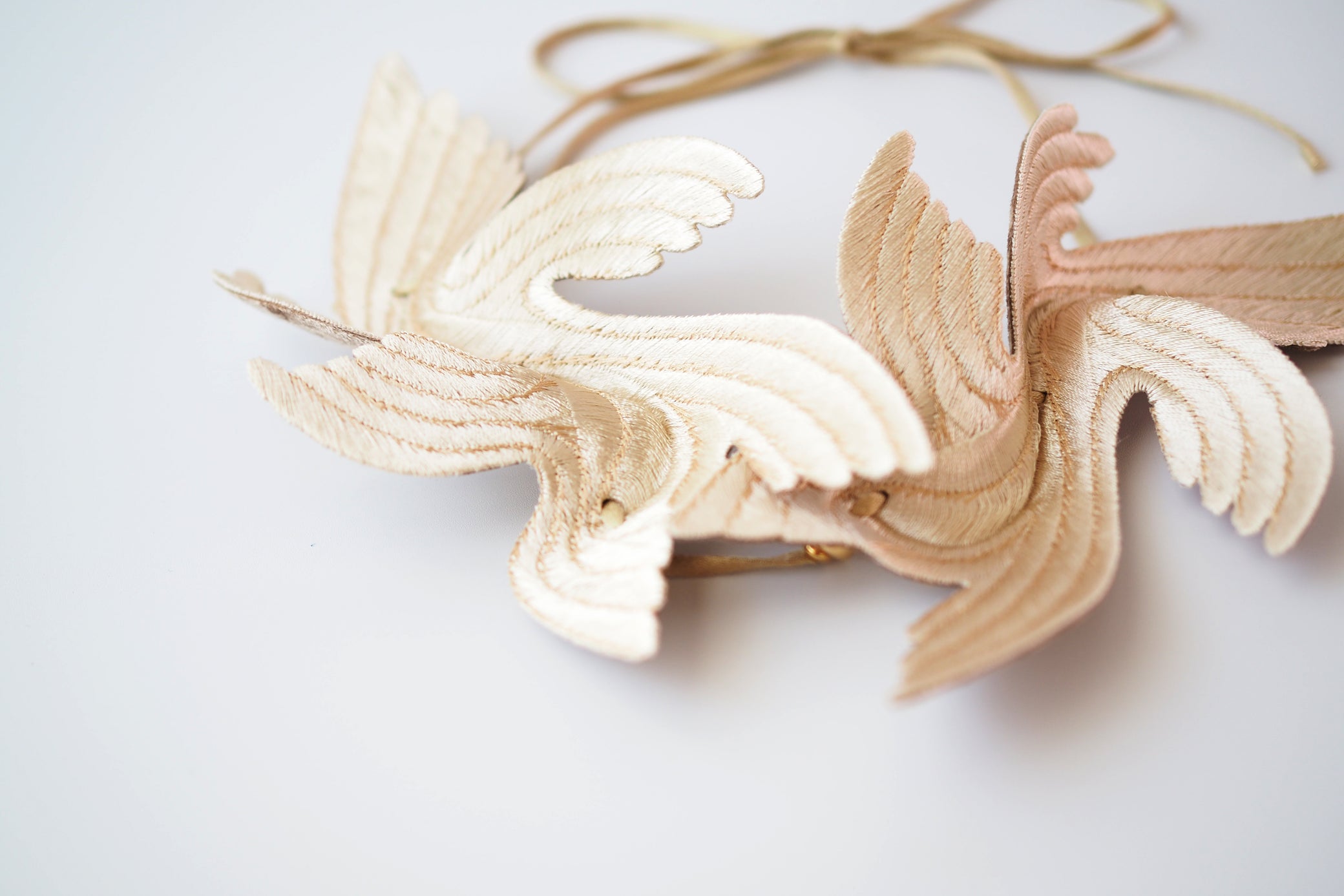 Designed to bring happiness to its wearers, this series of large, flamboyant bird motif accessories exudes elegance and charm. The dynamic design, achieved by adding folds to a single embroidered flat piece, creates a three-dimensional effect that mimics the graceful flight of a bird. The back side is made of velvet, providing a soft and gentle touch against the skin.