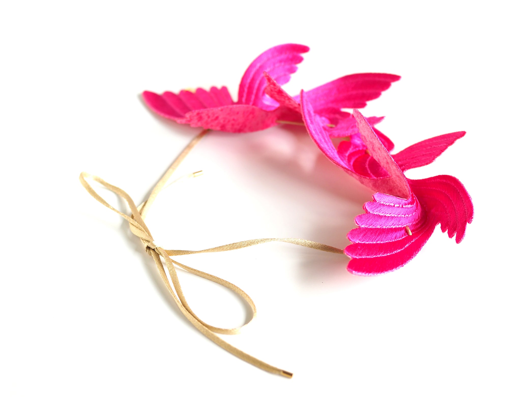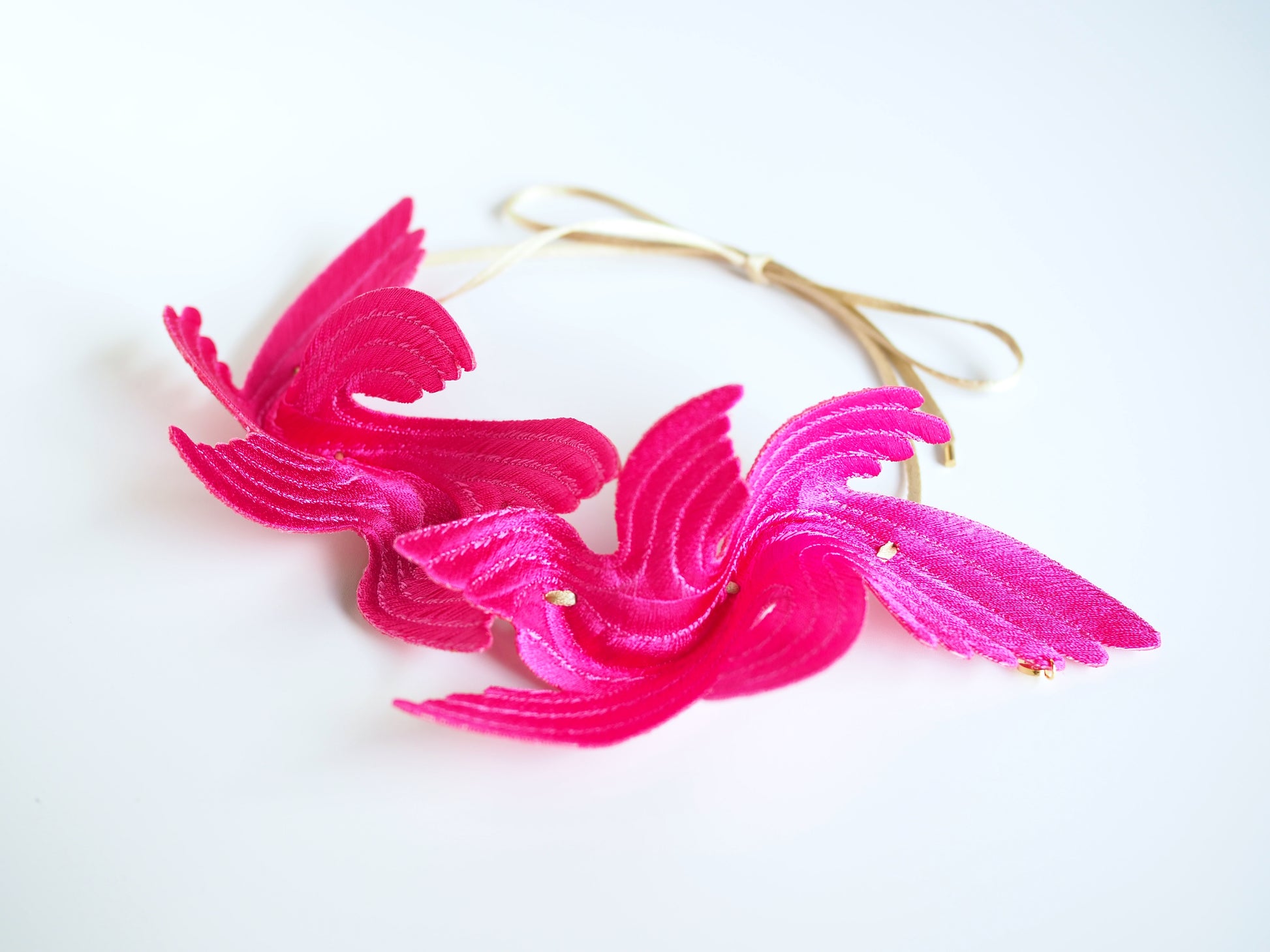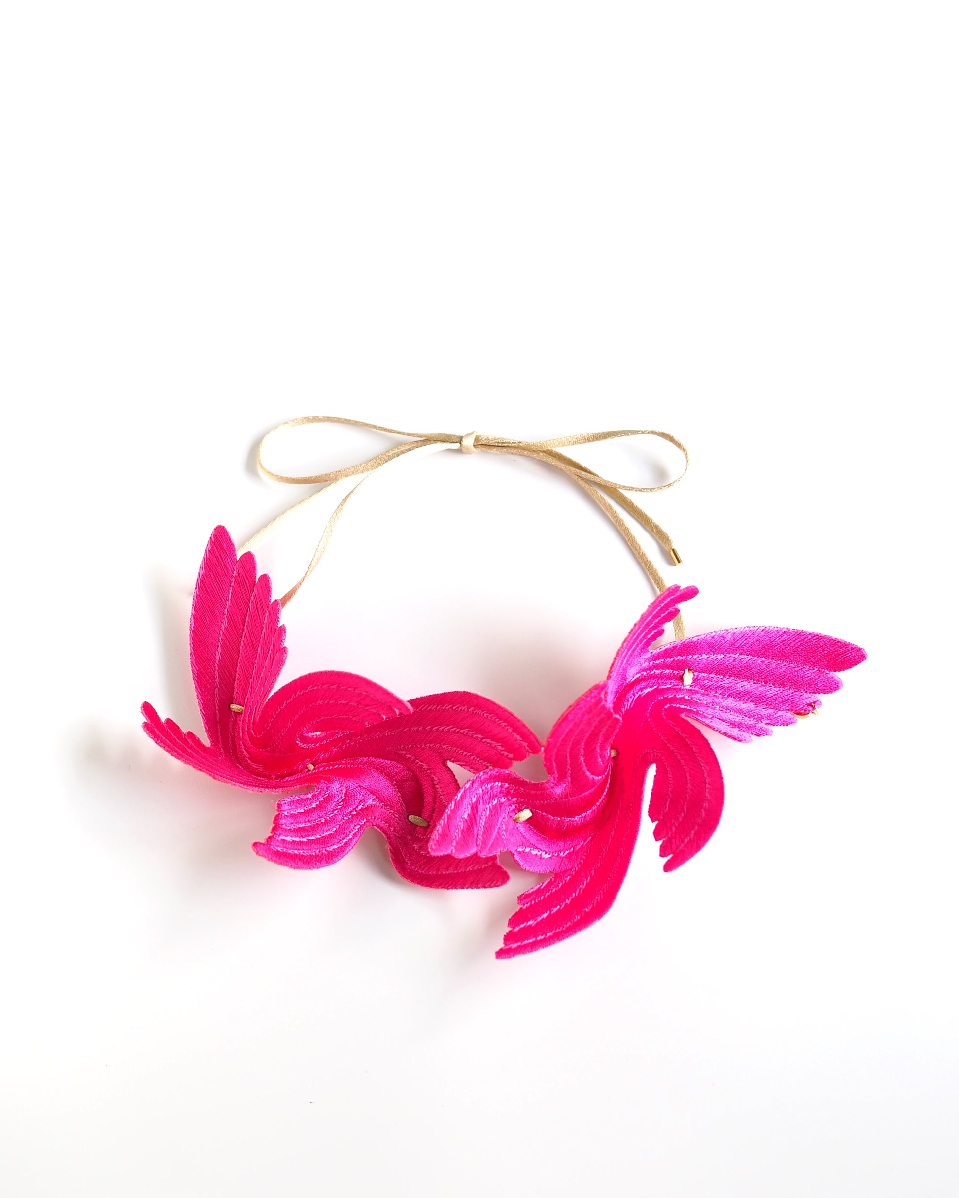 Designed to bring happiness to its wearers, this series of large, flamboyant bird motif accessories exudes elegance and charm. The dynamic design, achieved by adding folds to a single embroidered flat piece, creates a three-dimensional effect that mimics the graceful flight of a bird. The back side is made of velvet, providing a soft and gentle touch against the skin.