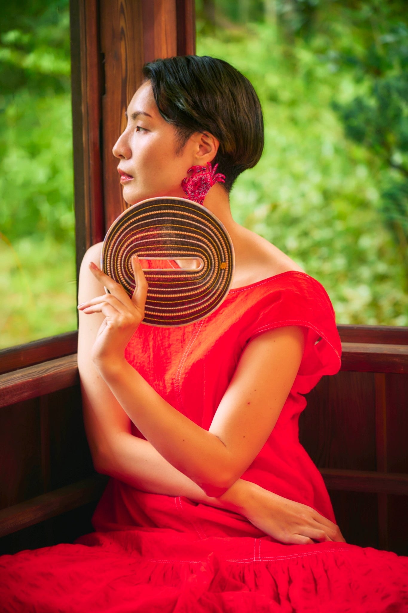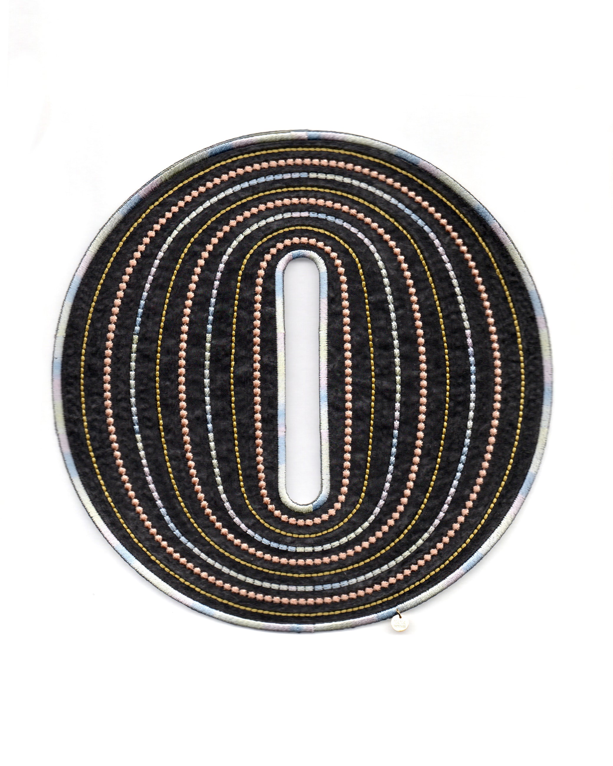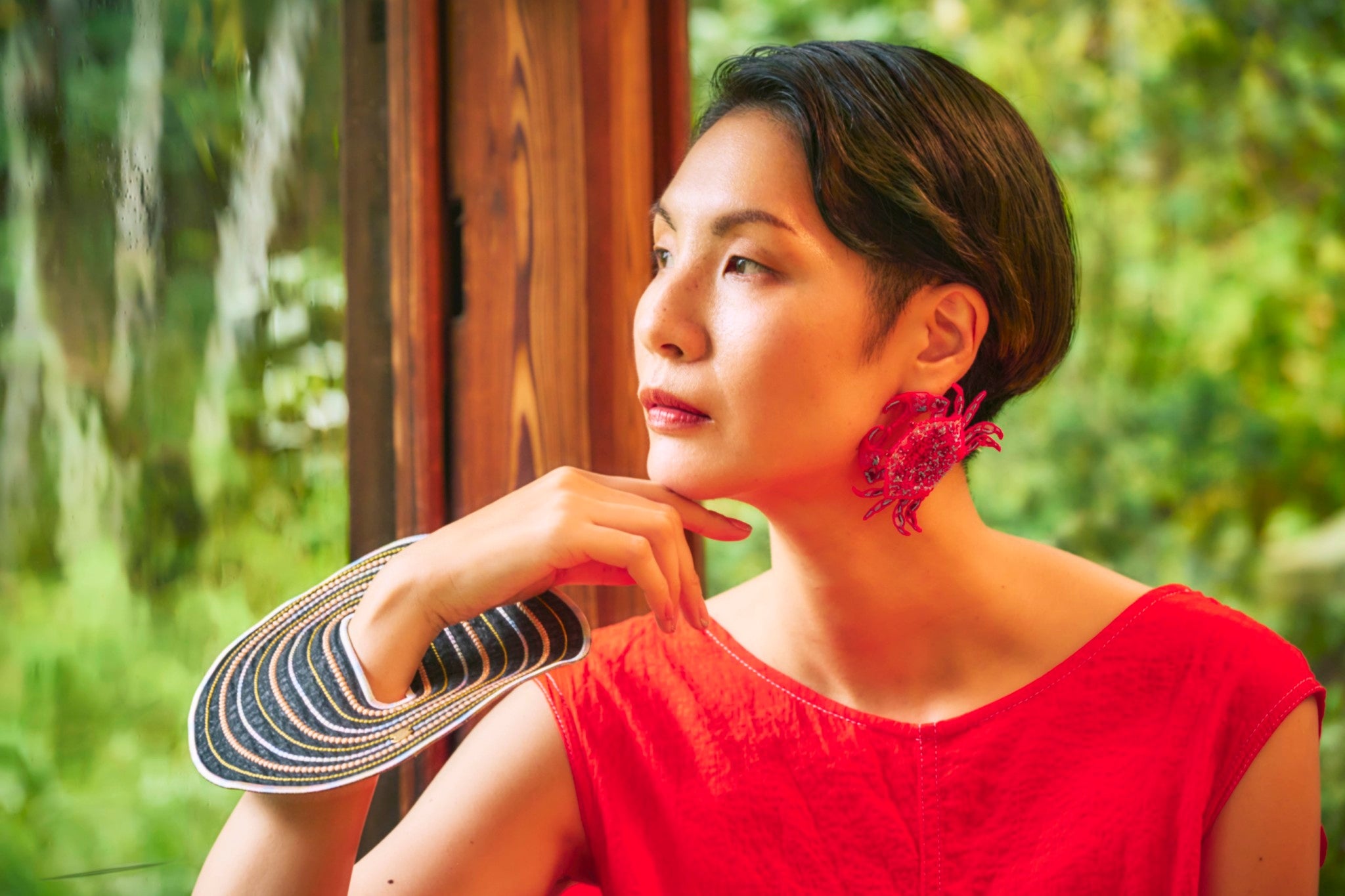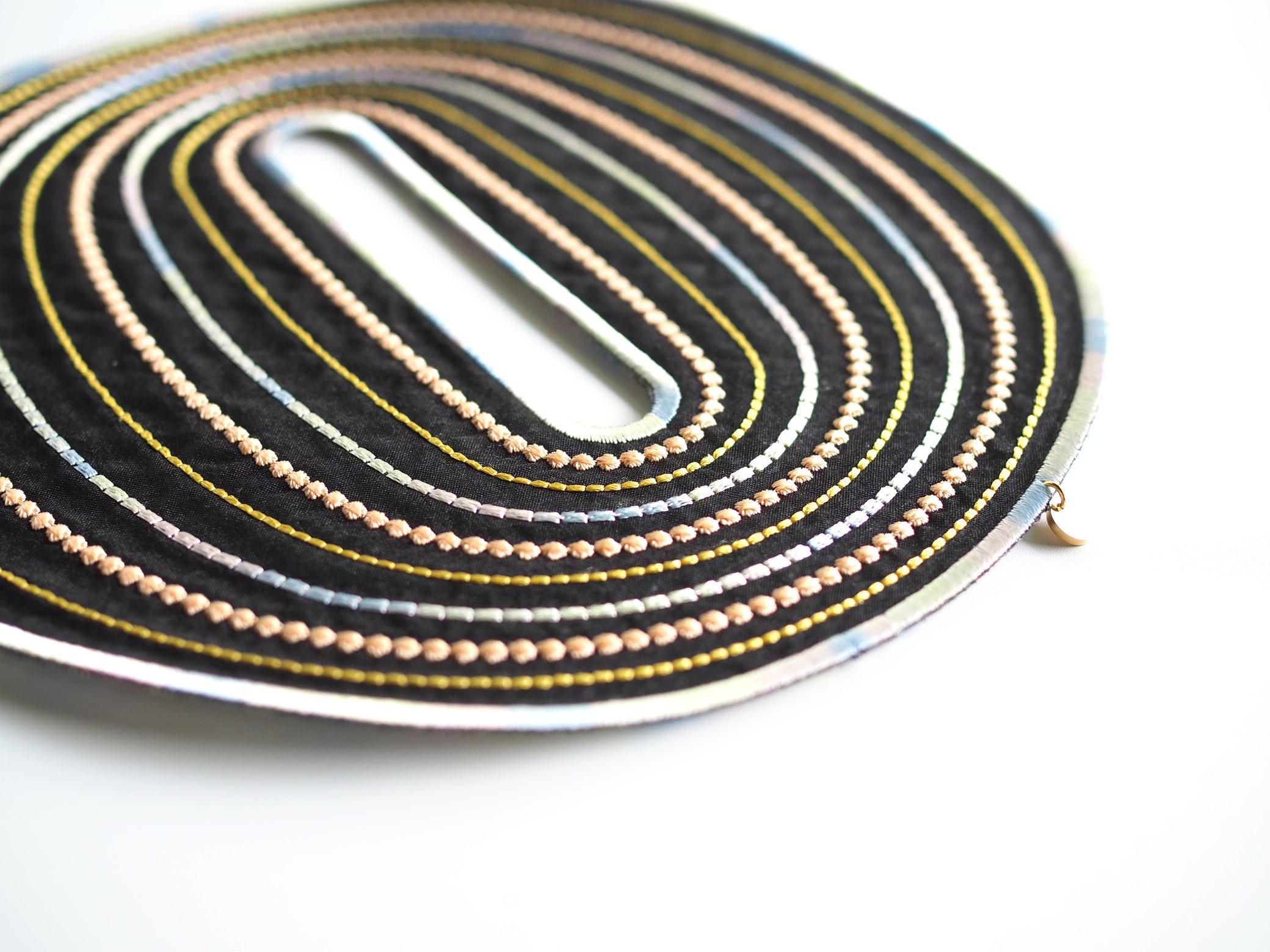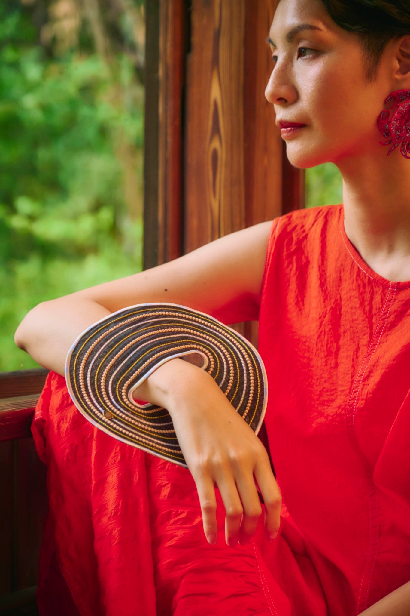 An artful bangle embroidered with rayon thread on recycled polyester organza. Its translucent lightness and vibrant colors create a striking, graphic presence on your wrist. Despite its bold scale, the piece is lightweight at only 19g, ensuring comfortable wear for extended periods.