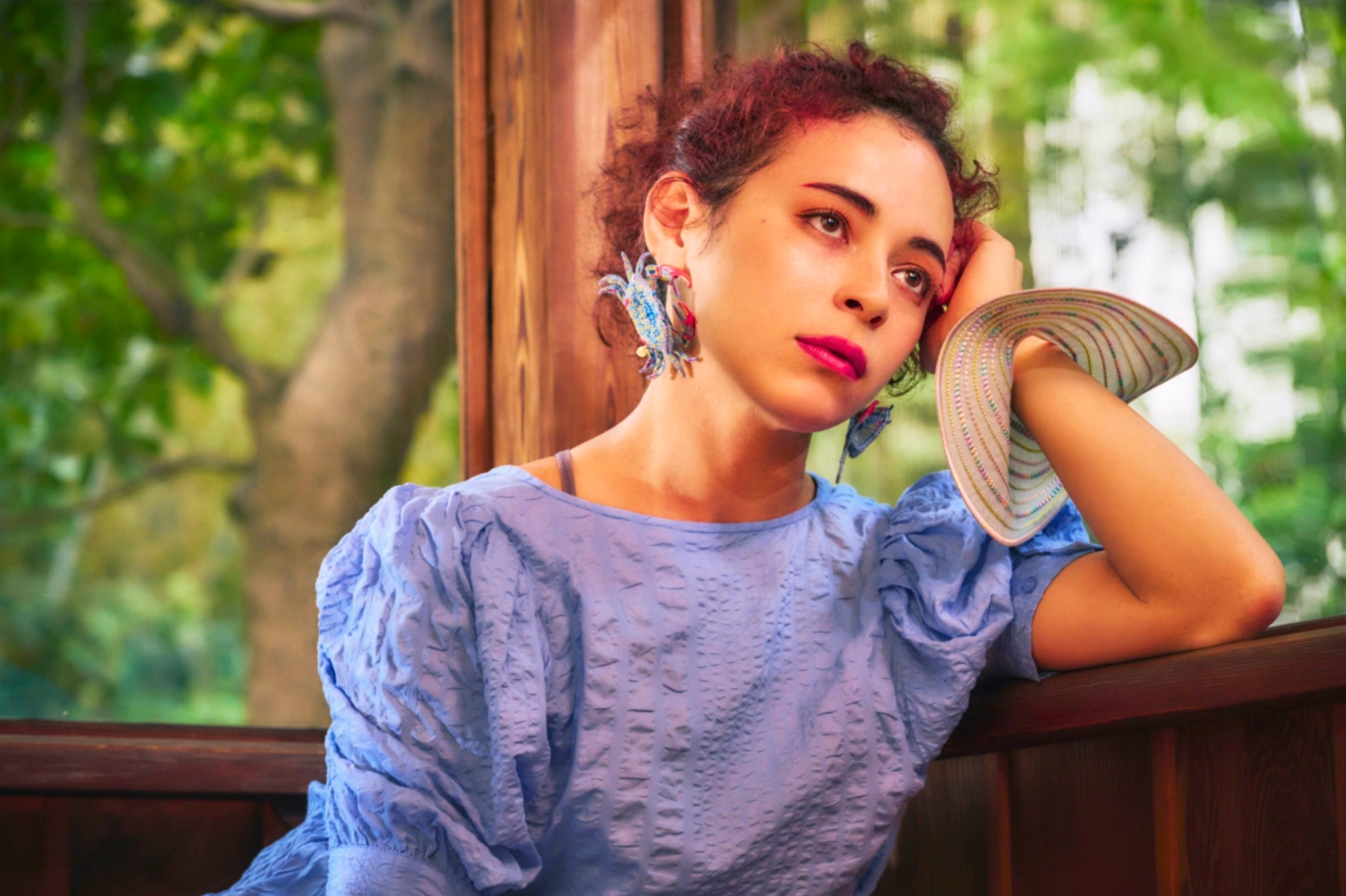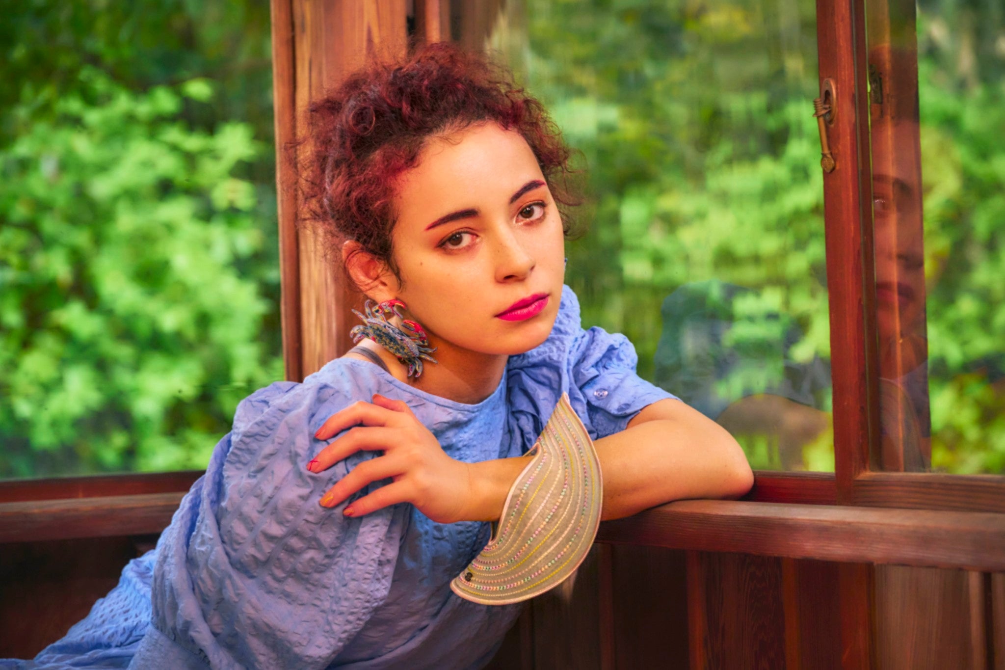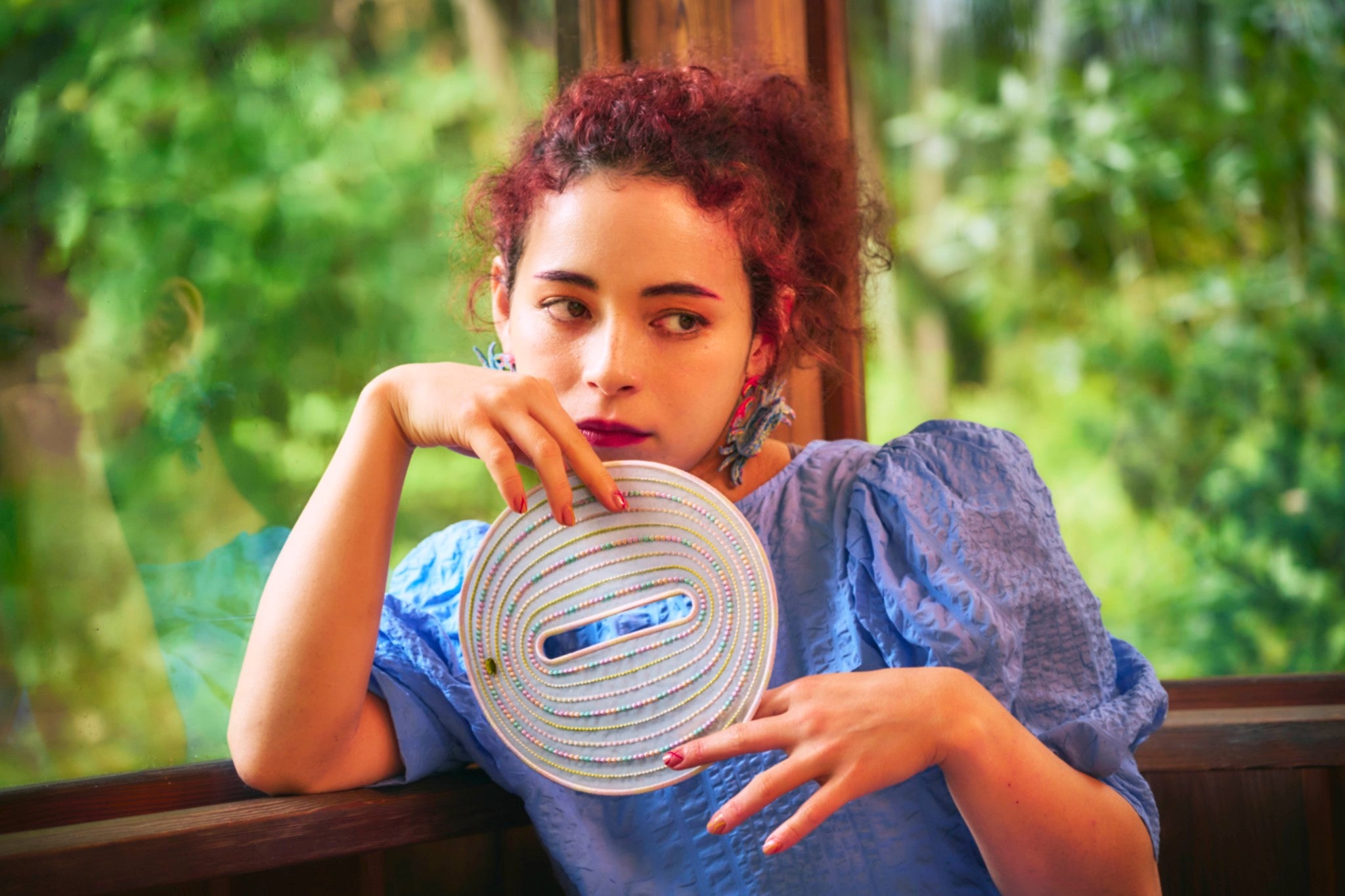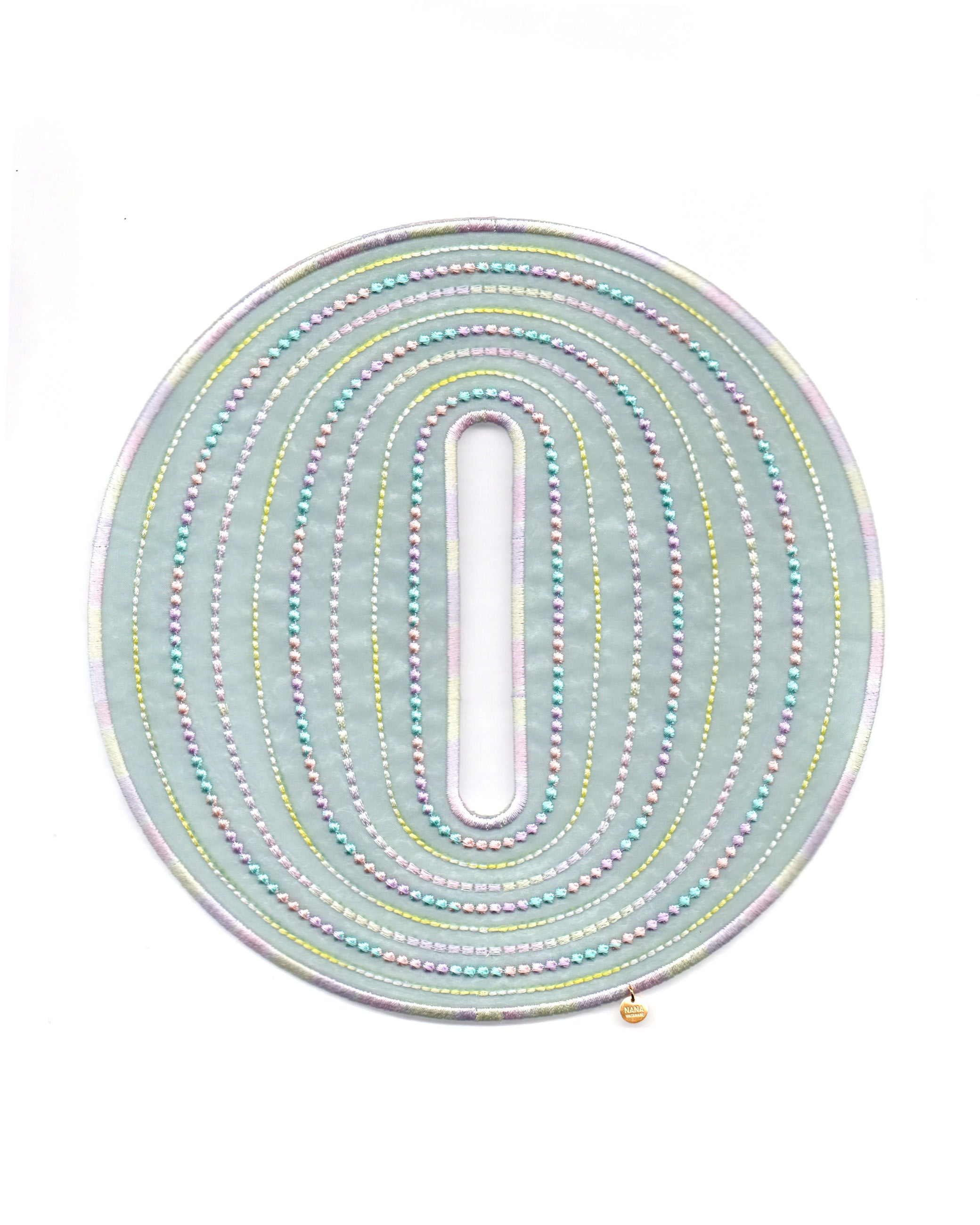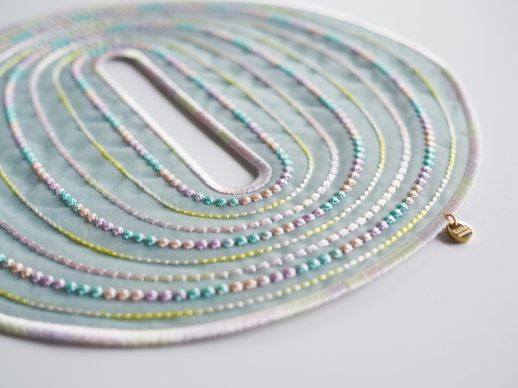 An artful bangle embroidered with rayon thread on recycled polyester organza. Its translucent lightness and vibrant colors create a striking, graphic presence on your wrist. Despite its bold scale, the piece is lightweight at only 19g, ensuring comfortable wear for extended periods.