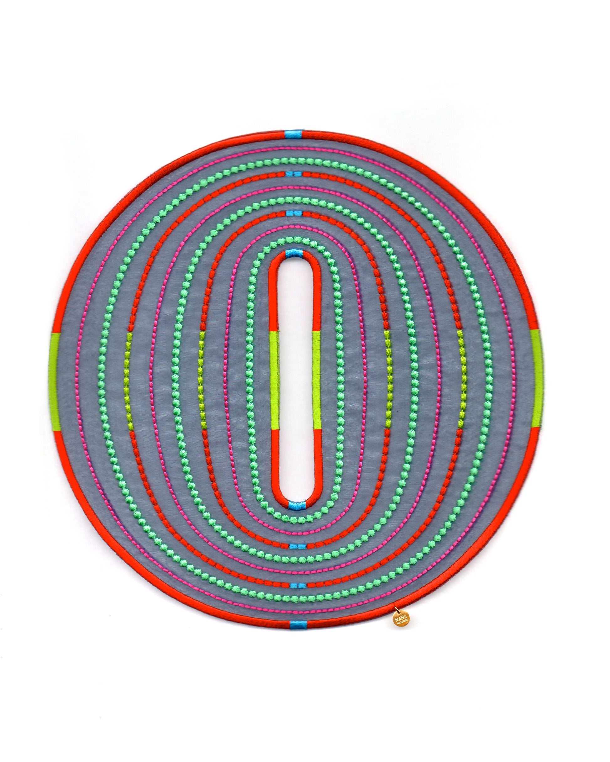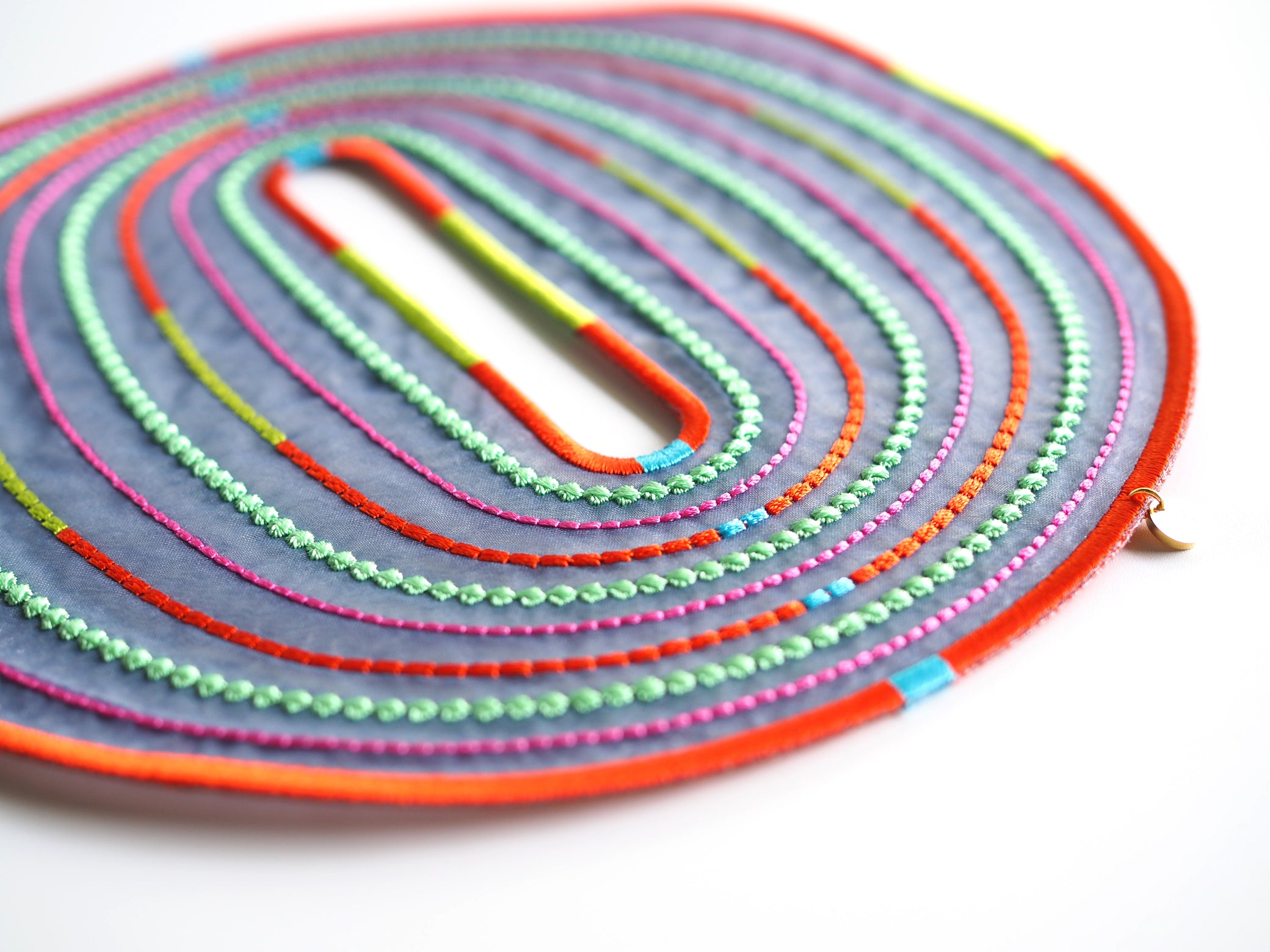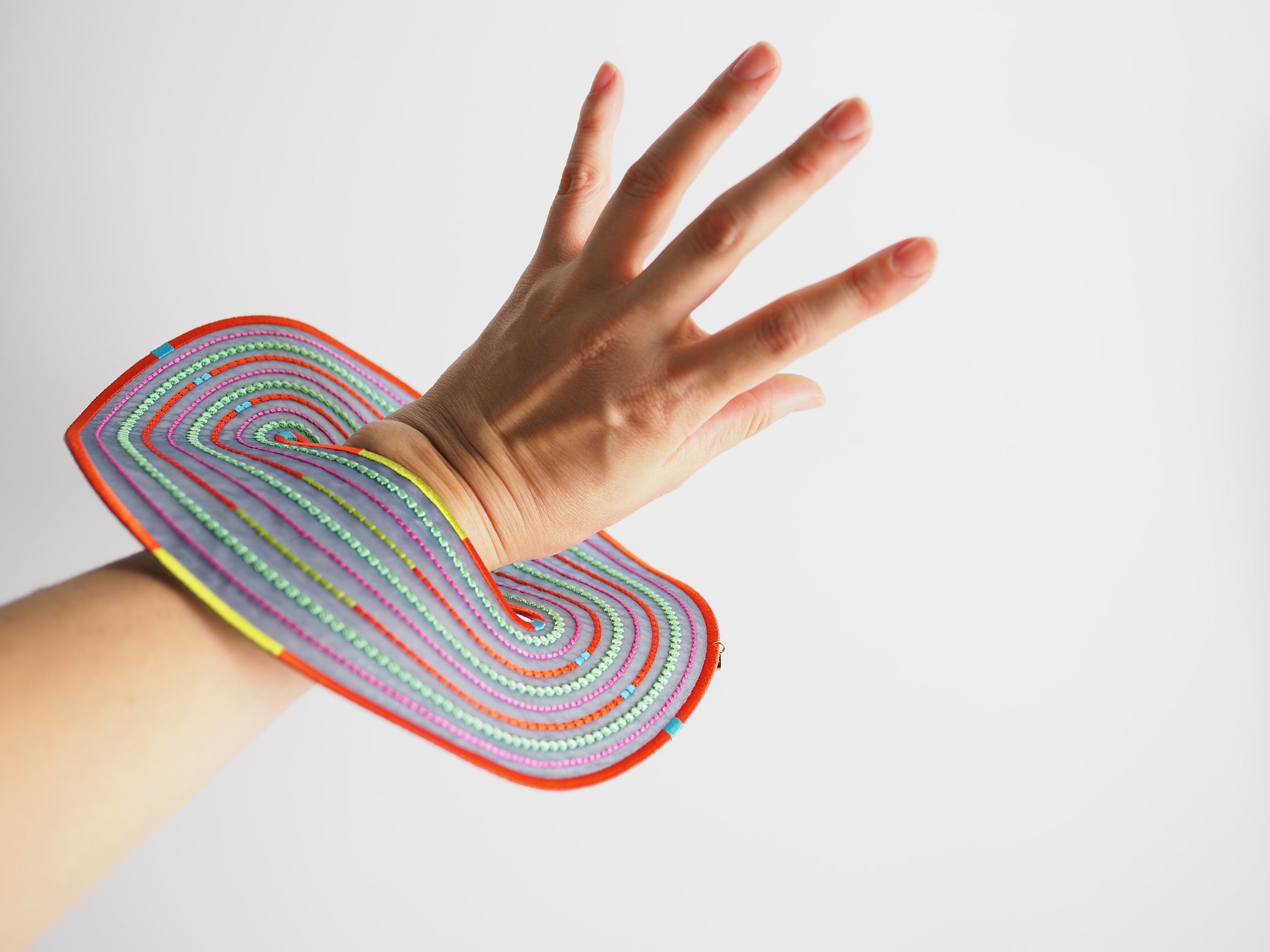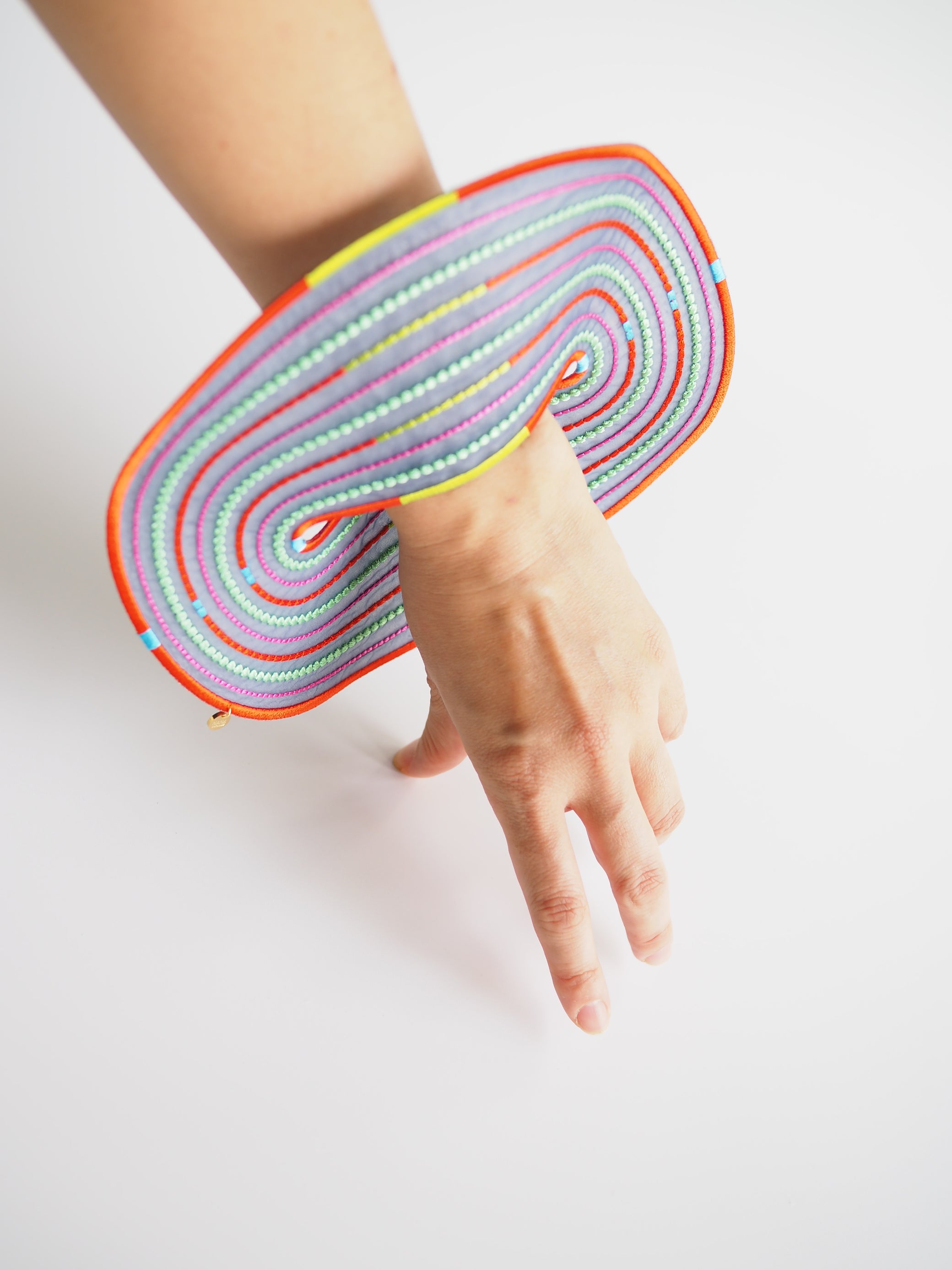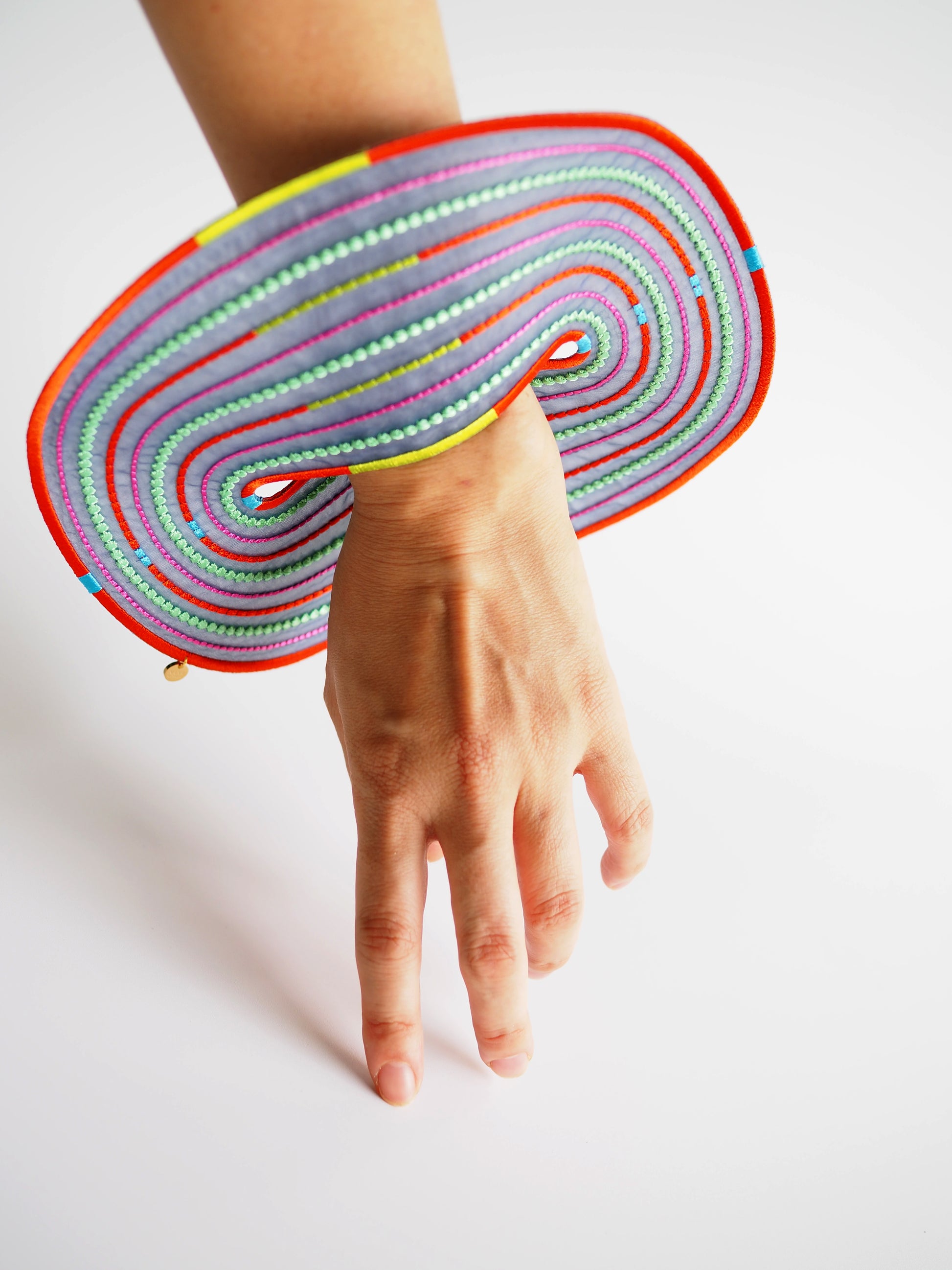 An artful bangle embroidered with rayon thread on recycled polyester organza. Its translucent lightness and vibrant colors create a striking, graphic presence on your wrist. Despite its bold scale, the piece is lightweight at only 19g, ensuring comfortable wear for extended periods.