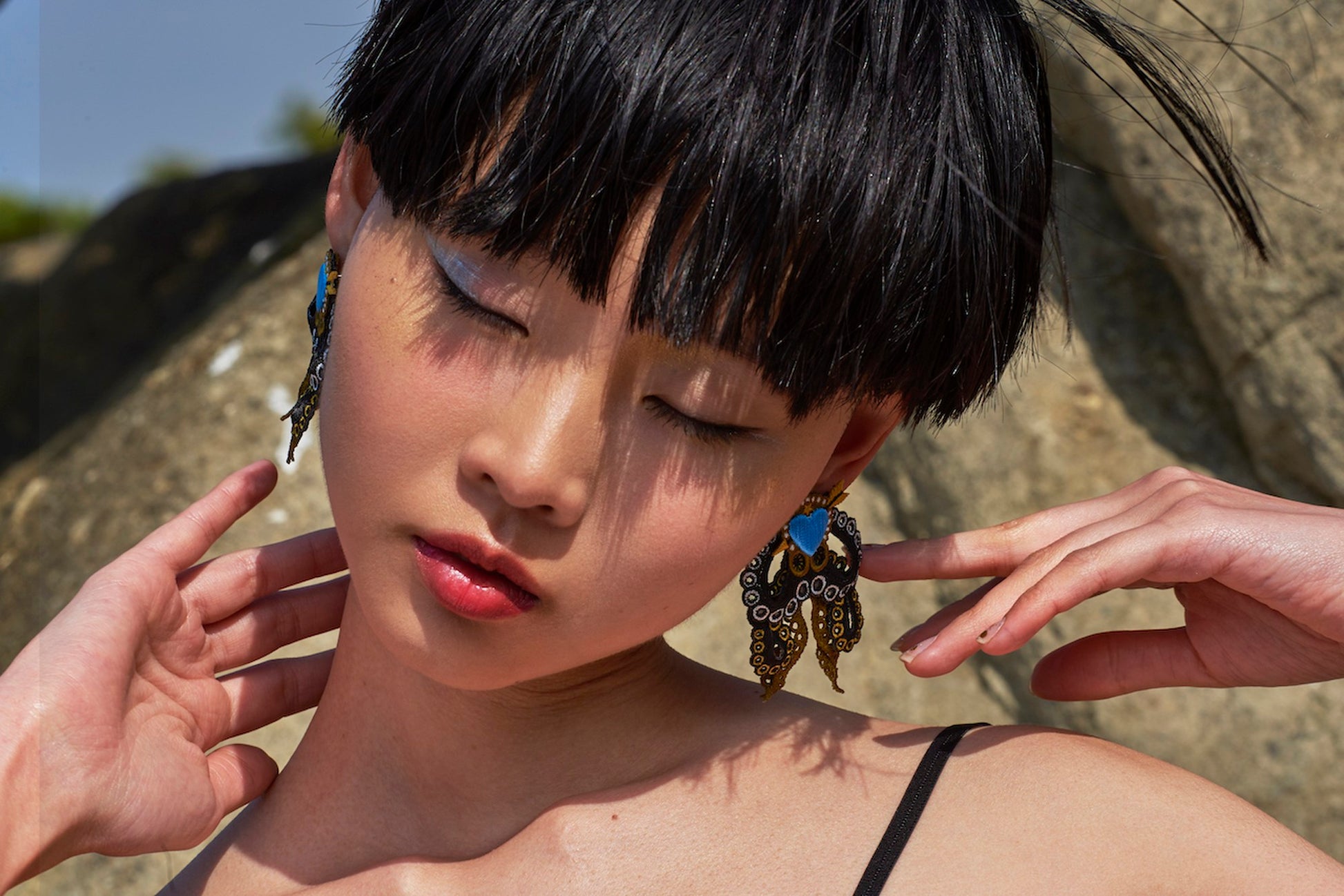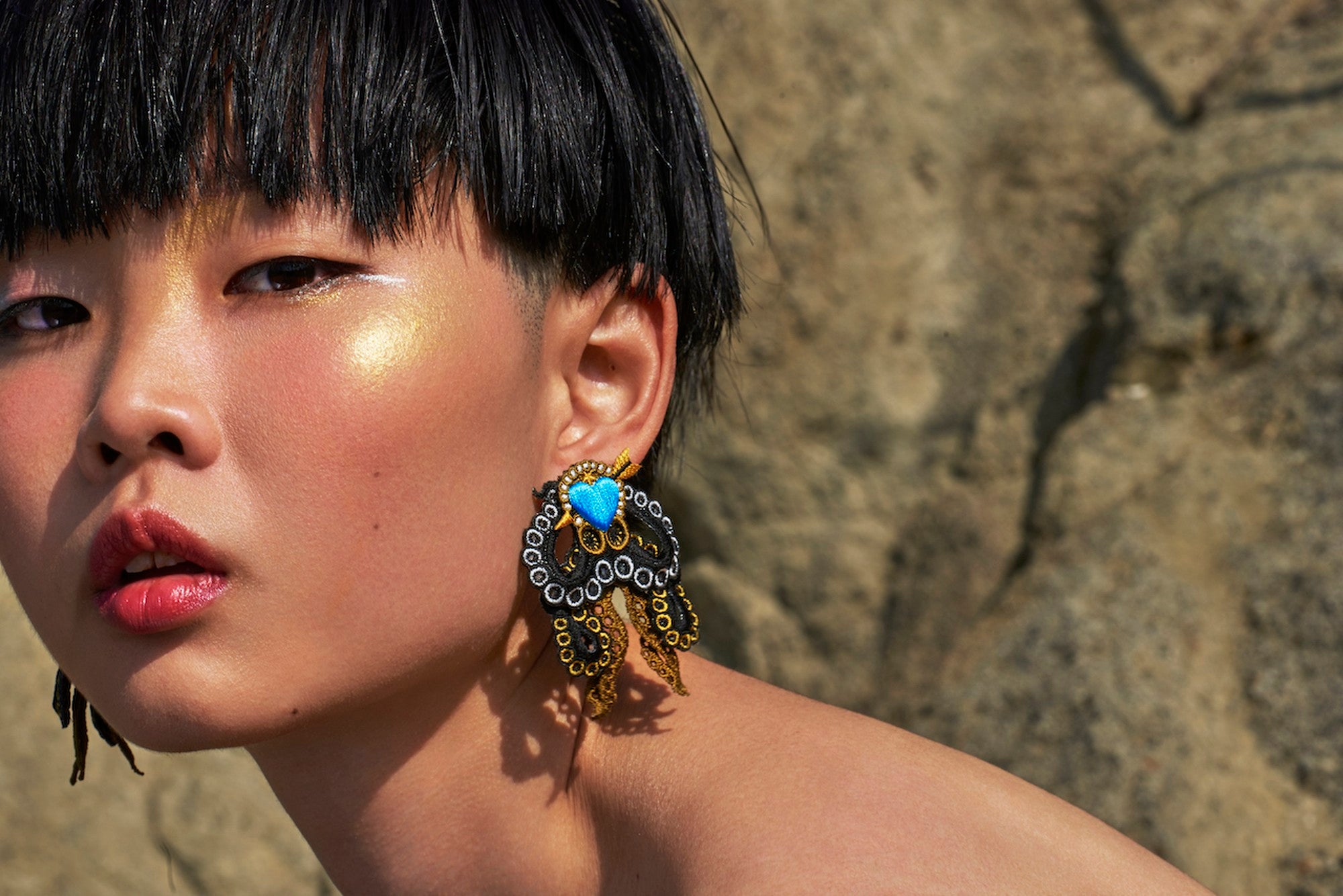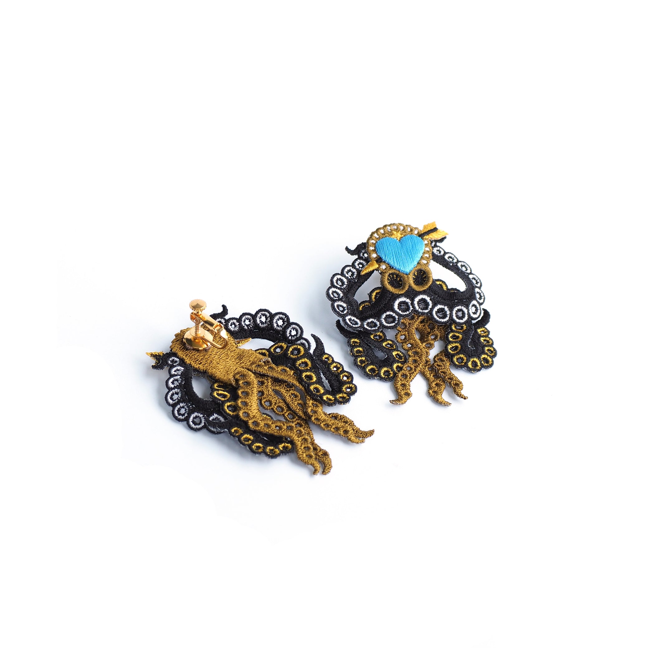 These earrings feature a unique design of a heart-shaped brain pierced by an arrow. They are crafted with fabric embroidery, and the heart part is filled with foam to create a puffy, 3D effect. This playful design adds a touch of fun and creativity to any outfit.