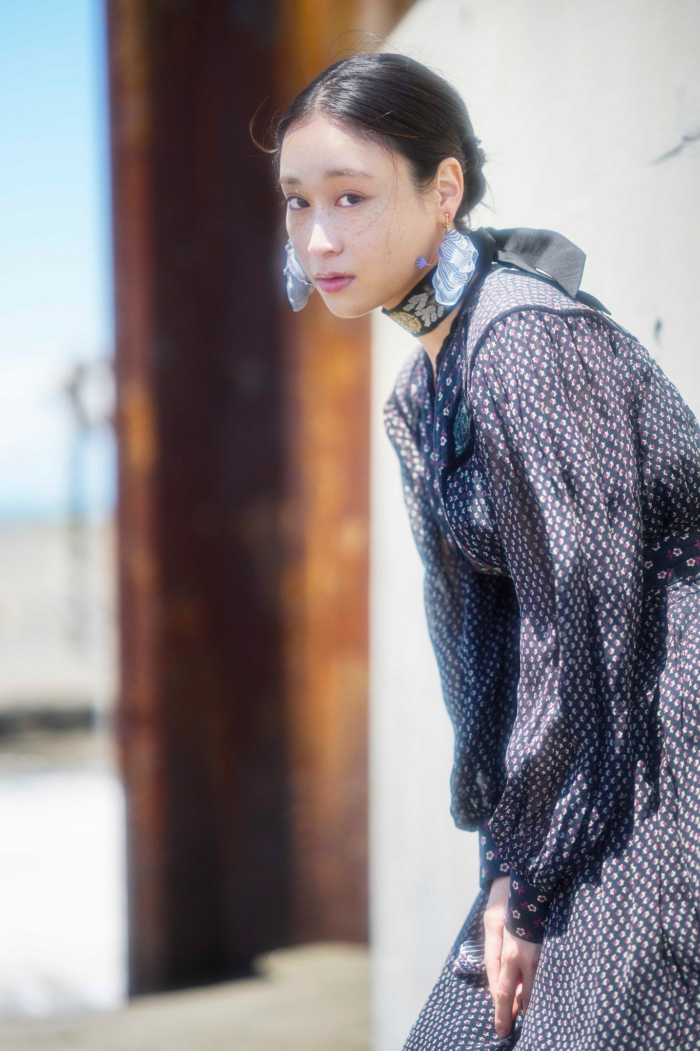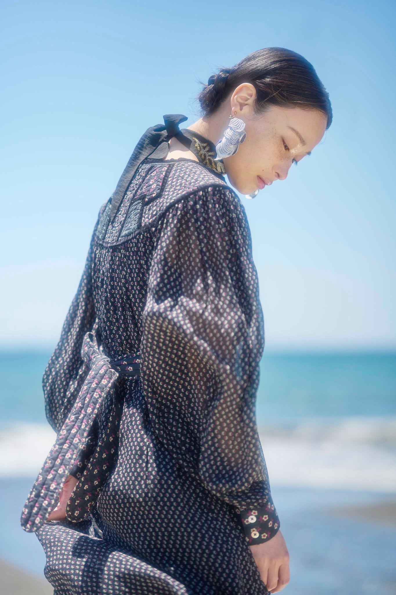 These earrings are designed with motifs of shells and fairy hands, symbolizing the birth of something new. They feature embroidered organza with a translucent effect and a rounded shape, providing a unique and elegant look.