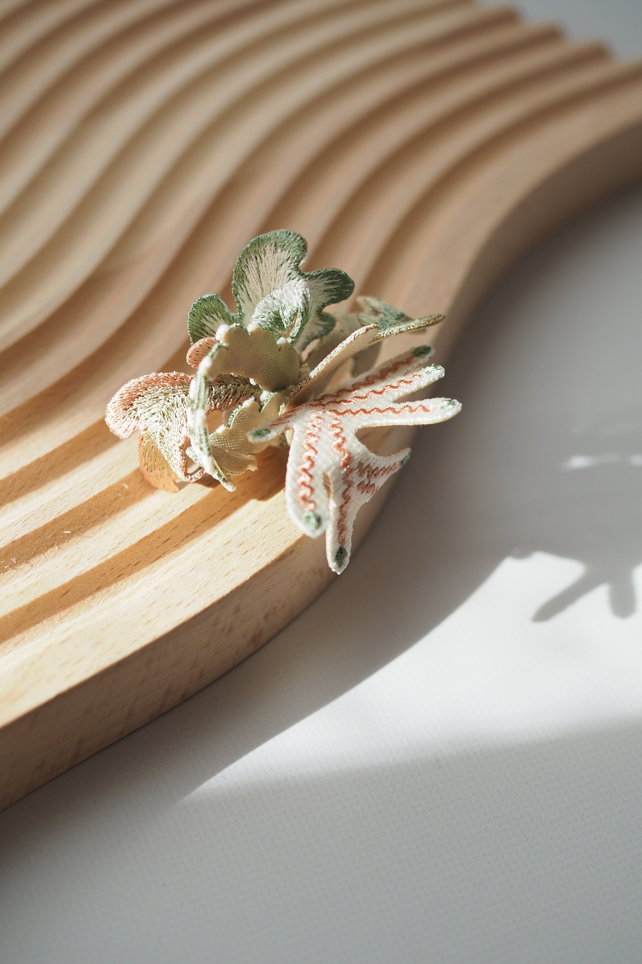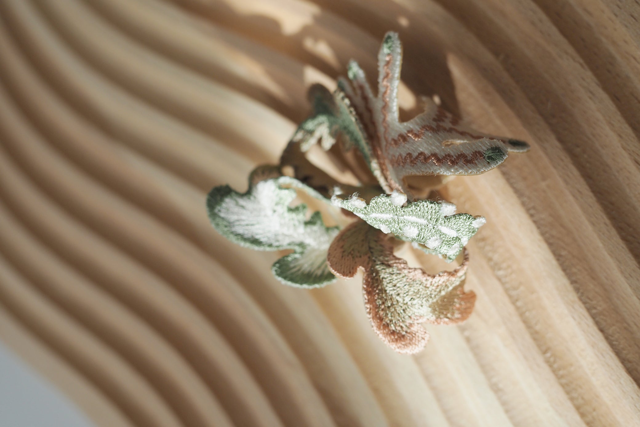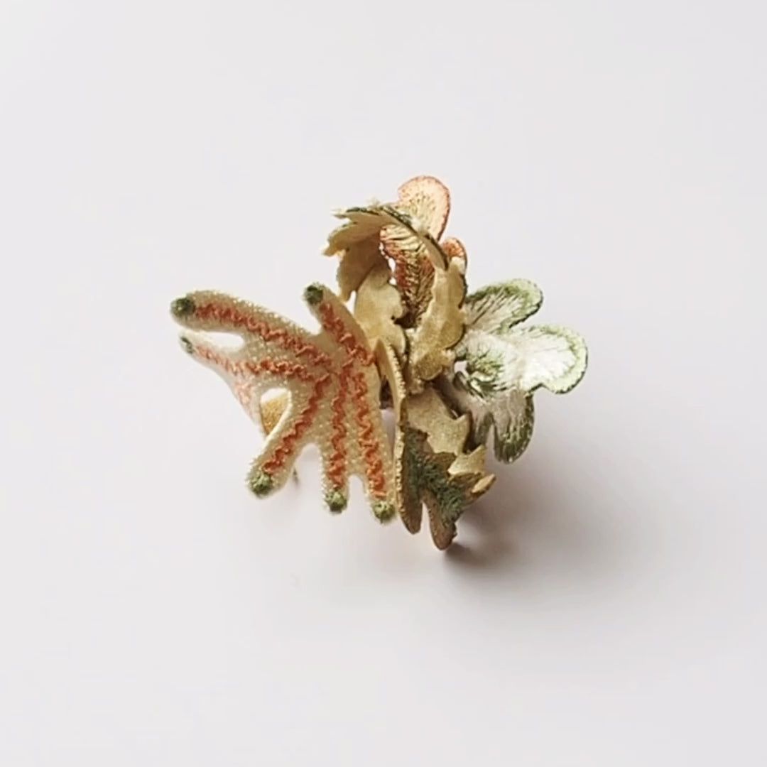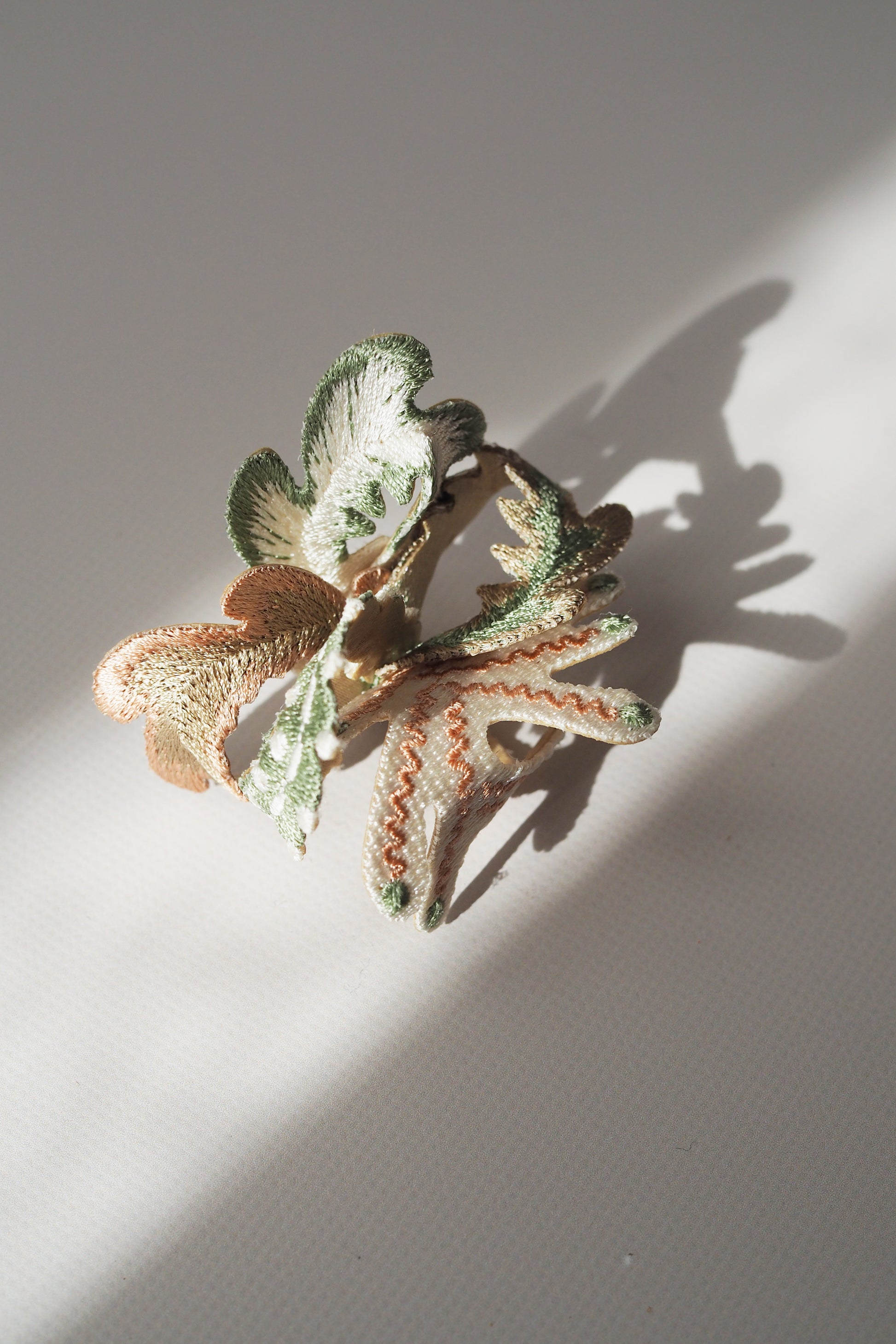 Inspired by wetland plants such as ferns and mosses, this embroidered accessory showcases a unique design. The embroidered pieces are cut and assembled to create a three-dimensional and dynamic form. Its voluminous silhouette adds a striking accent to any outfit.