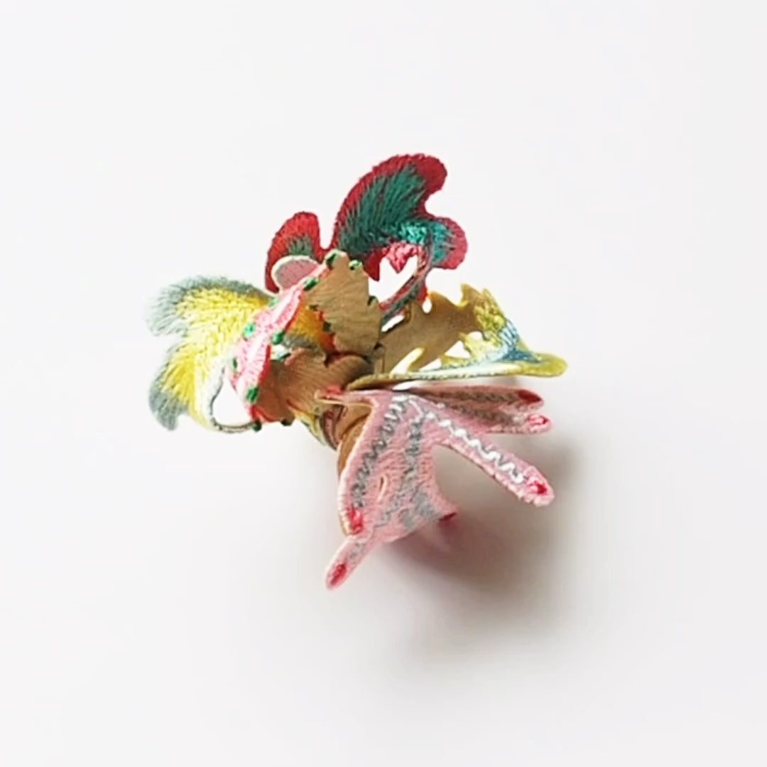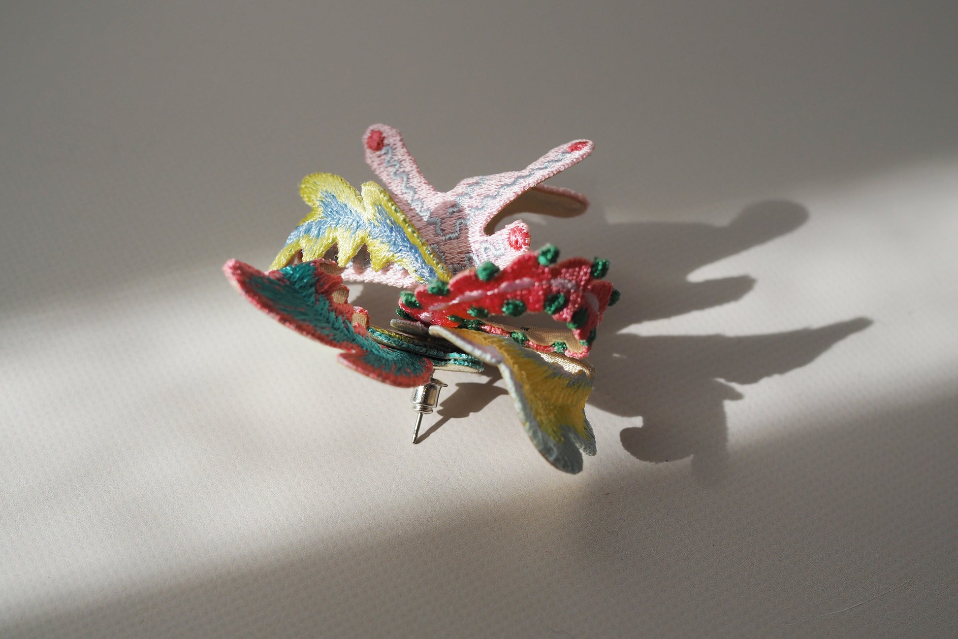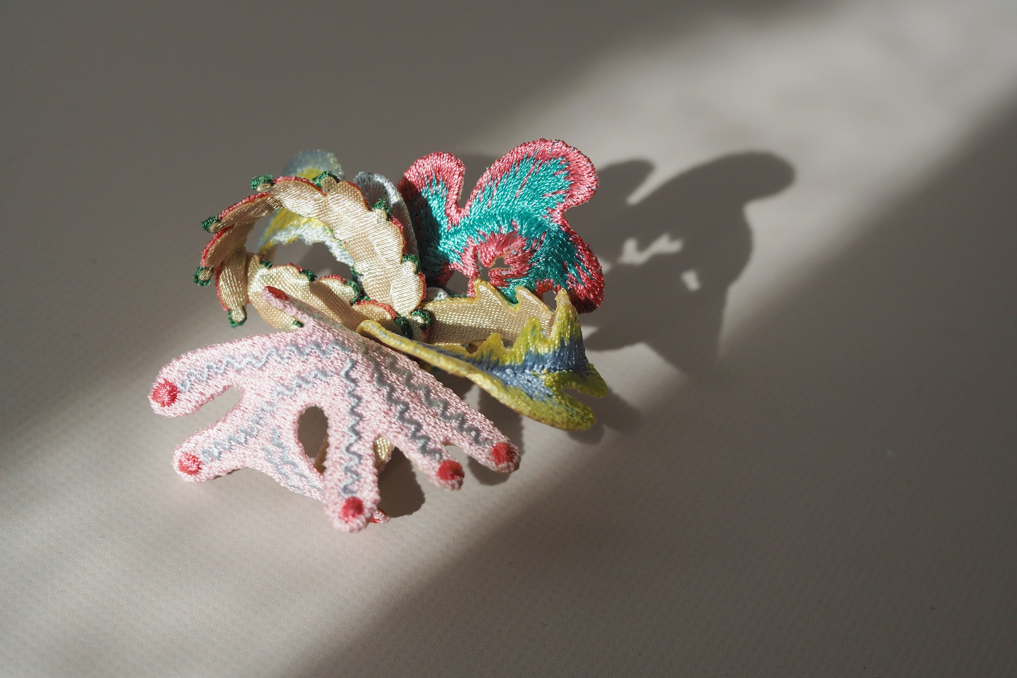 Inspired by wetland plants such as ferns and mosses, this embroidered accessory showcases a unique design. The embroidered pieces are cut and assembled to create a three-dimensional and dynamic form. Its voluminous silhouette adds a striking accent to any outfit.
