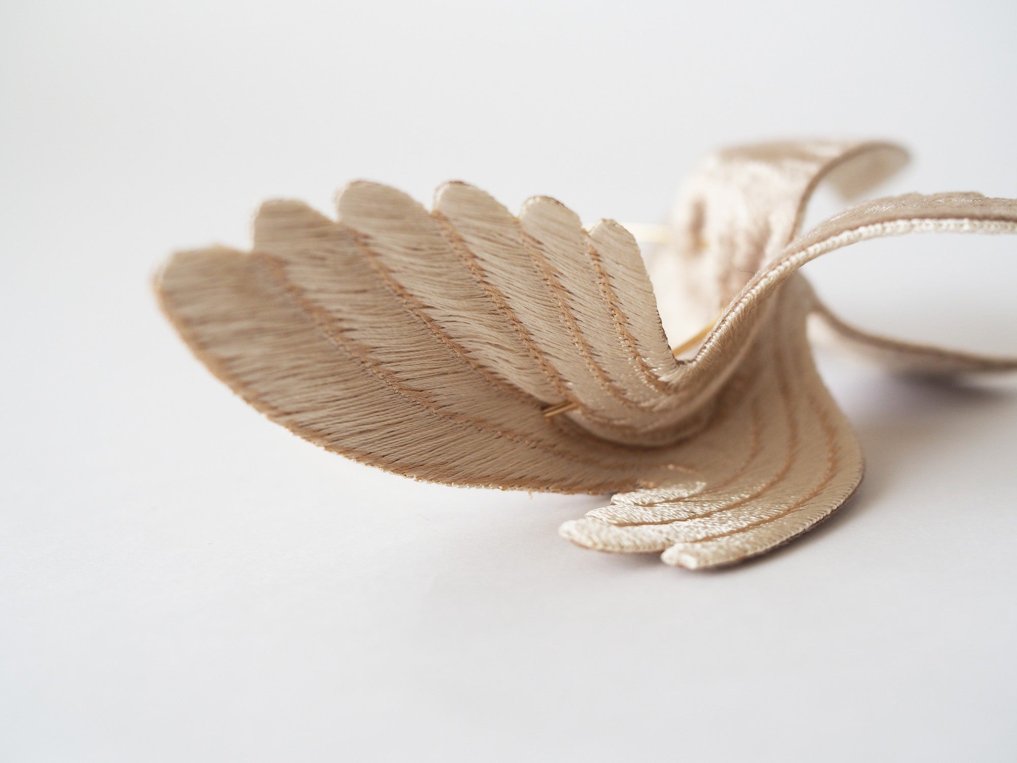 Designed to bring happiness to its wearers, this series of large, flamboyant bird motif accessories exudes elegance and charm. The dynamic design, achieved by adding folds to a single embroidered flat piece, creates a three-dimensional effect that mimics the graceful flight of a bird. The back side is made of velvet, providing a soft and gentle touch against the skin.