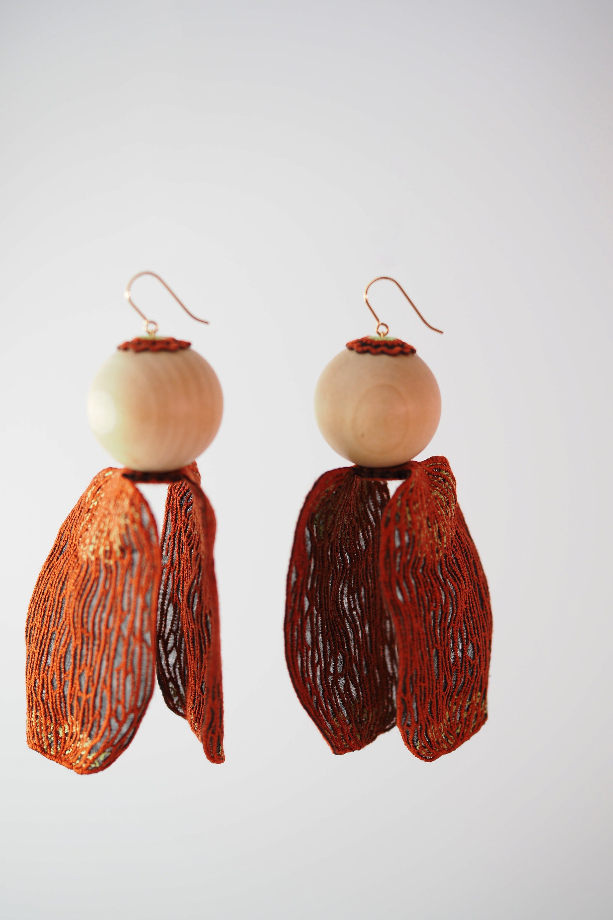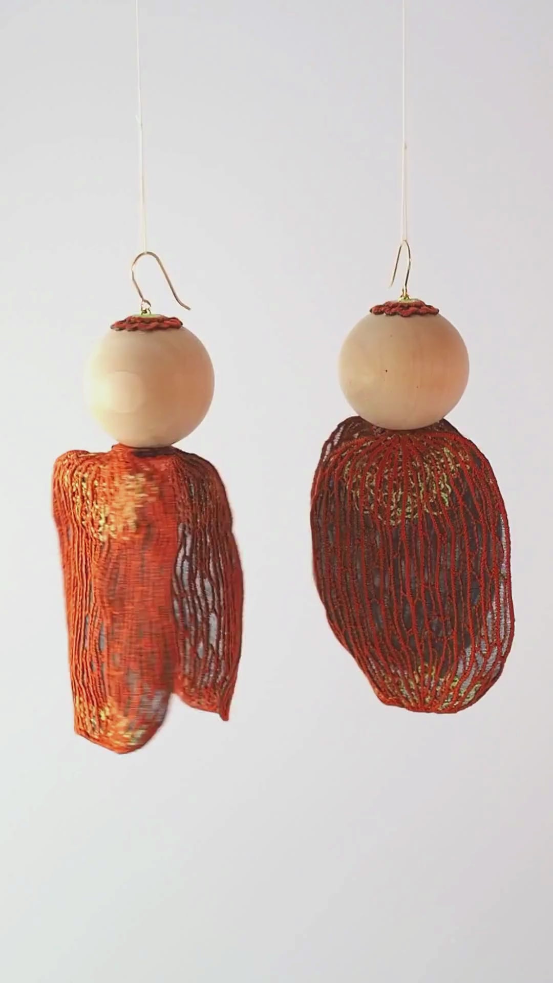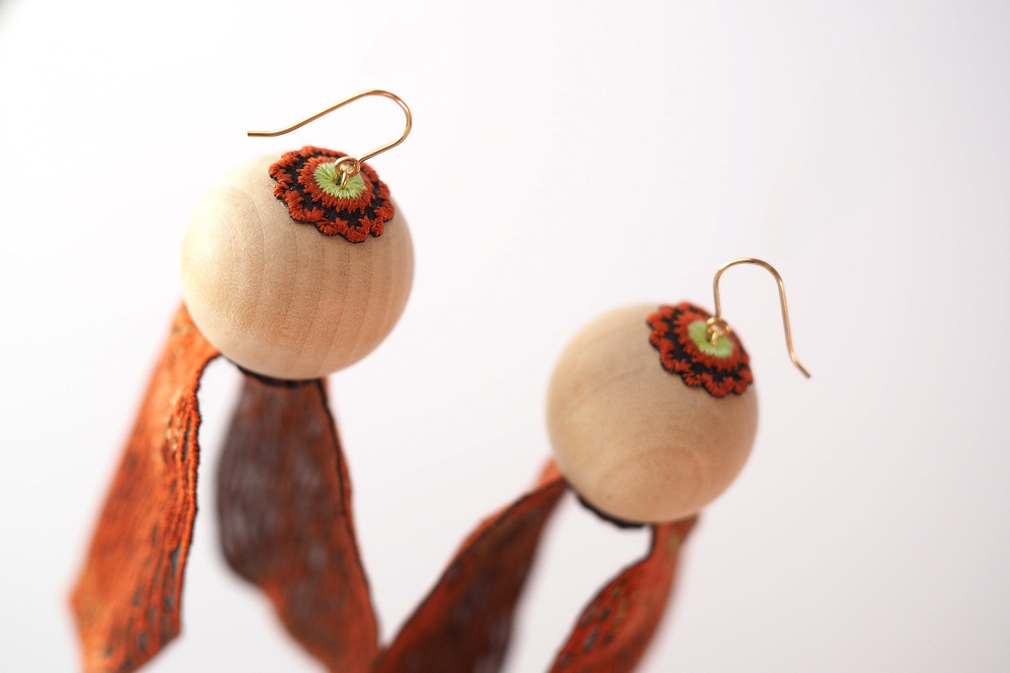 A beautiful design, contrasting large wooden beads with delicate embroidery.