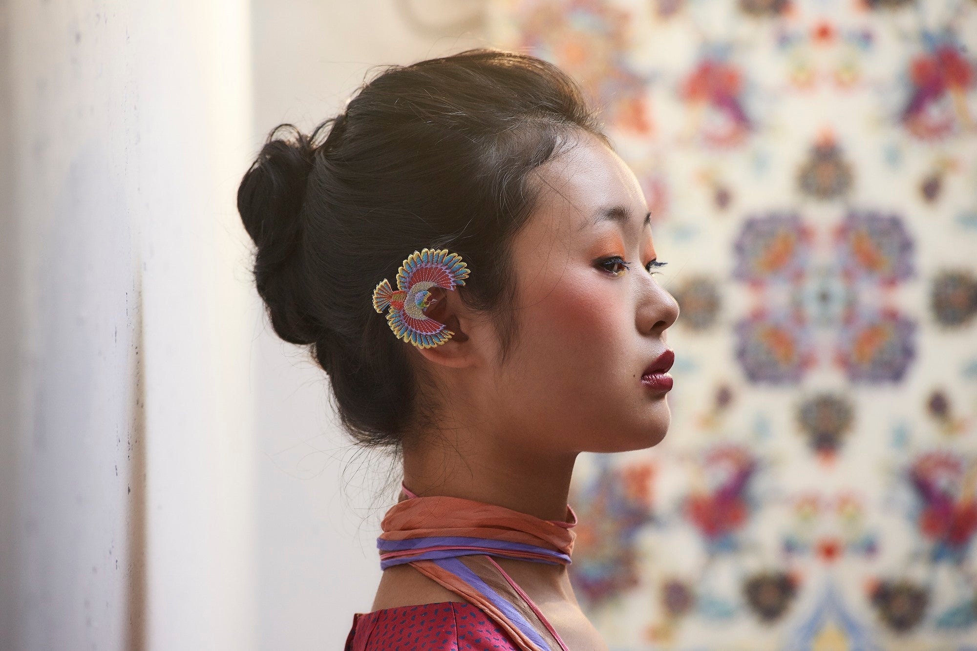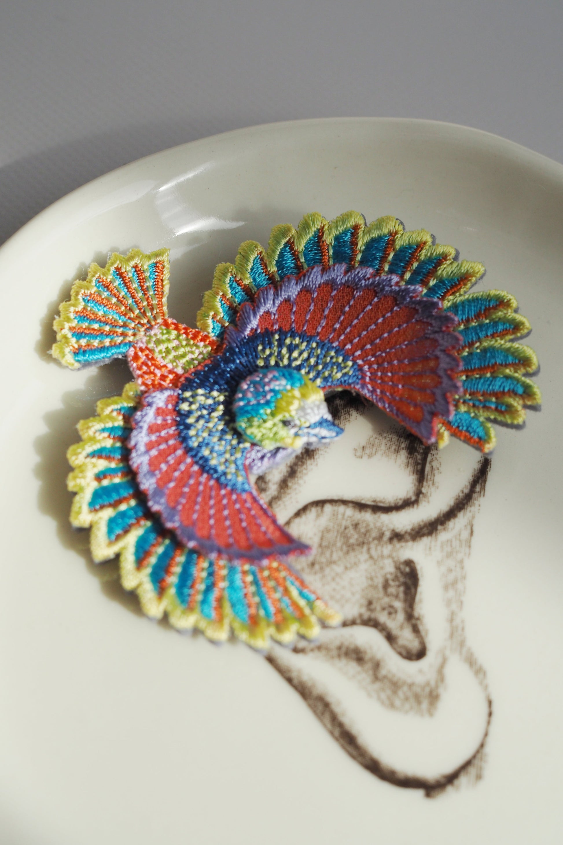 立体感のある刺繍のイヤークリップ。カラフルな色がコーディネートのアクセントになります。 羽根の部分には薄いシフォンを使い、軽さを出しました。