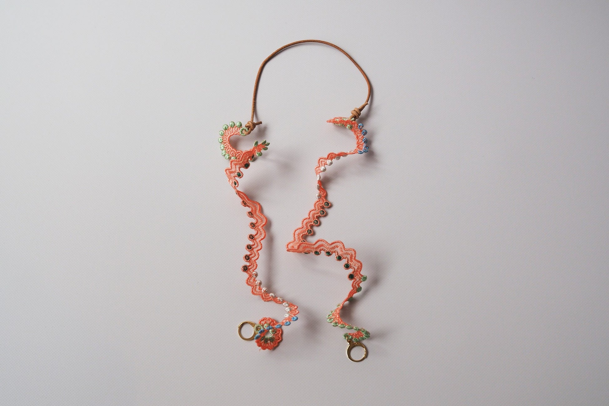 お顔周りに使うものなので、マスクストラップの金具はステンレス、紐部分はレザーを使用し、アレルギーが起きにくいようにデザインしています。