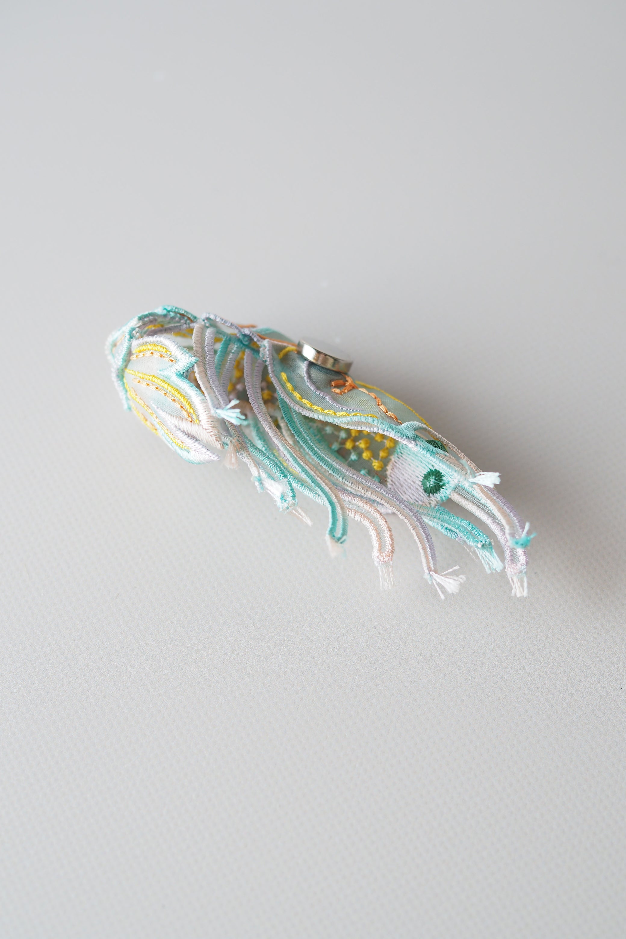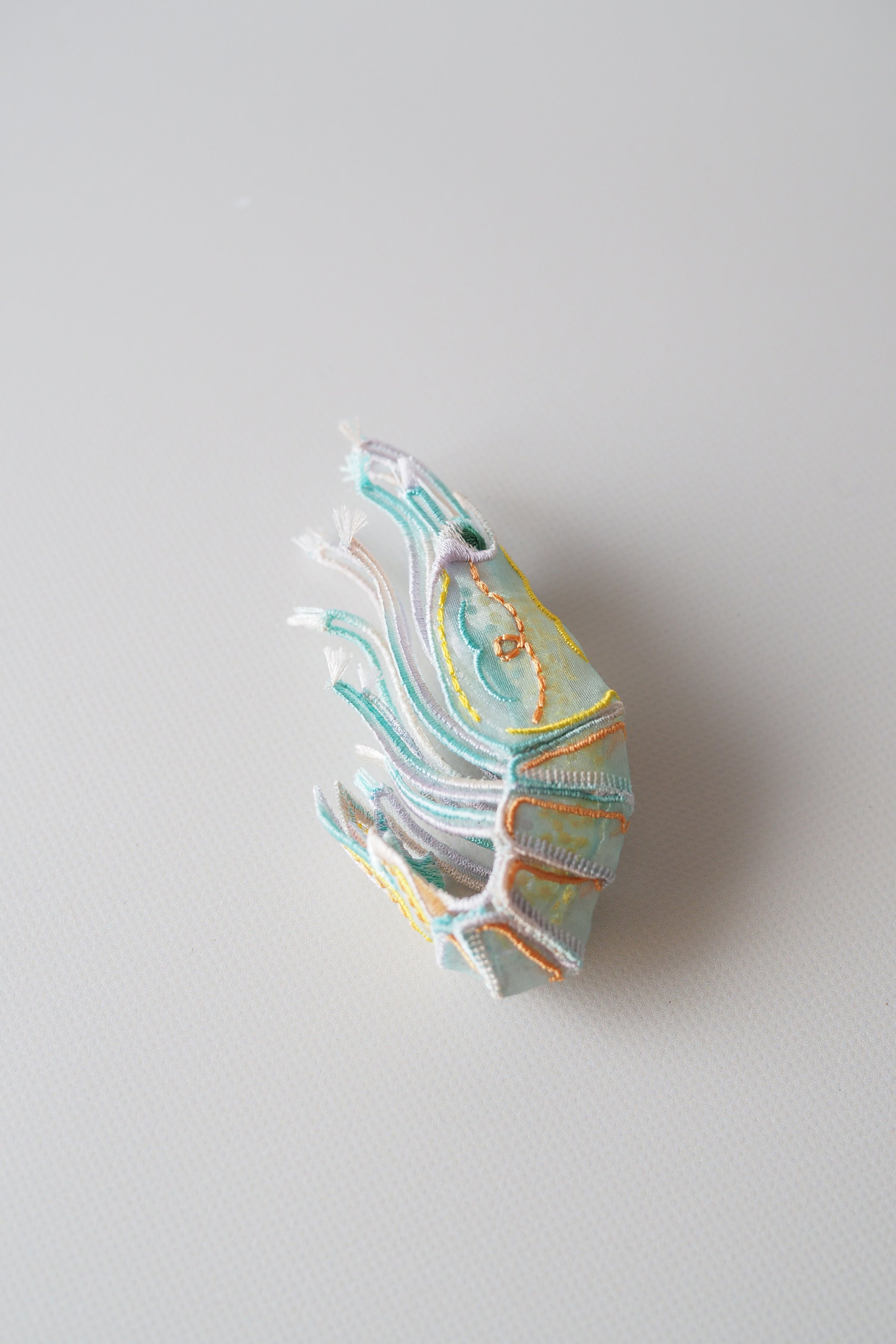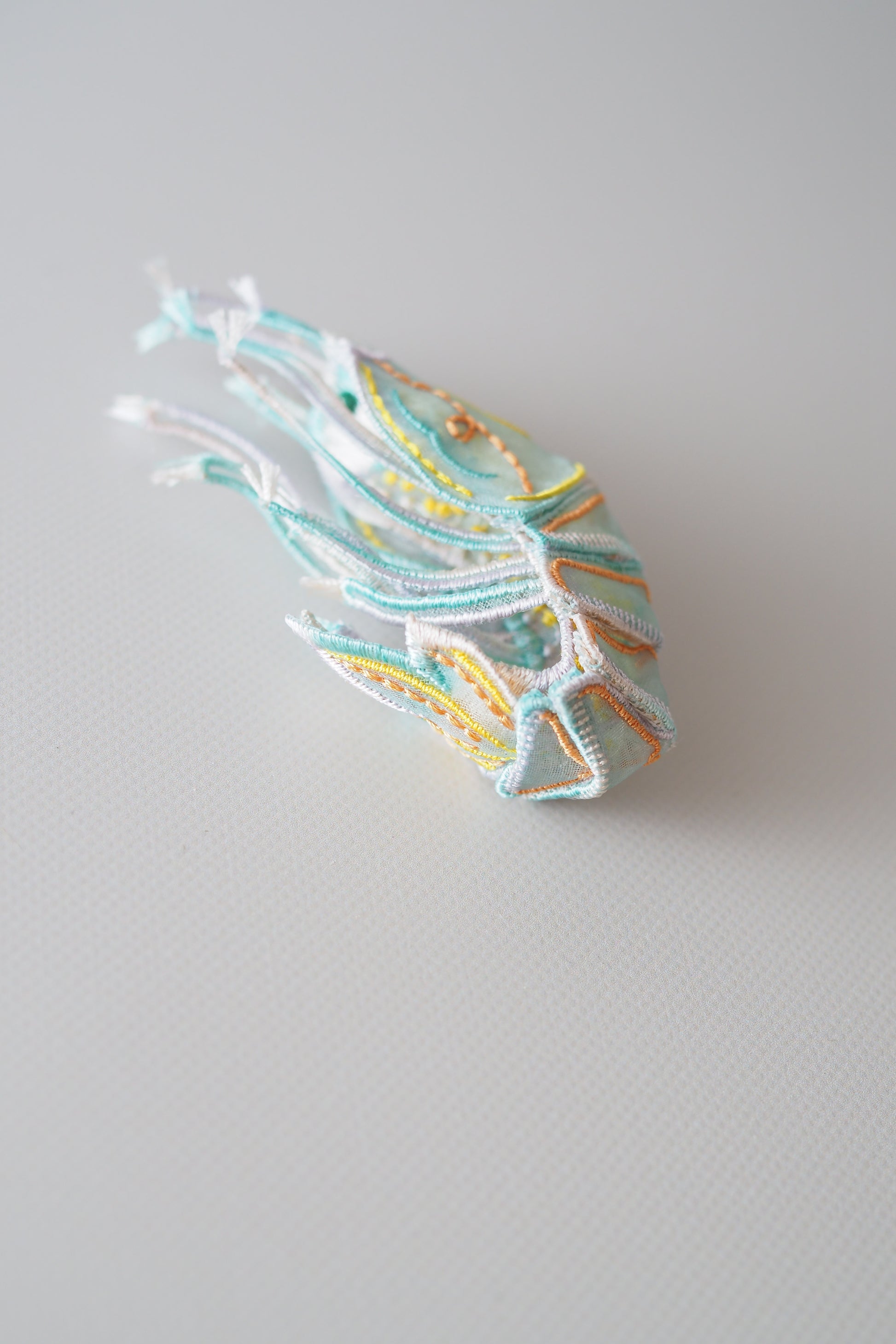 オーガンジー生地に刺繍してから輪郭に沿って裁断し、更に折り紙のように折りたたんで立体感を出している。