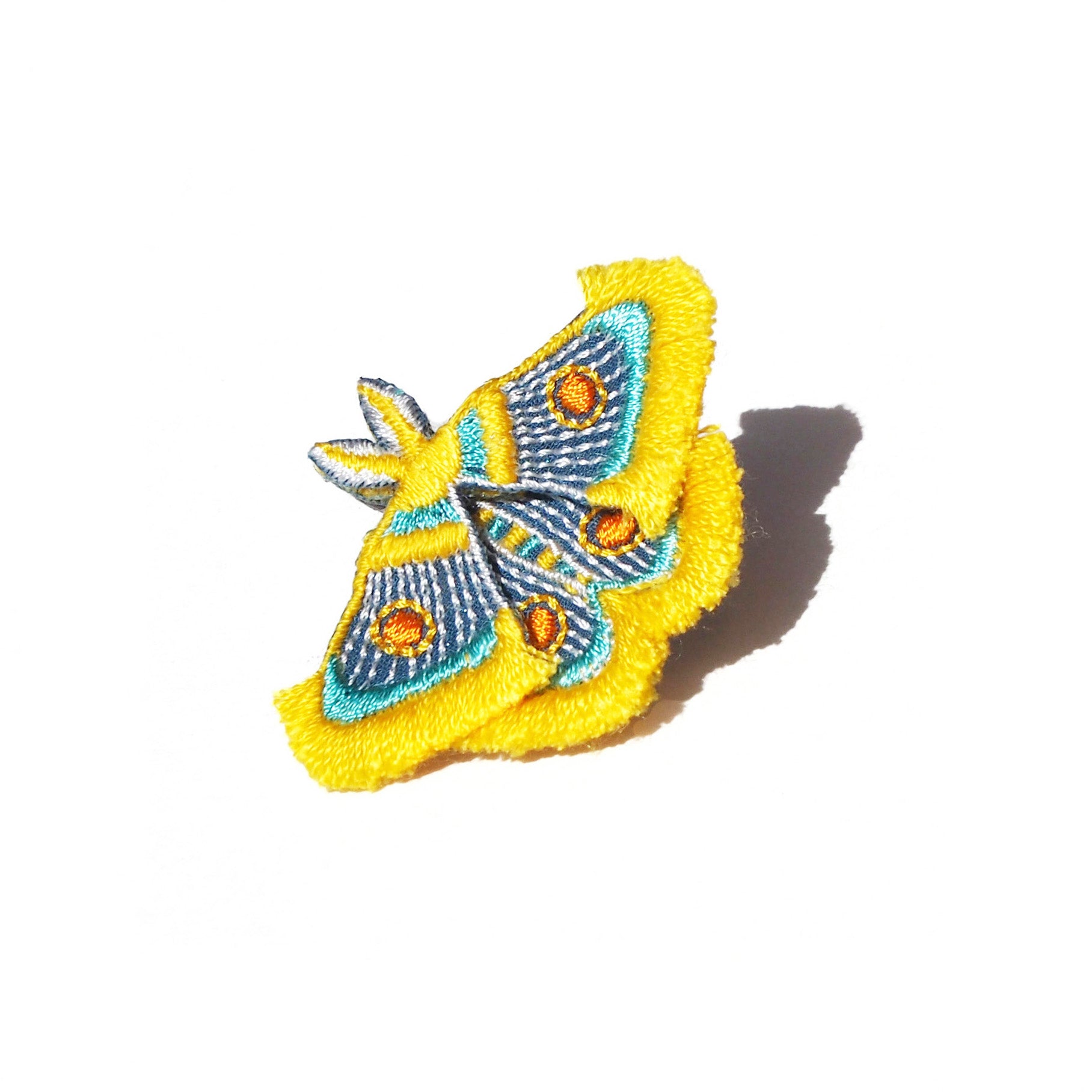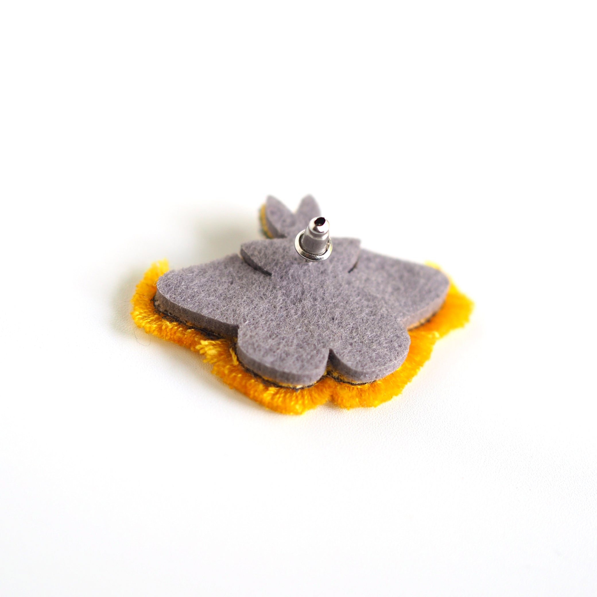 色鮮やかな蛾の美しさにインスピレーションを得て、立体的な刺繍で作ったイヤークリップです。