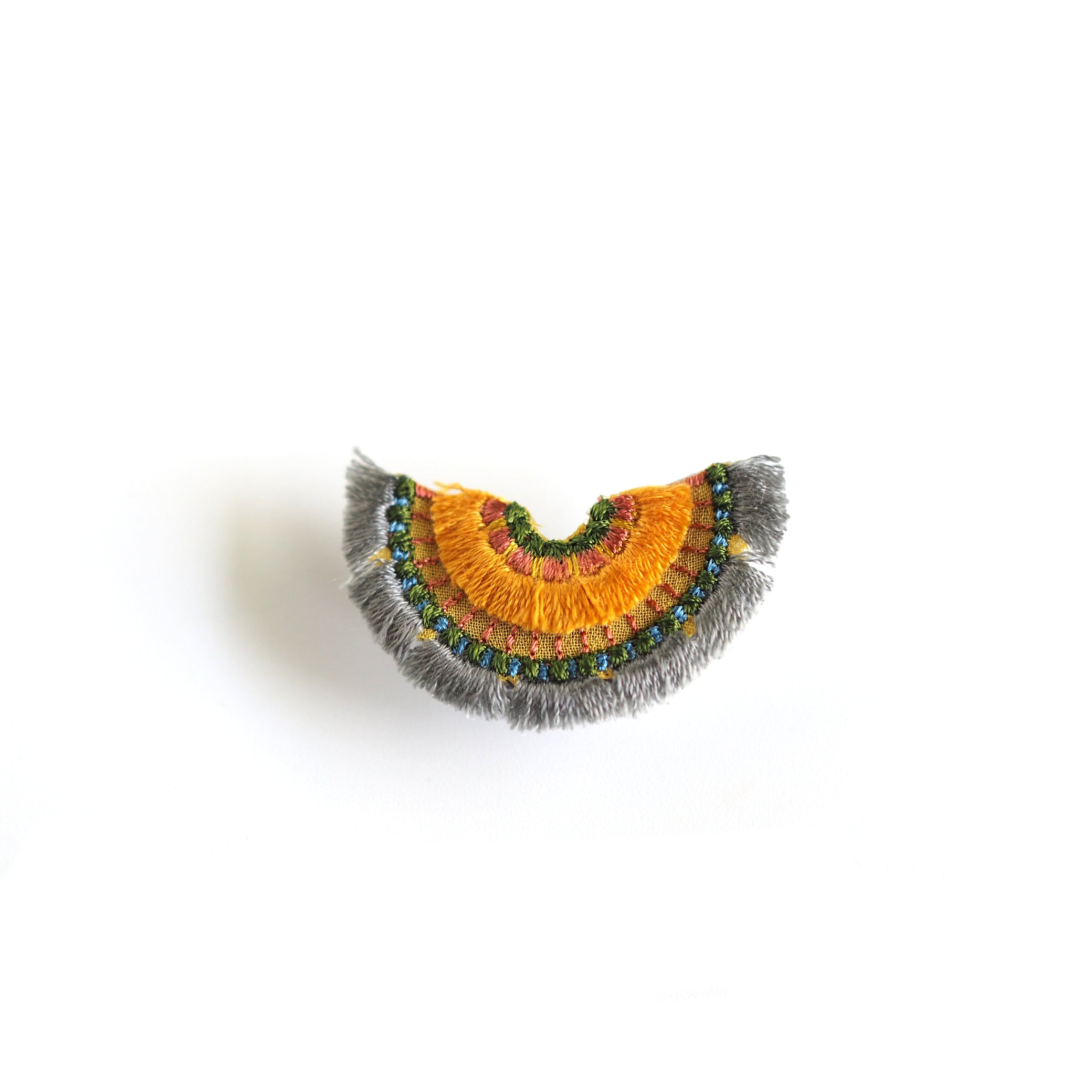 熱帯のお花にインスピレーションを得て、リサイクルポリエステルに刺繍をしています。さらにパーツを重ね合わせ立体感を持たせました。