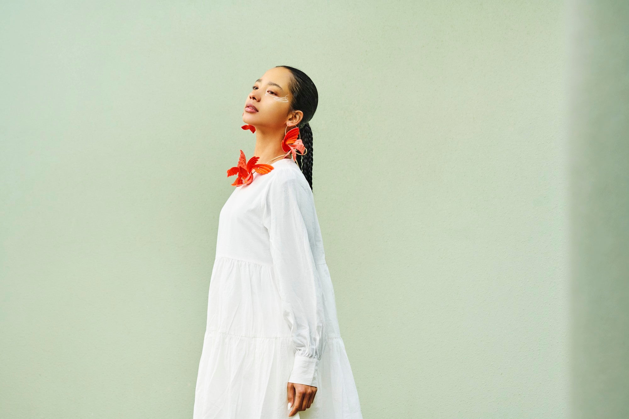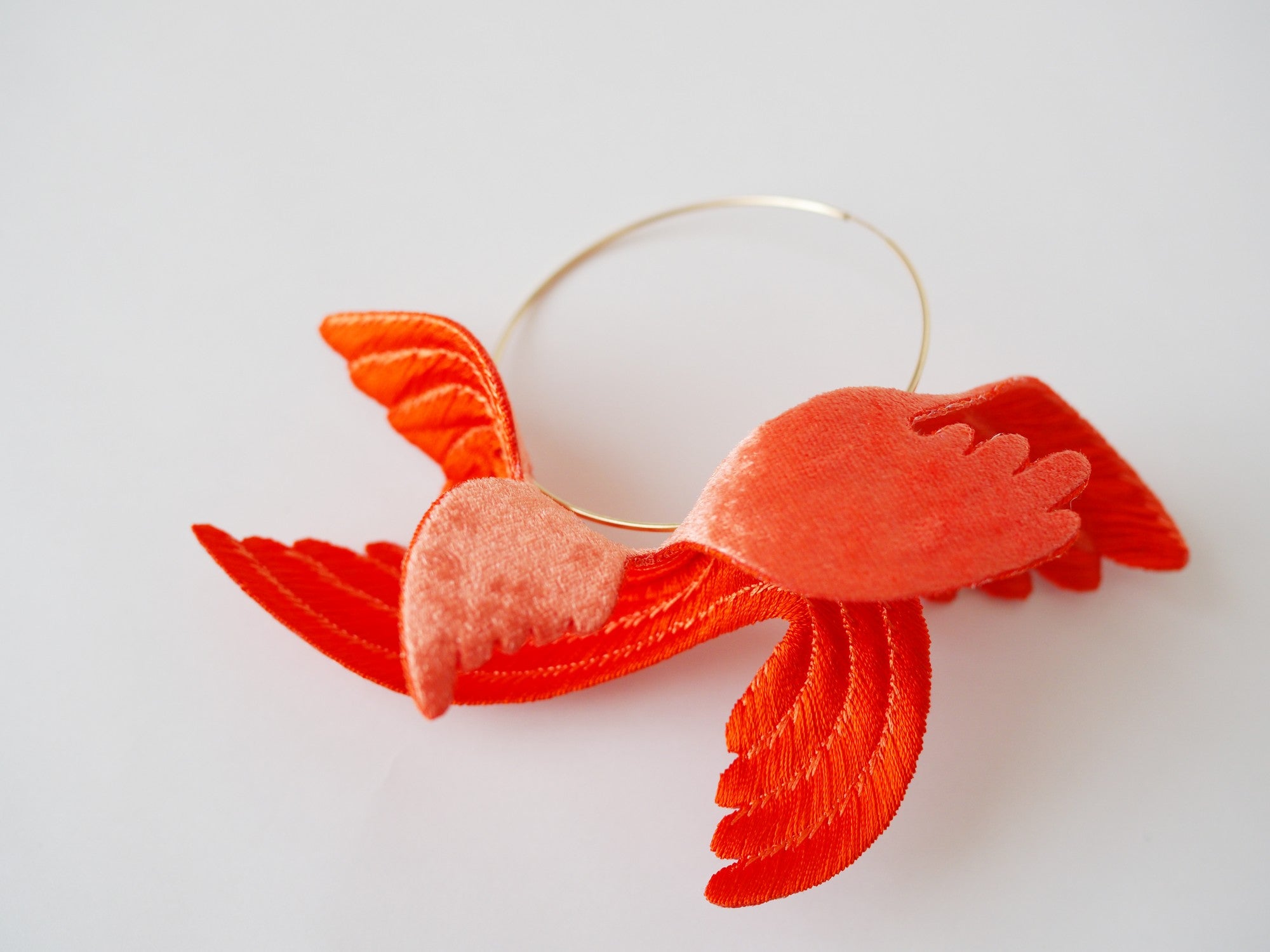 刺繍を施した一枚の平面的なパーツに折り目を加えることで、鳥が羽ばたいているような立体感と動きのあるダイナミックなデザインになっています。