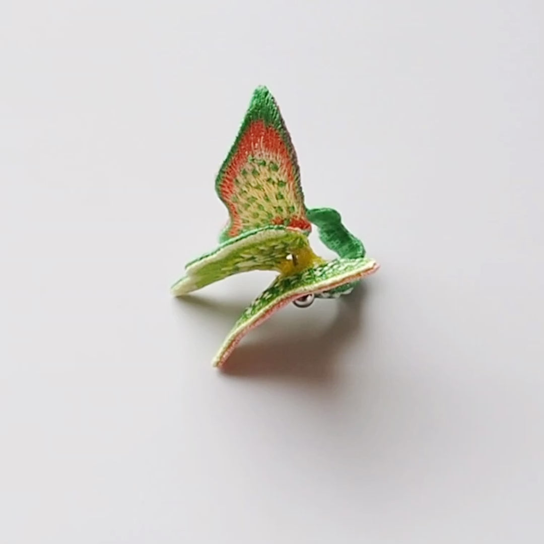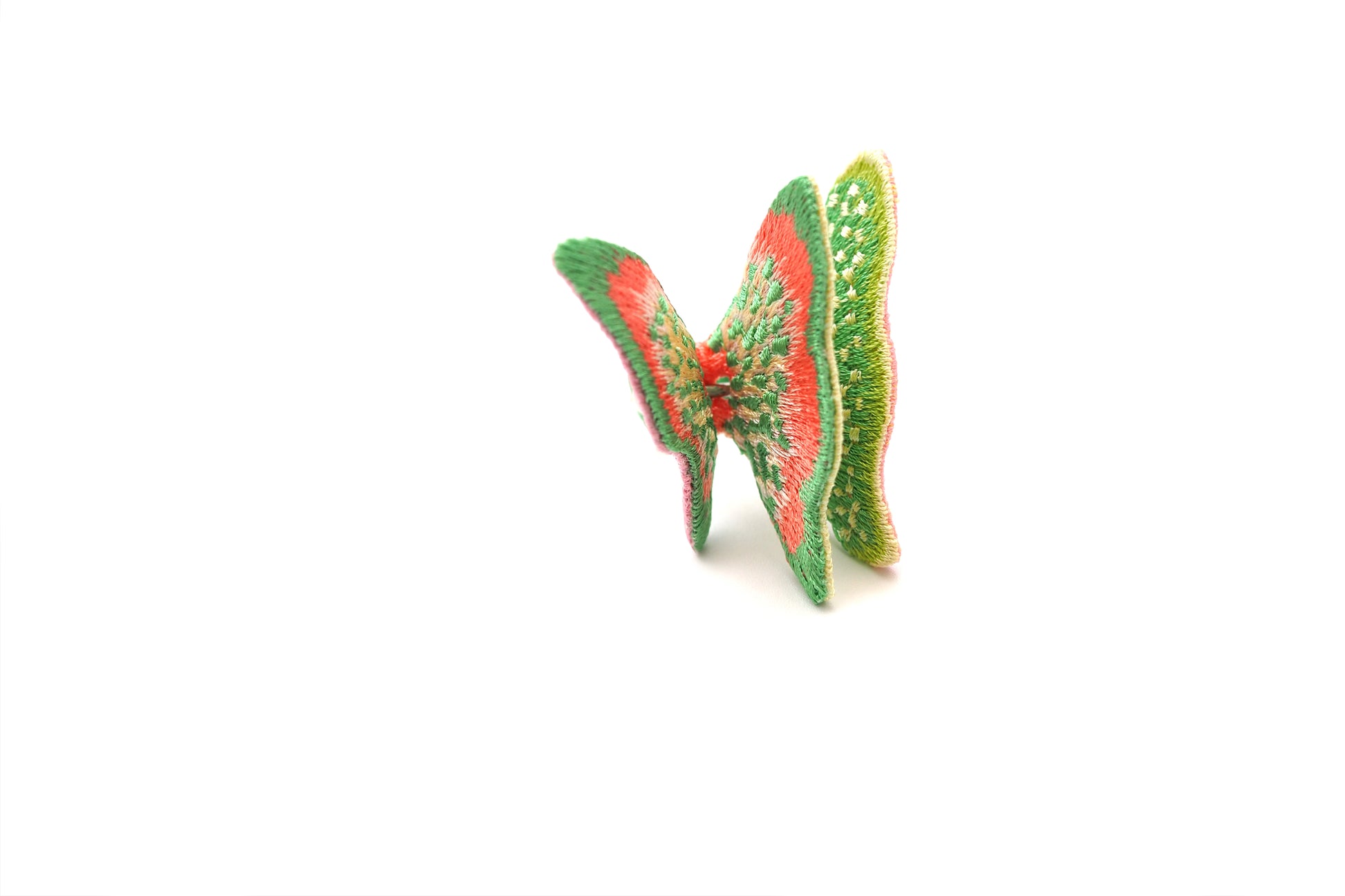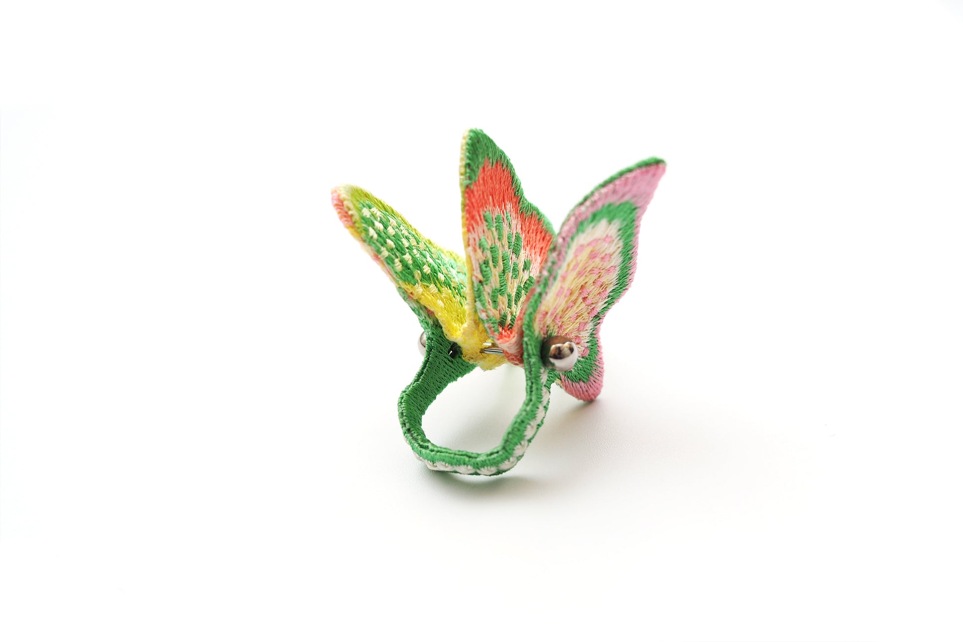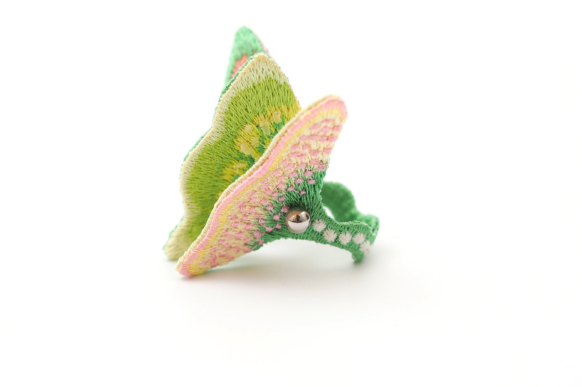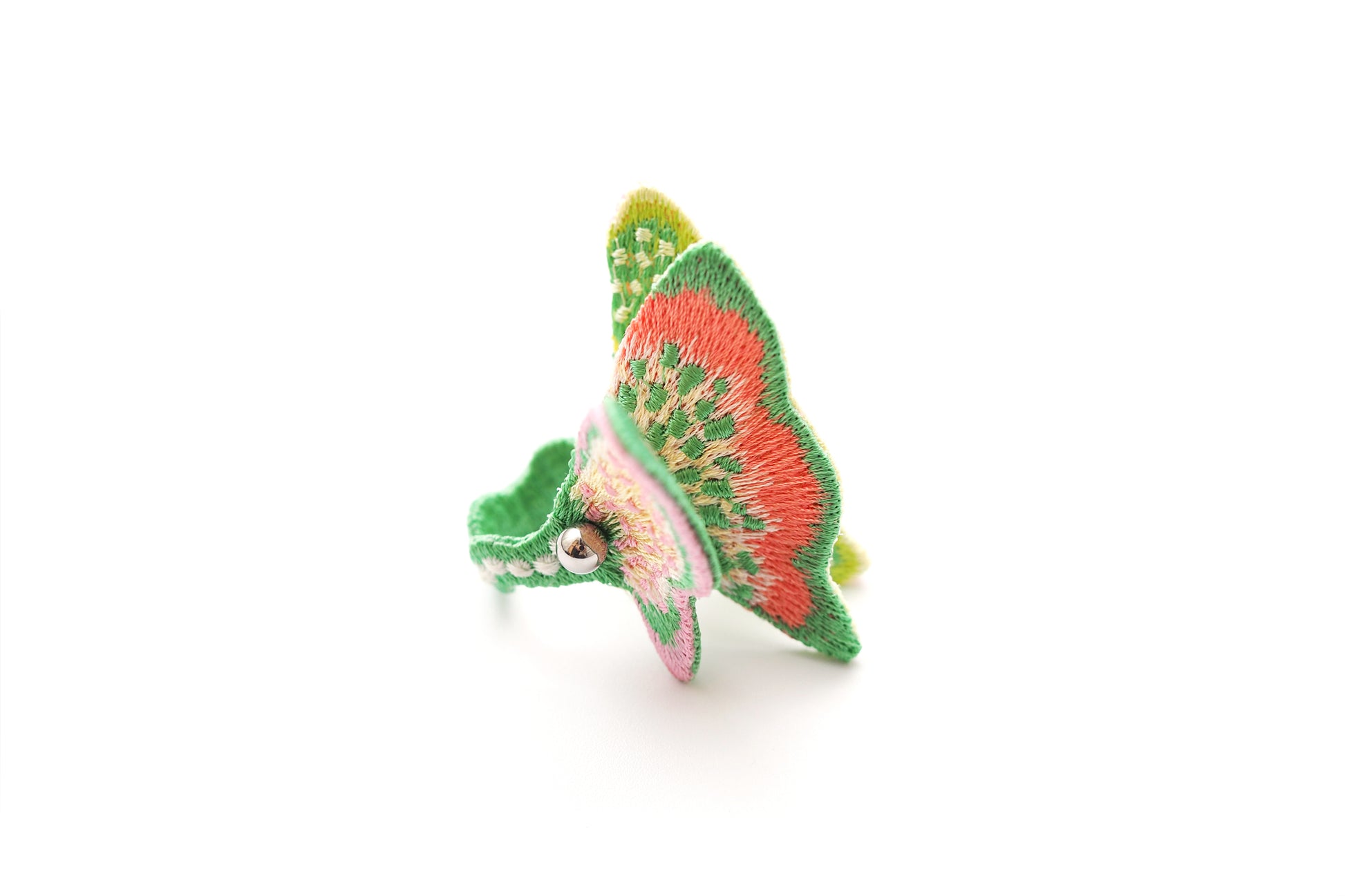 まるで蝶が指にそっと止まっているかのような繊細なデザインが特徴の刺繍リングです。羽ばたく羽の残像をイメージしたデザインで、見る角度によって様々な表情が楽しめます。