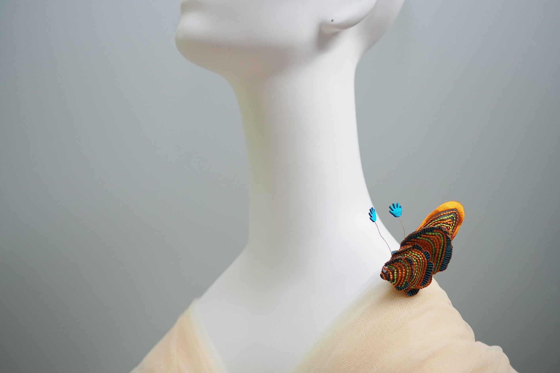 貝と妖精の手をモチーフに表現。刺繍を施したオーガンジーの透け感と、丸みのあるフォルムをお楽しみいただけるジュエリーです。