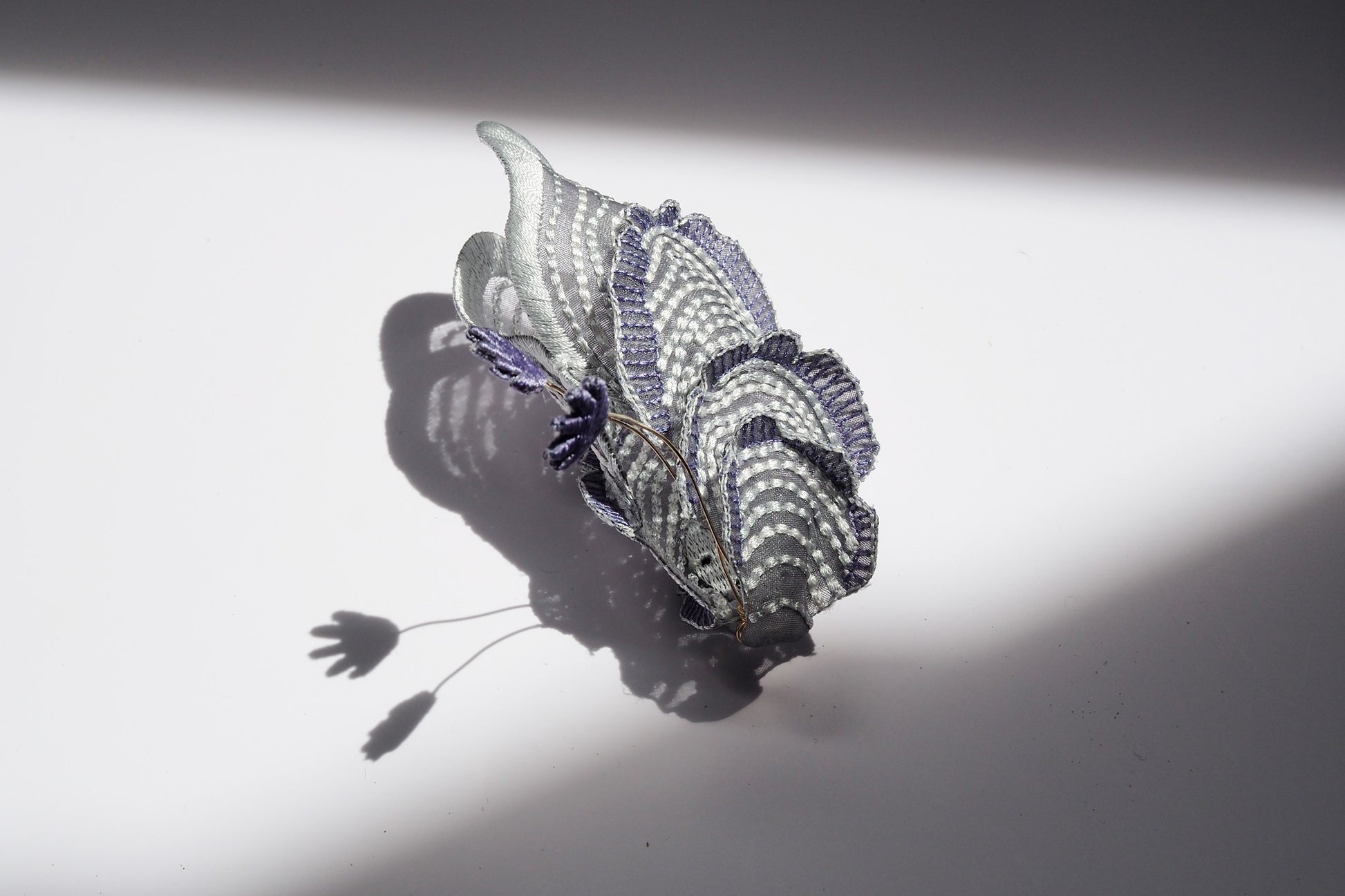 貝と妖精の手をモチーフに表現。刺繍を施したオーガンジーの透け感と、丸みのあるフォルムをお楽しみいただけるジュエリーです。