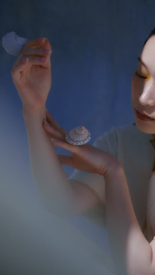 貝と妖精の手をモチーフにしたピアス、イヤリング。新しいものが生まれる事を表現している。