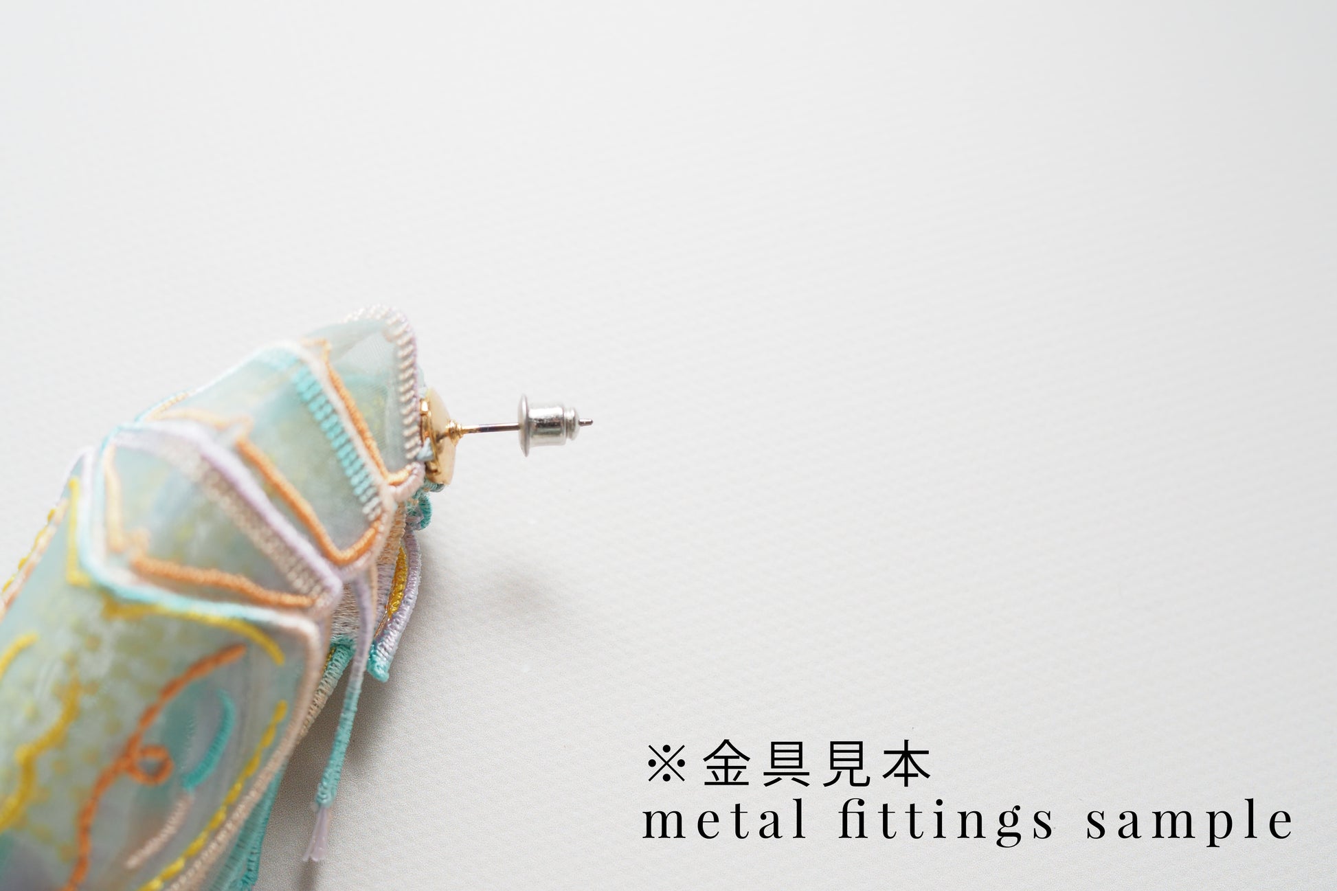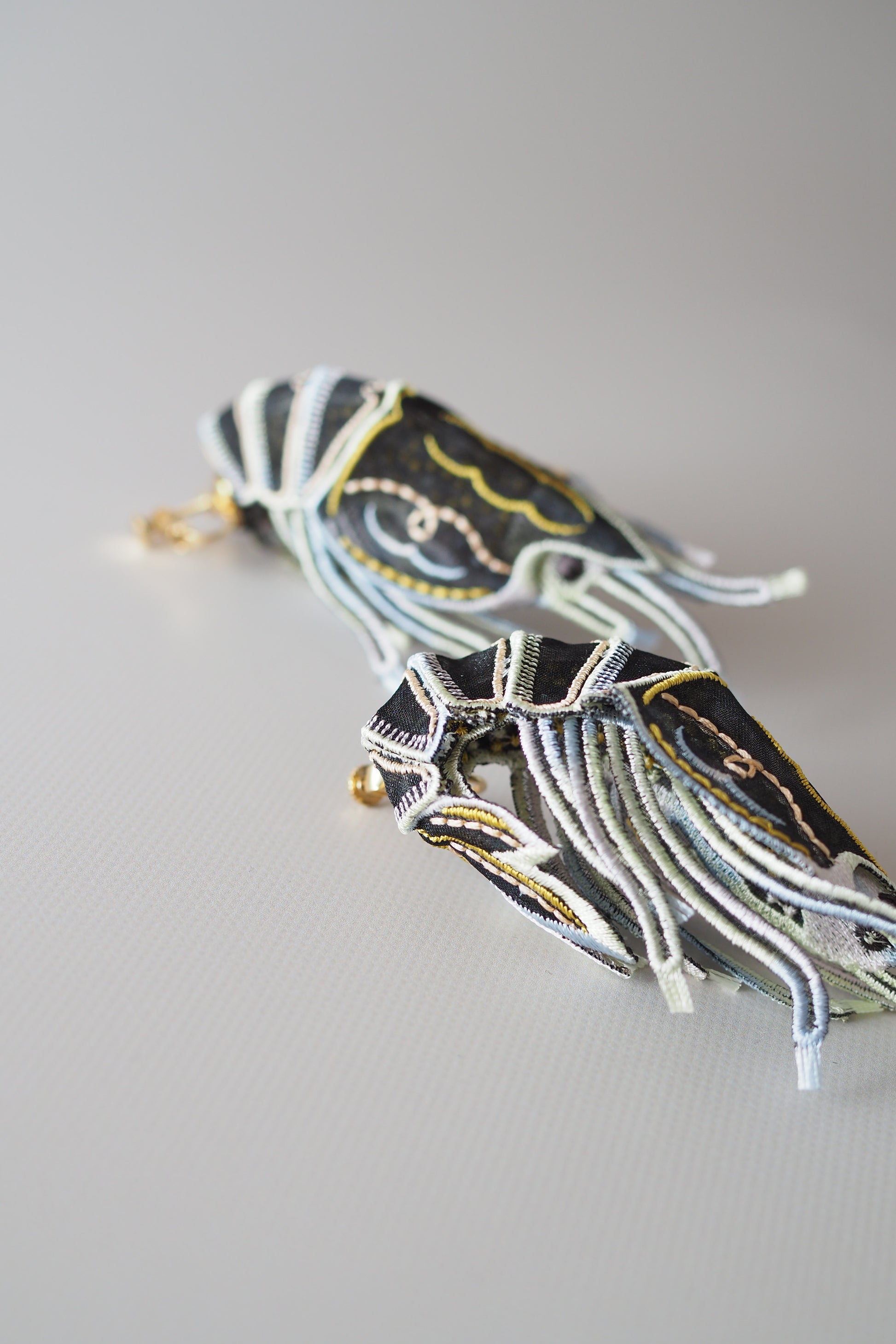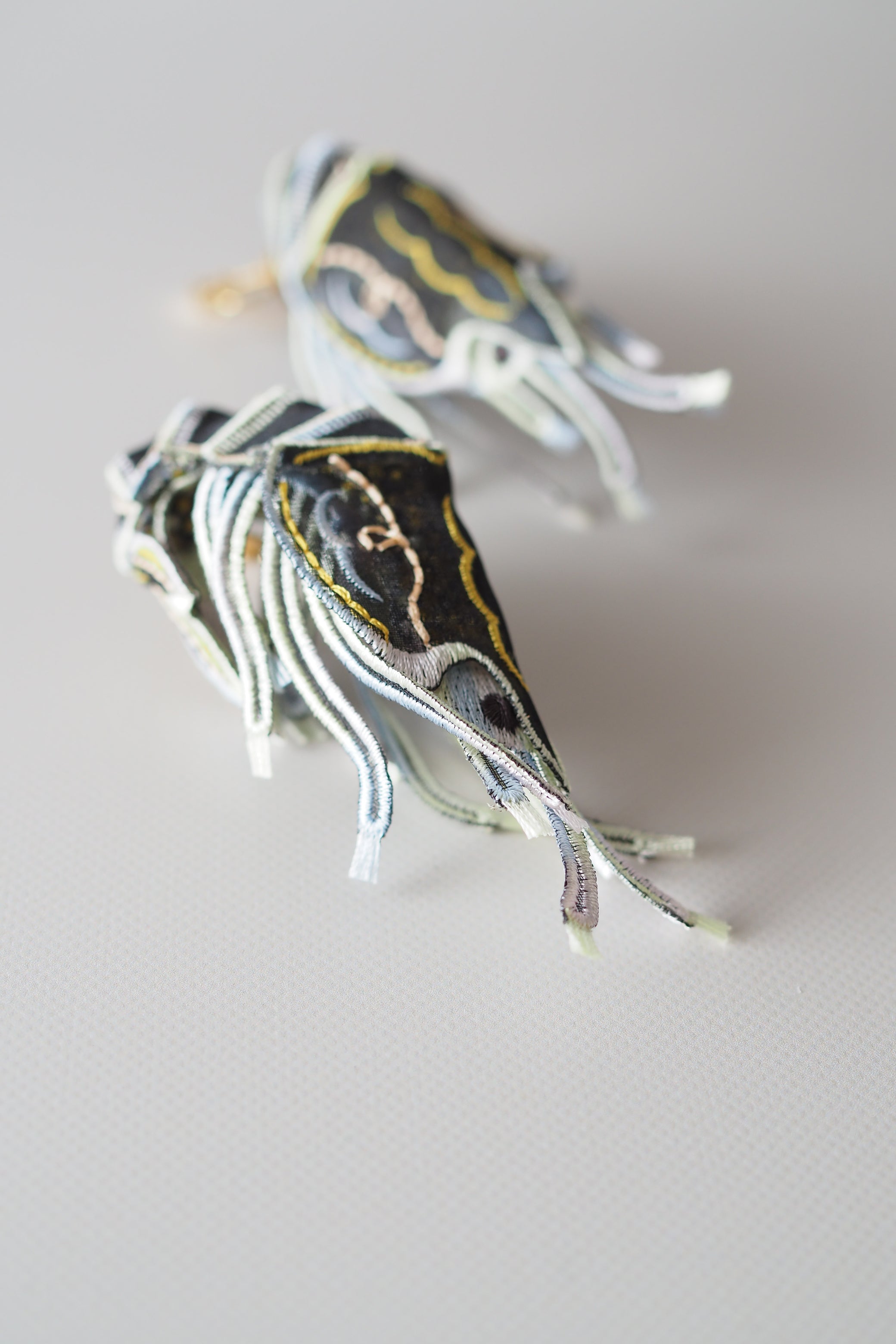 オーガンジー生地に刺繍してから輪郭に沿って裁断し、更に折り紙のように折りたたんで立体感を出している。