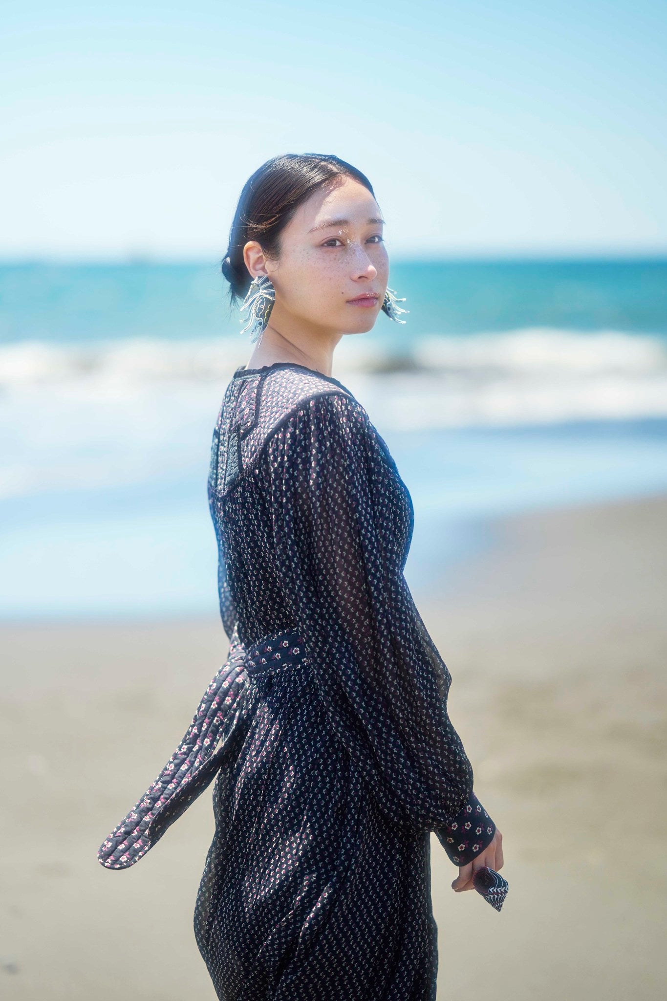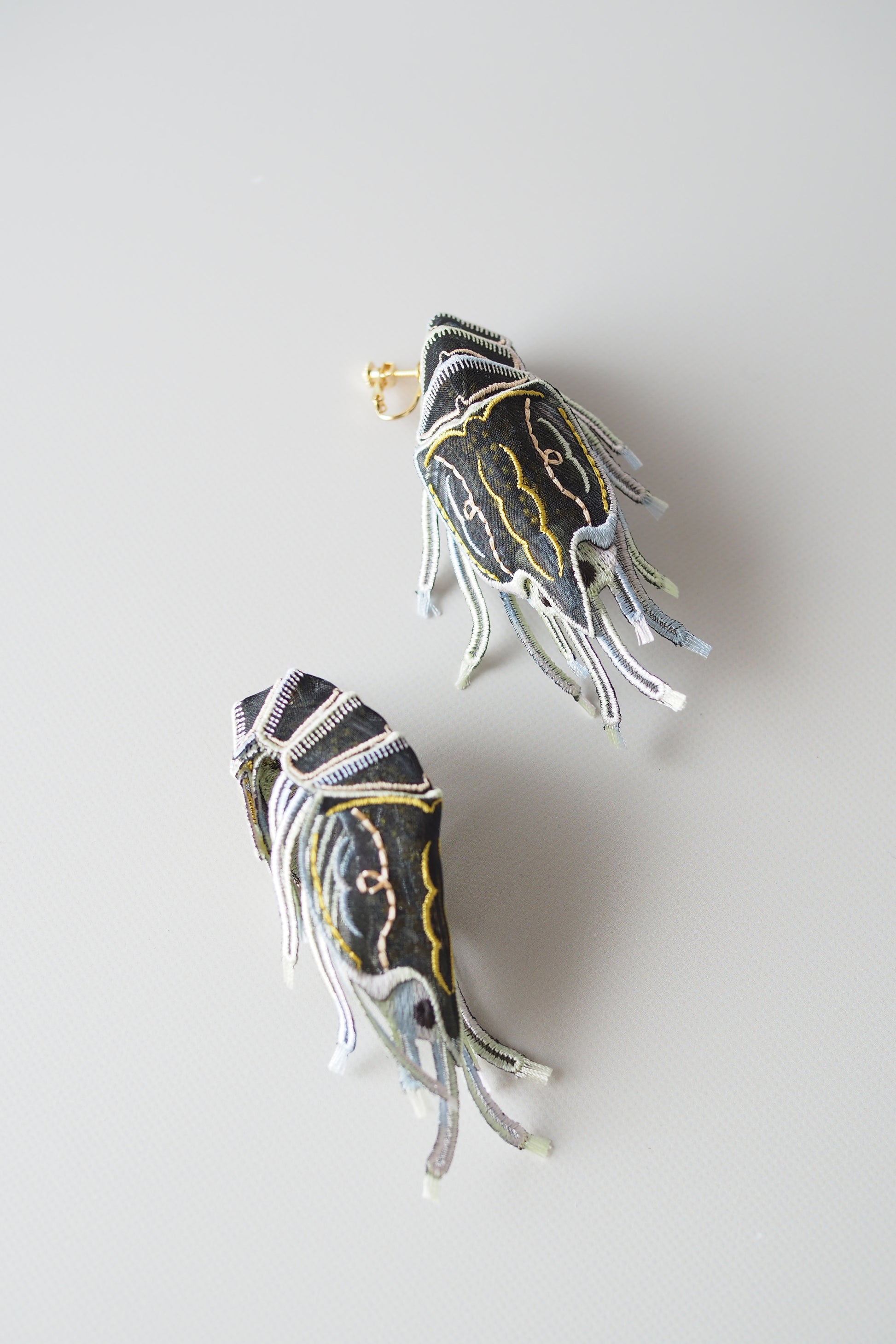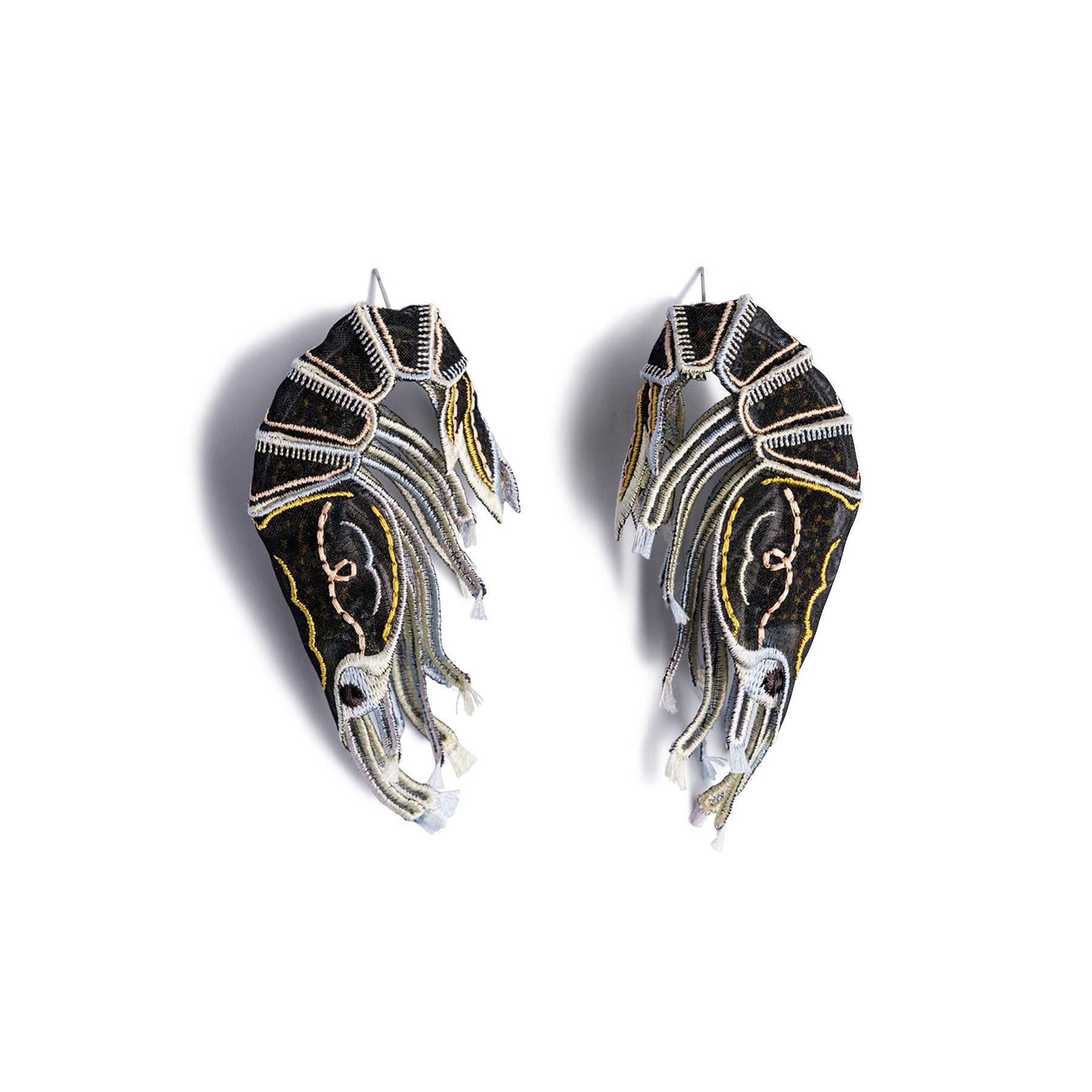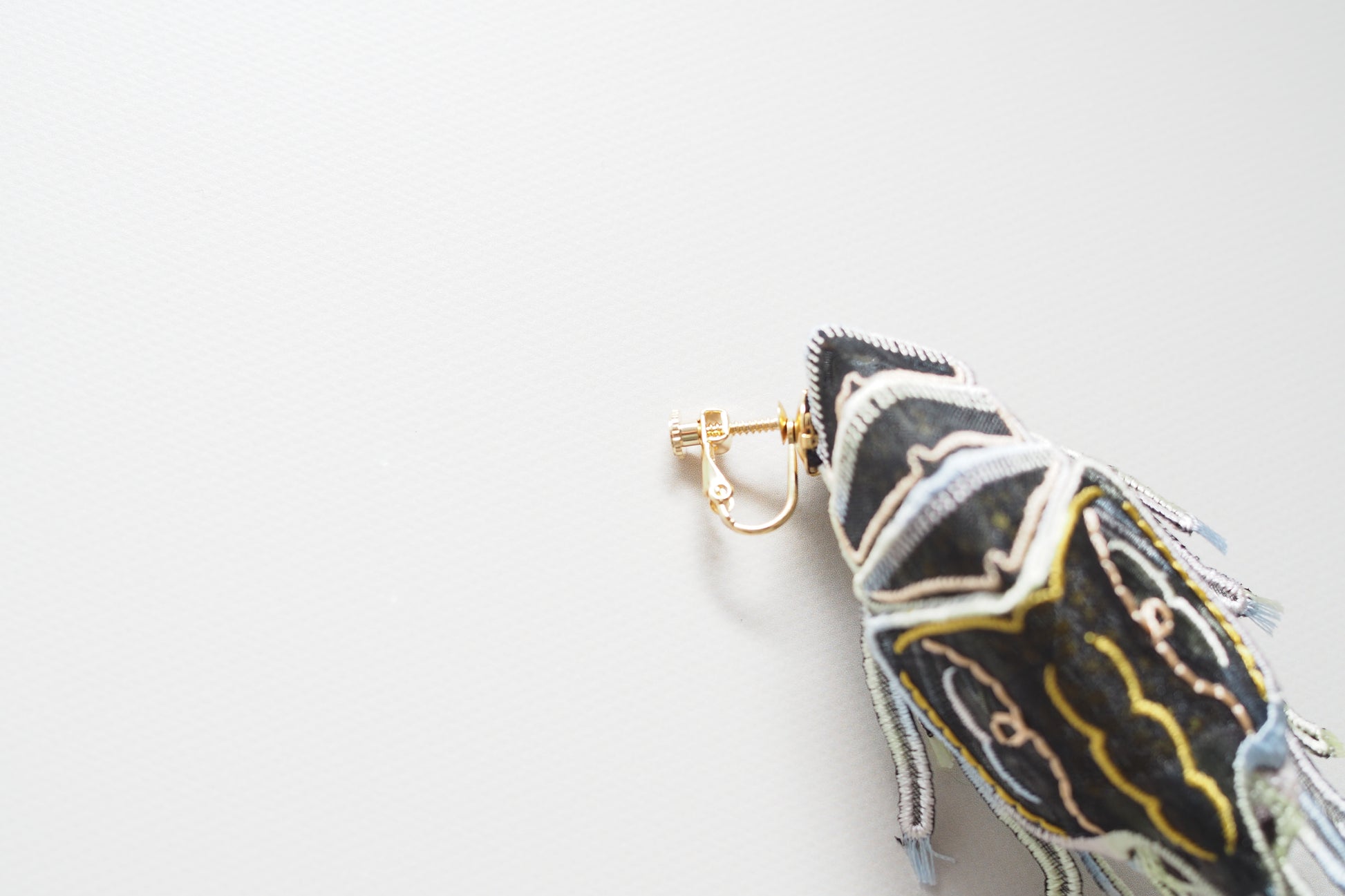 オーガンジー生地に刺繍してから輪郭に沿って裁断し、更に折り紙のように折りたたんで立体感を出している。